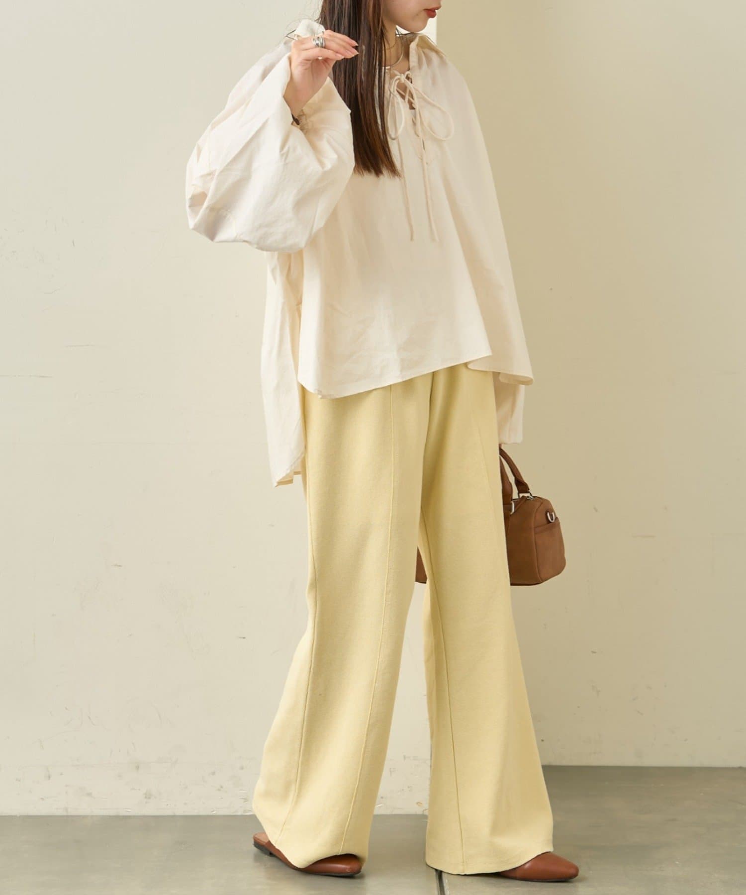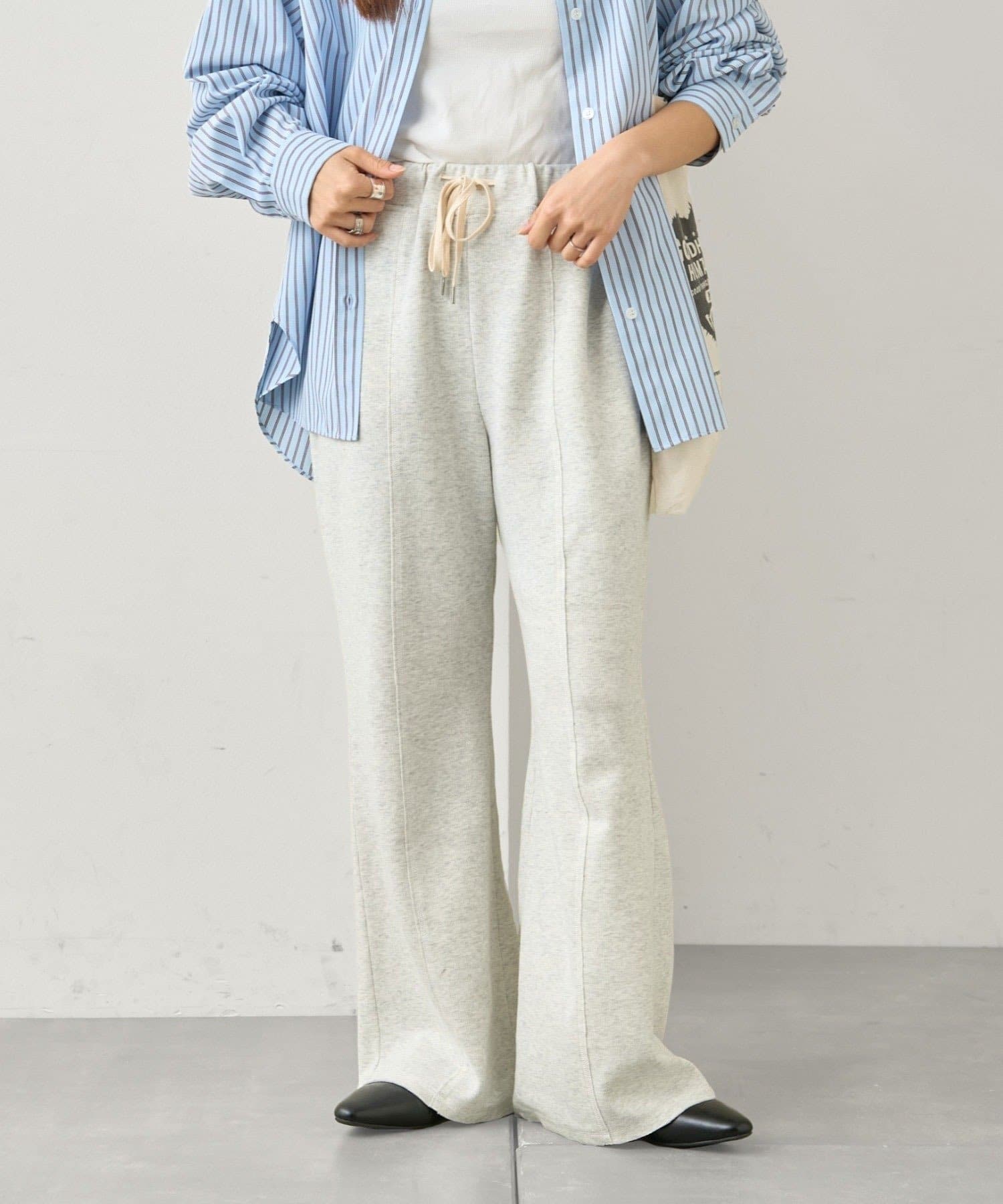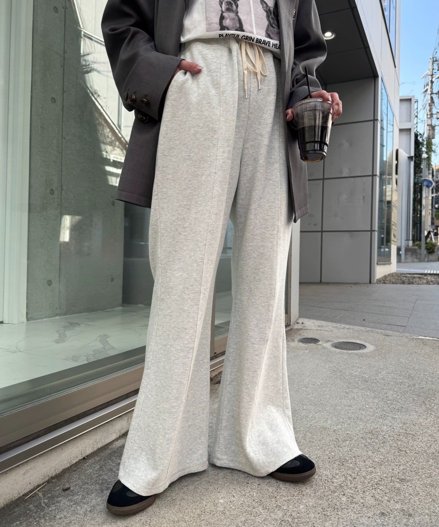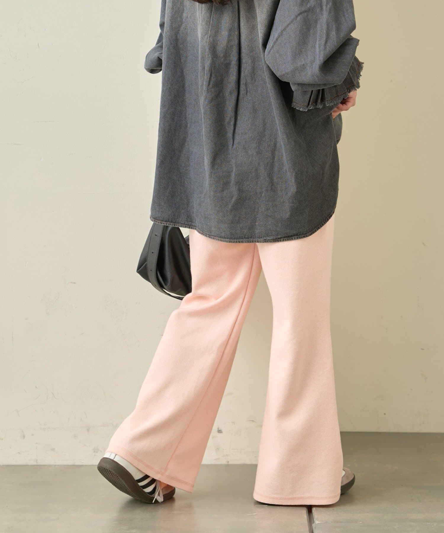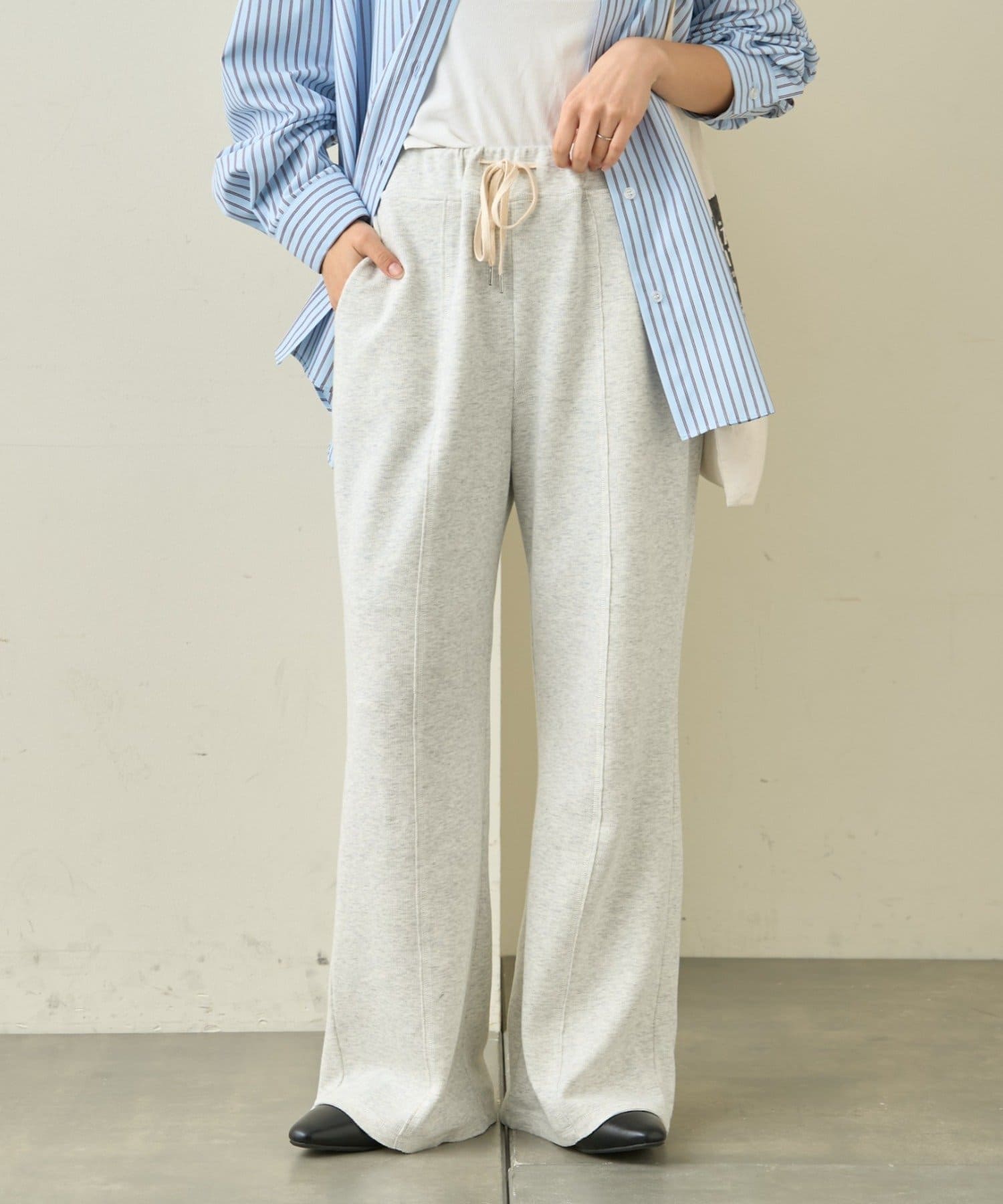 ウエストは紐付きでサイズ調整が可能な仕様。締め付け感が少なく、長時間の着用でもストレスを感じにくいのが魅力です。太ももまわりはゆったりとしつつ、裾に向かって自然に広がるワイドフレアシルエットで、気になる下半身をさりげなくカバー。センター部分の切り替えデザインが縦ラインを演出し、脚をまっすぐ長く見せてくれます。