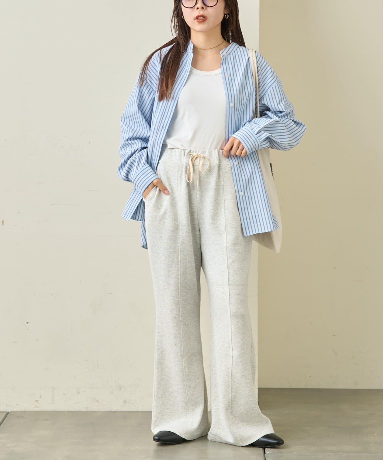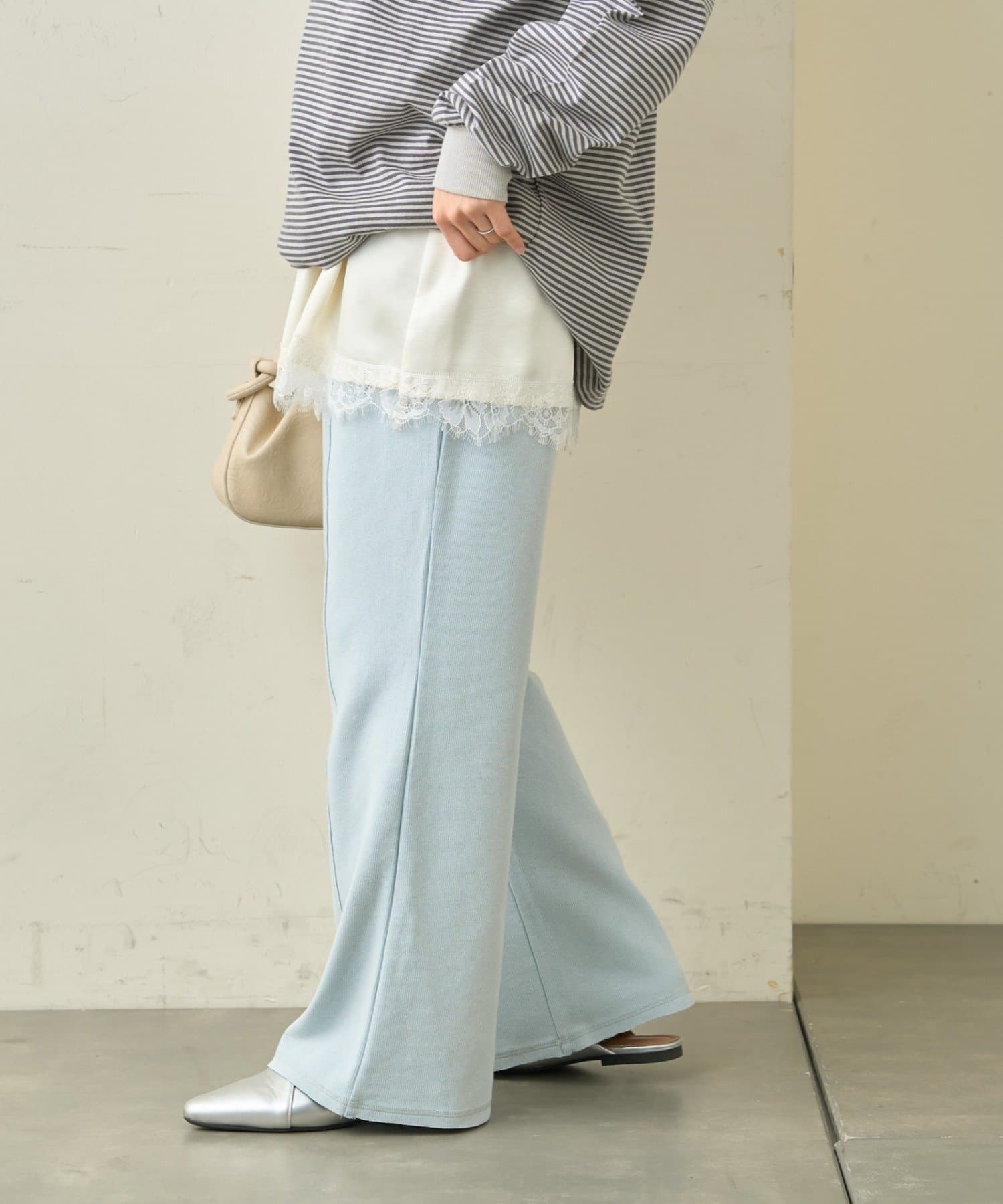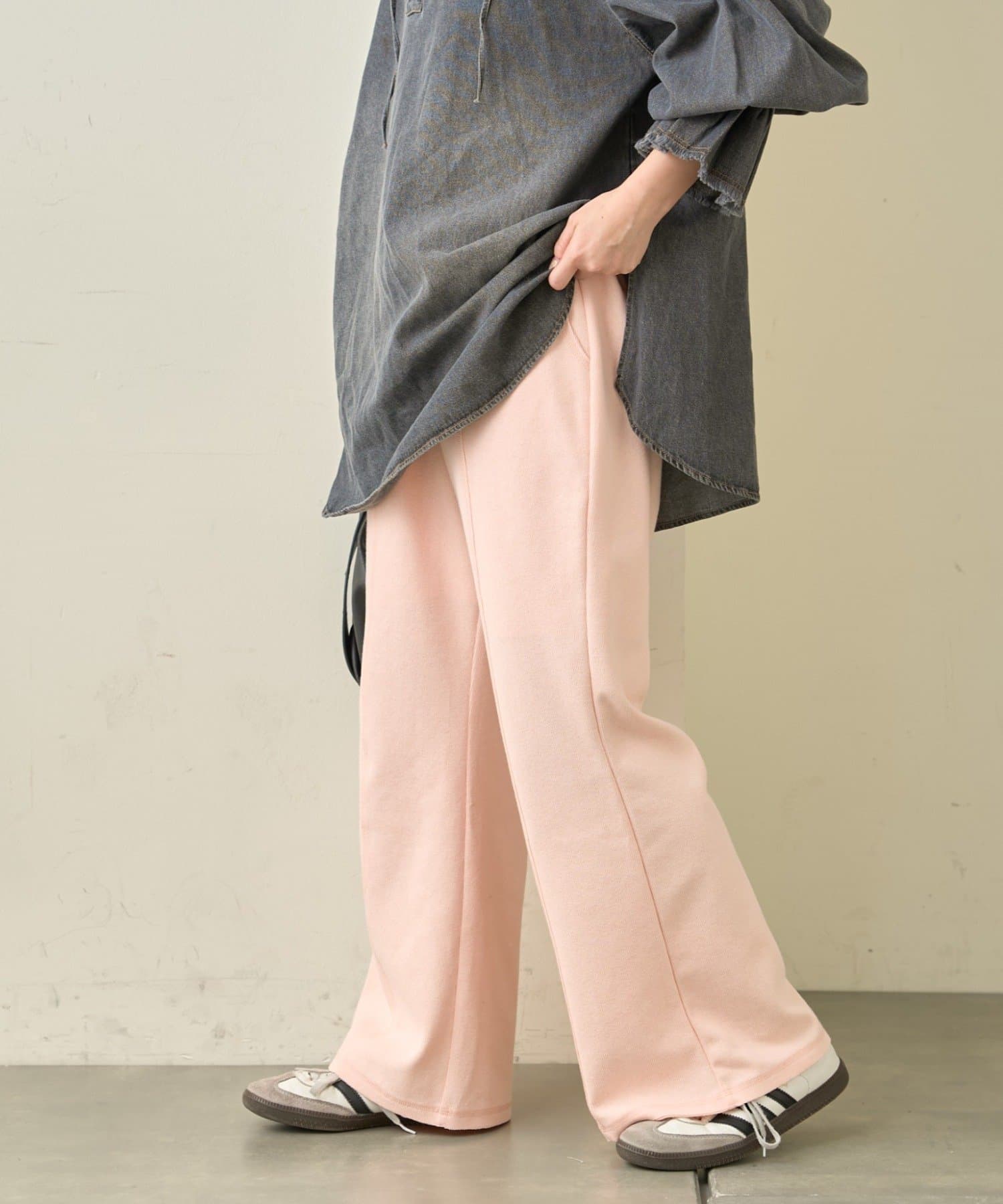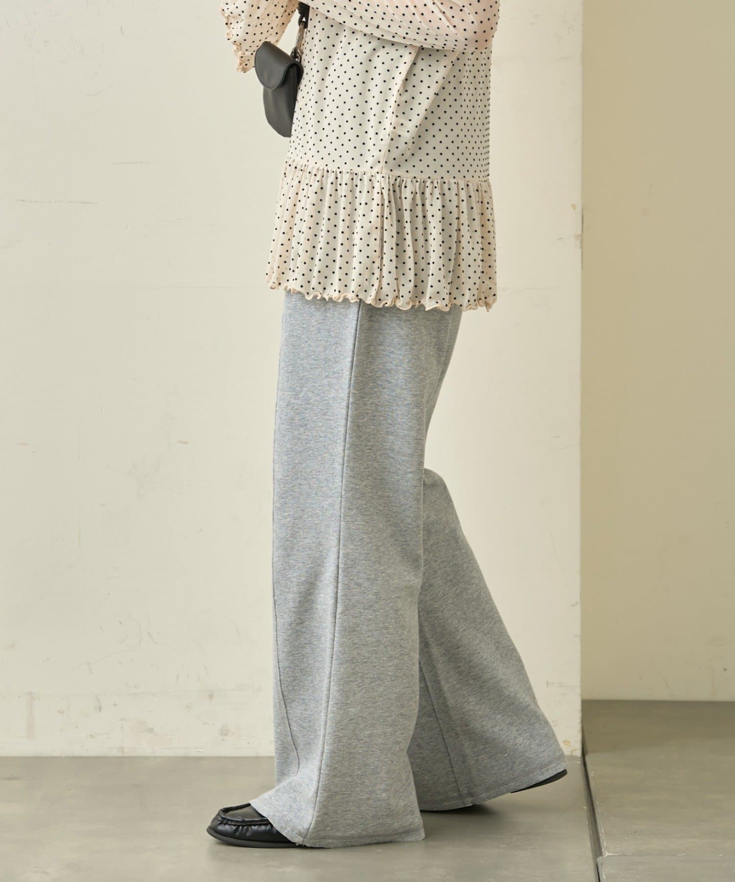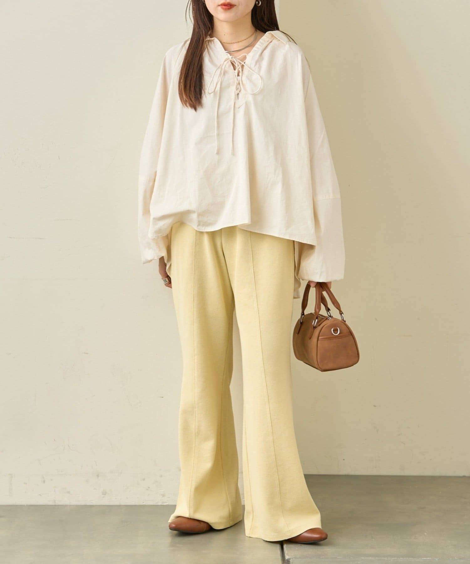 ウエストは紐付きでサイズ調整が可能な仕様。締め付け感が少なく、長時間の着用でもストレスを感じにくいのが魅力です。太ももまわりはゆったりとしつつ、裾に向かって自然に広がるワイドフレアシルエットで、気になる下半身をさりげなくカバー。センター部分の切り替えデザインが縦ラインを演出し、脚をまっすぐ長く見せてくれます。