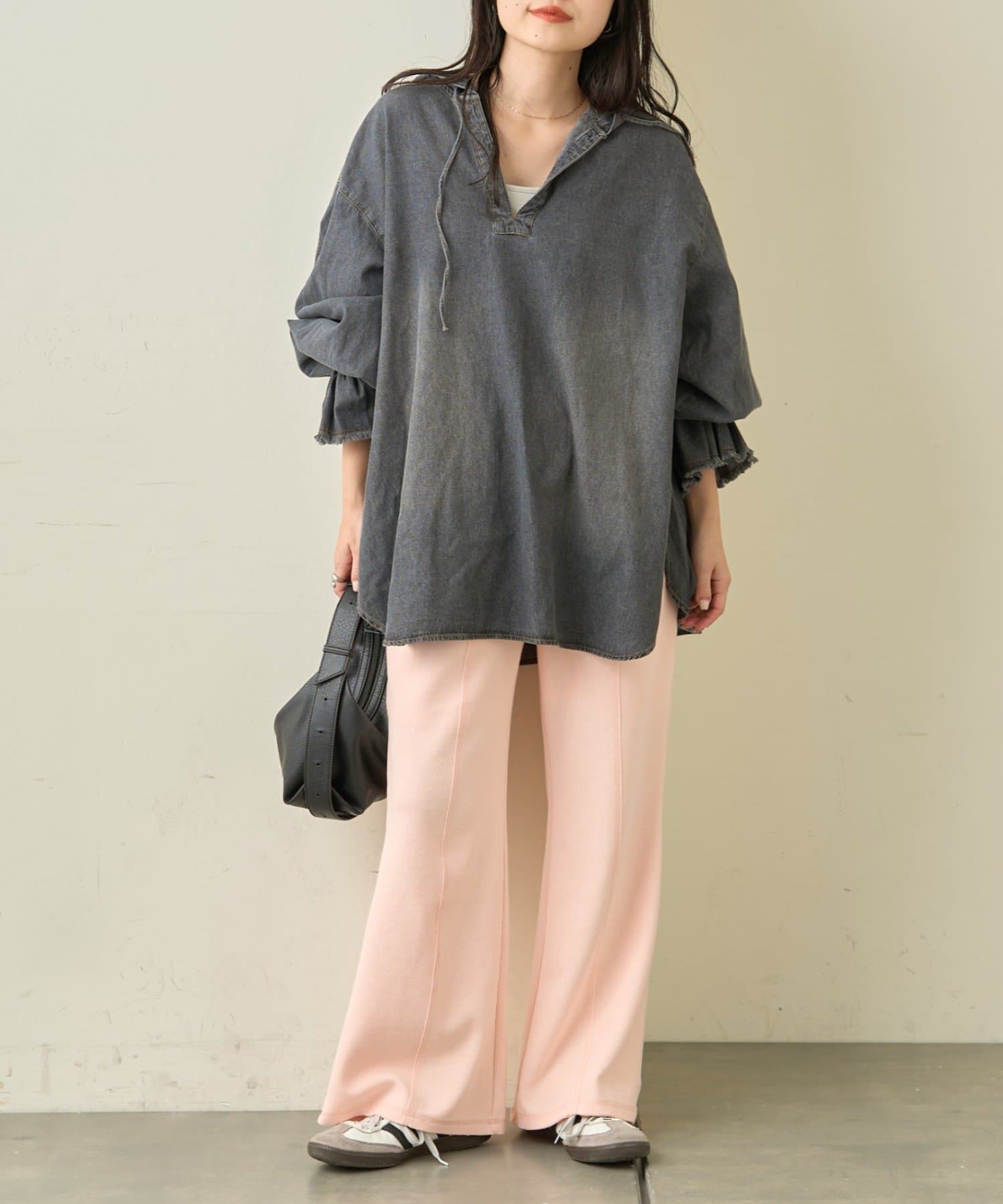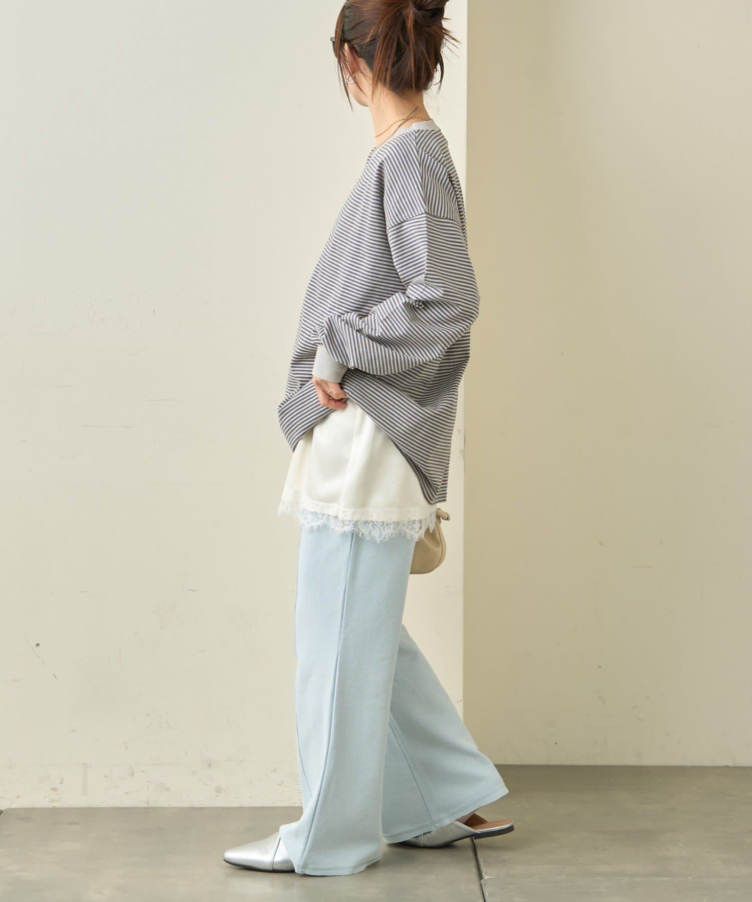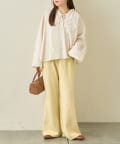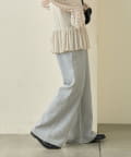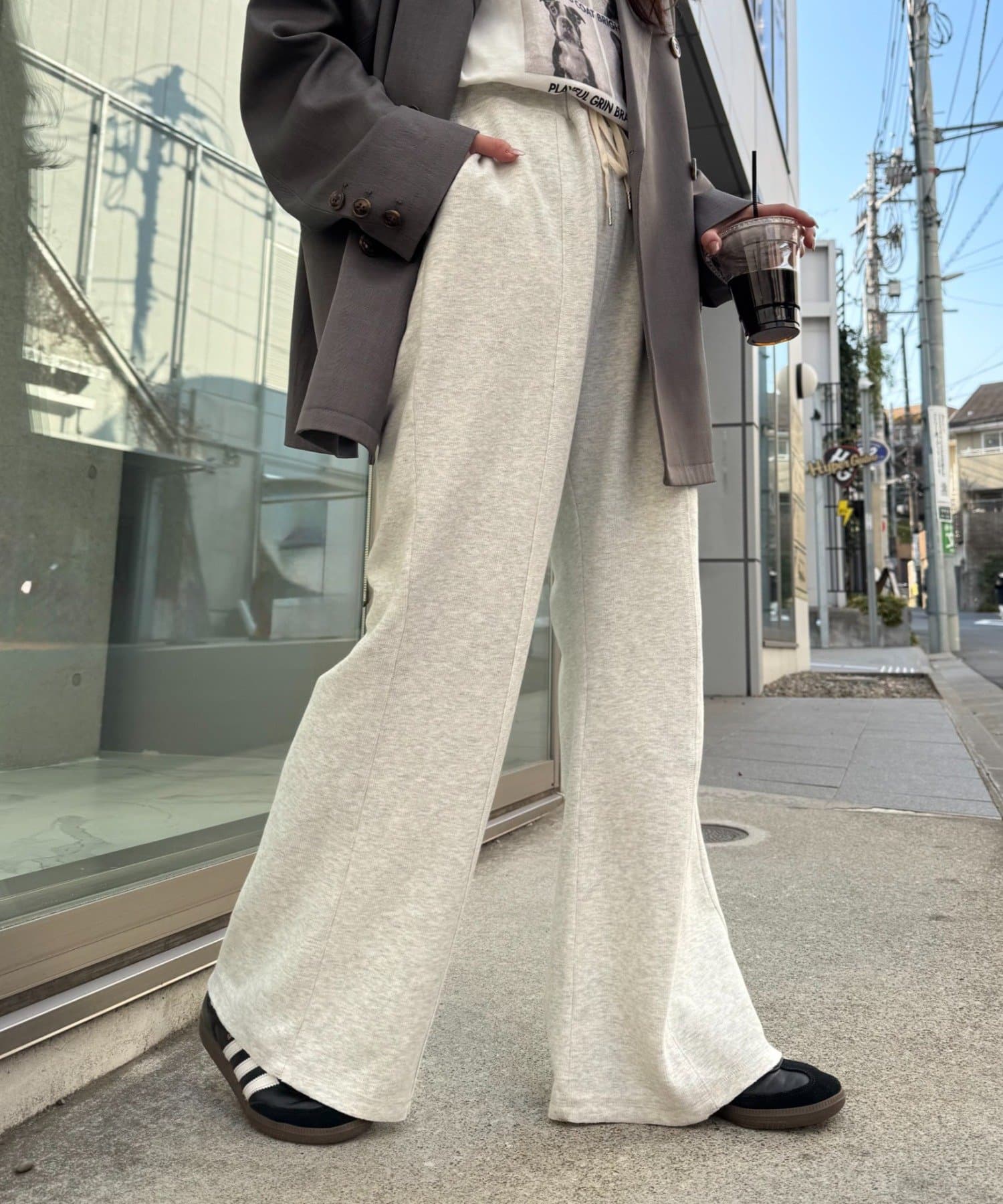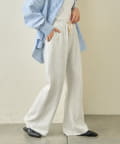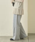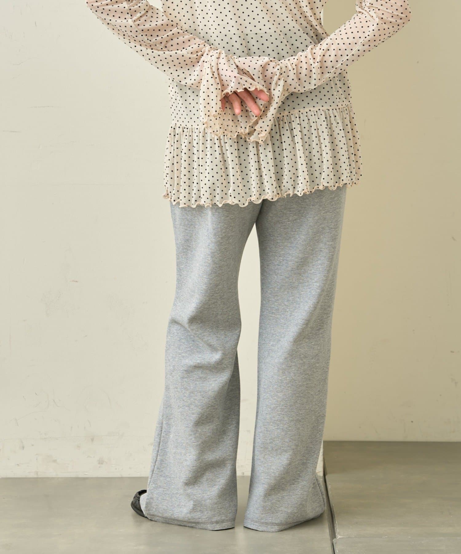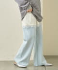 ウエストは紐付きでサイズ調整が可能な仕様。締め付け感が少なく、長時間の着用でもストレスを感じにくいのが魅力です。太ももまわりはゆったりとしつつ、裾に向かって自然に広がるワイドフレアシルエットで、気になる下半身をさりげなくカバー。センター部分の切り替えデザインが縦ラインを演出し、脚をまっすぐ長く見せてくれます。