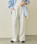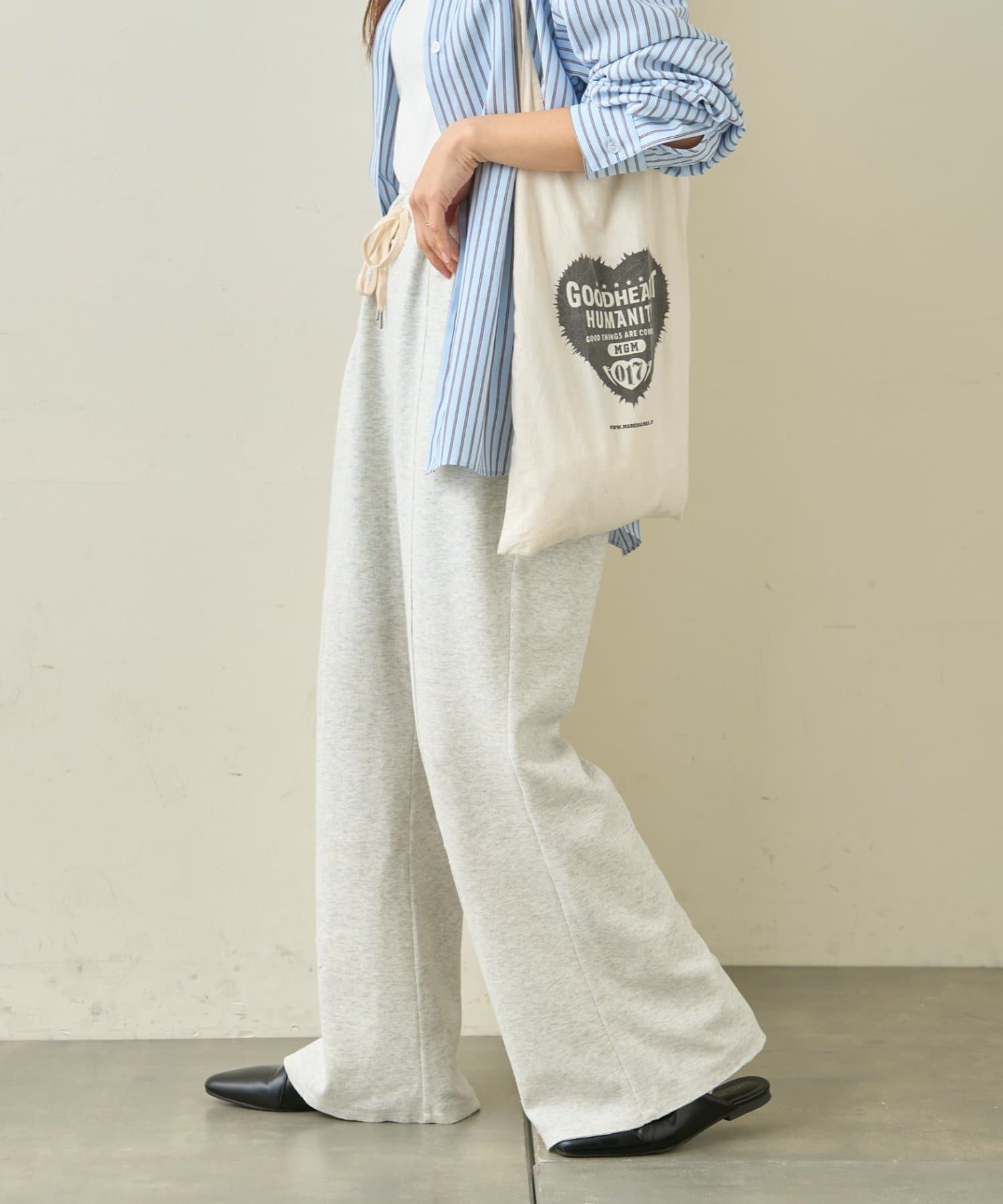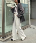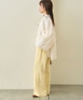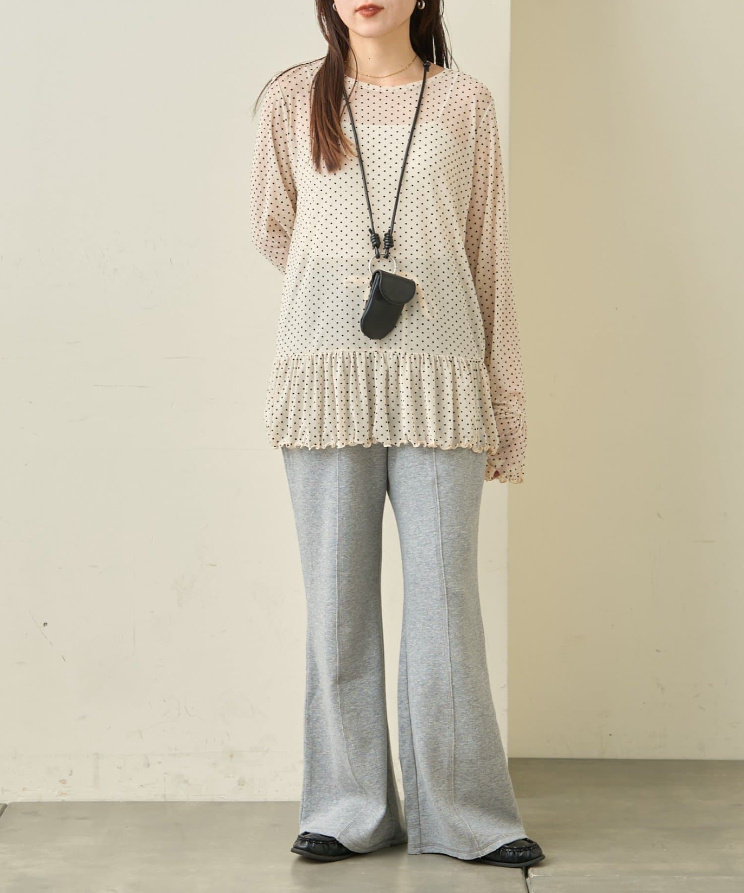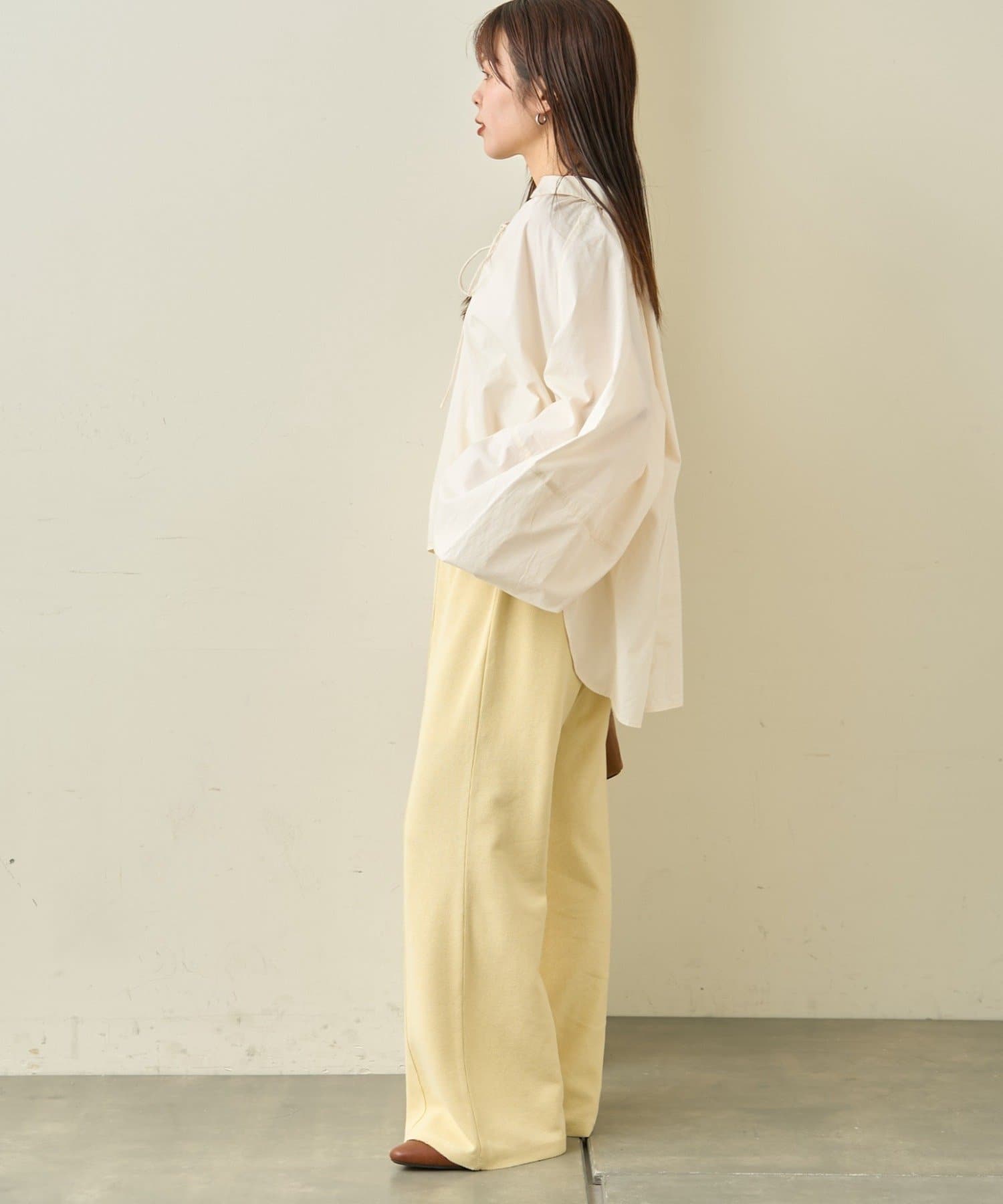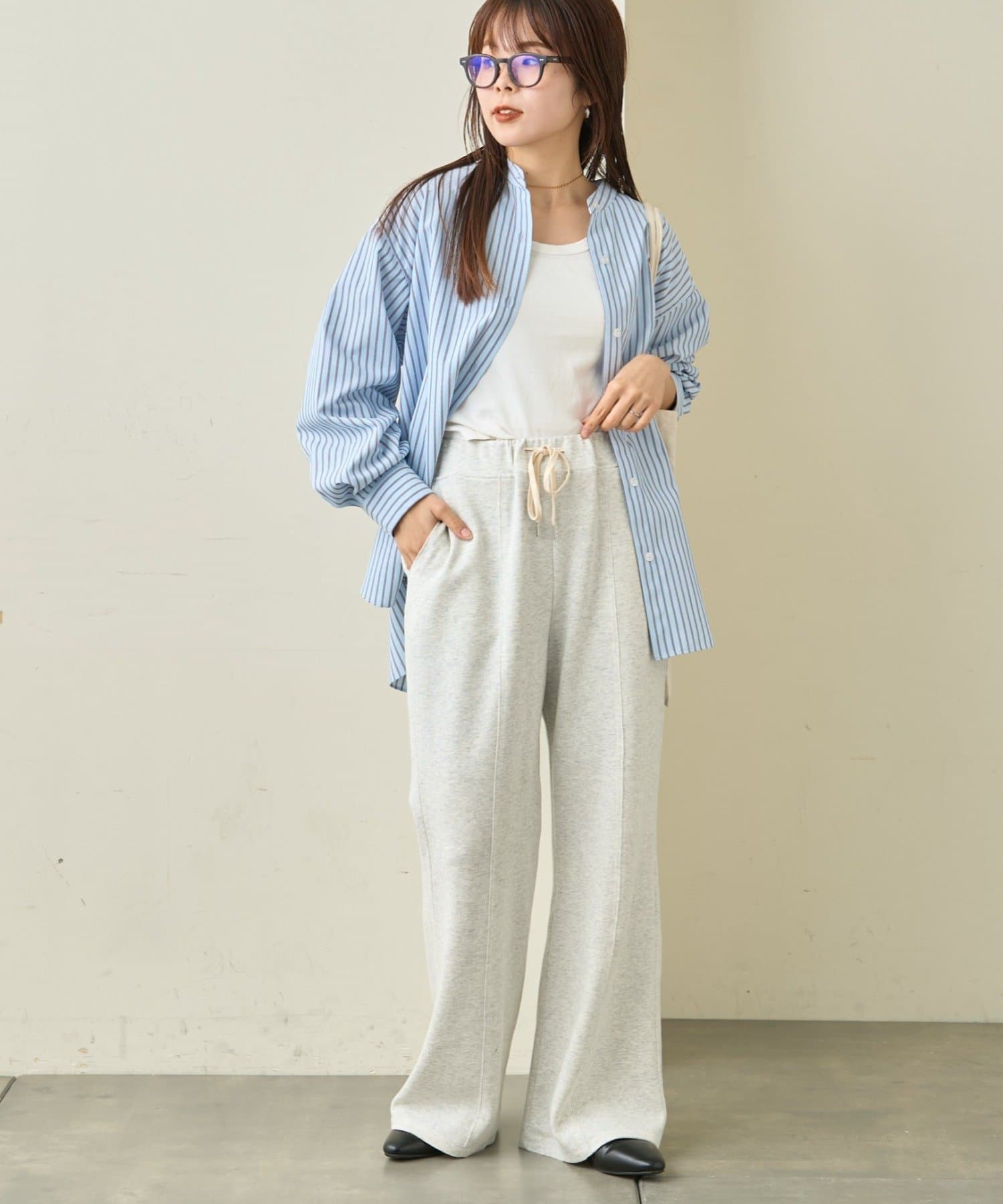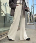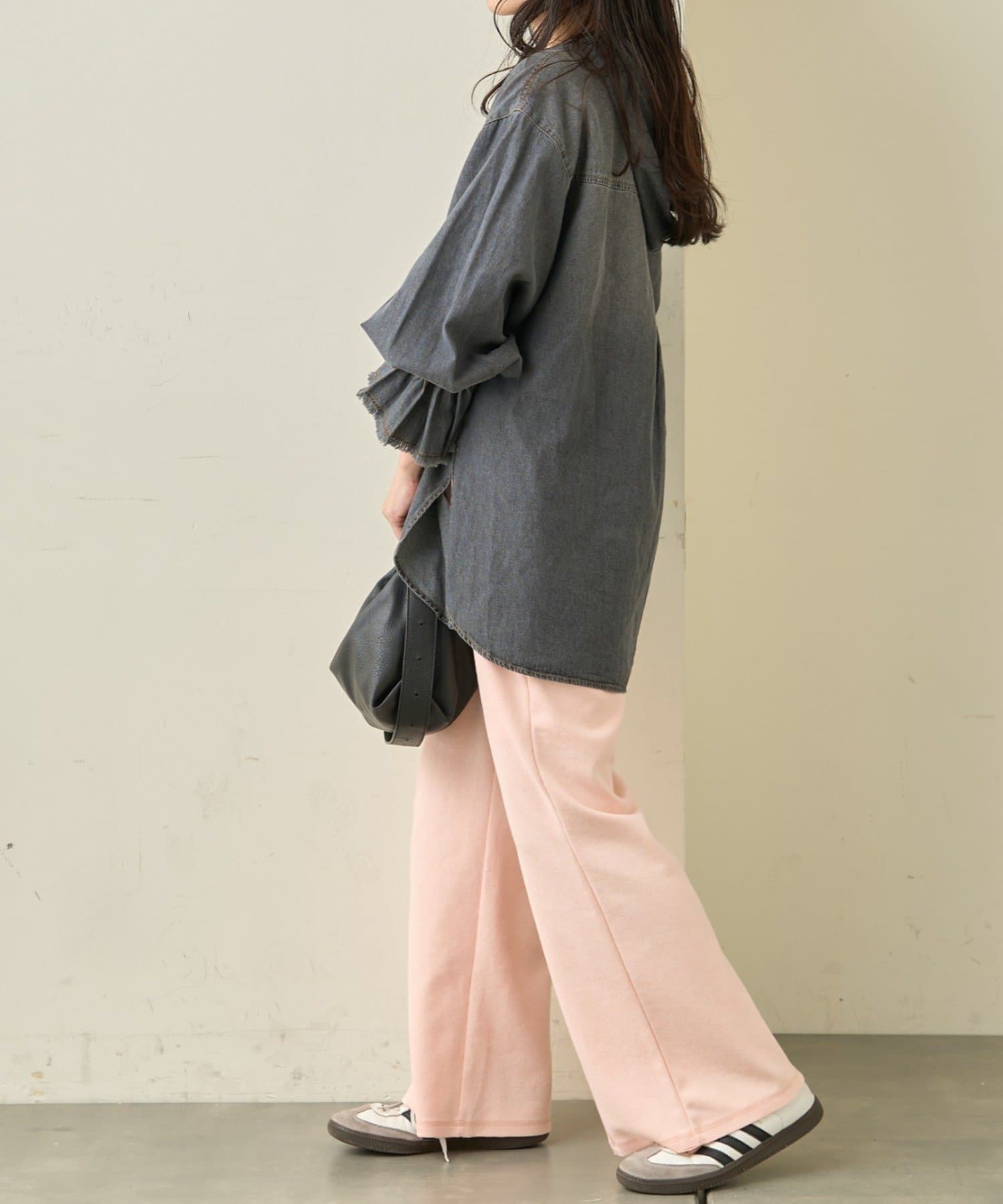 ウエストは紐付きでサイズ調整が可能な仕様。締め付け感が少なく、長時間の着用でもストレスを感じにくいのが魅力です。太ももまわりはゆったりとしつつ、裾に向かって自然に広がるワイドフレアシルエットで、気になる下半身をさりげなくカバー。センター部分の切り替えデザインが縦ラインを演出し、脚をまっすぐ長く見せてくれます。
