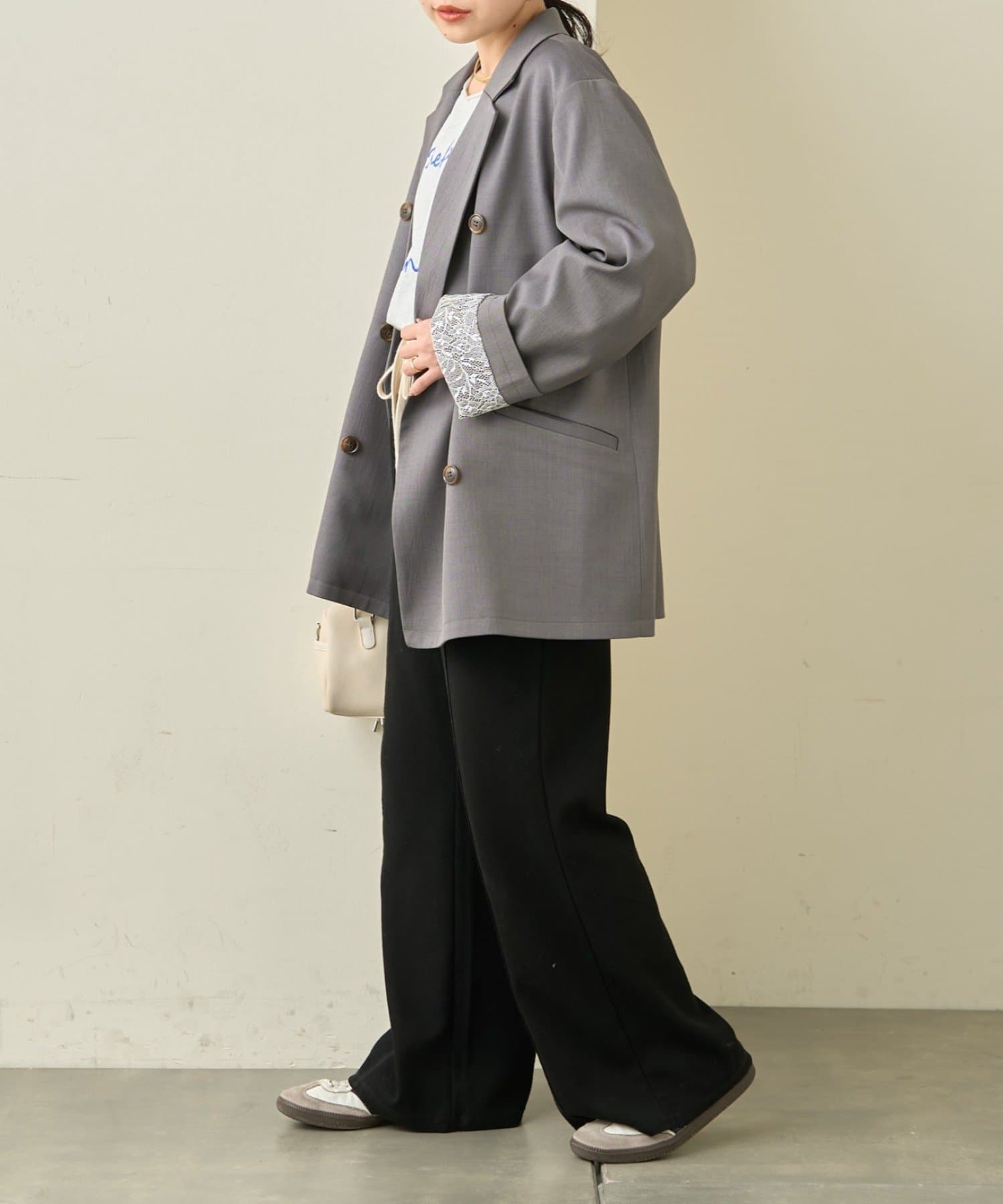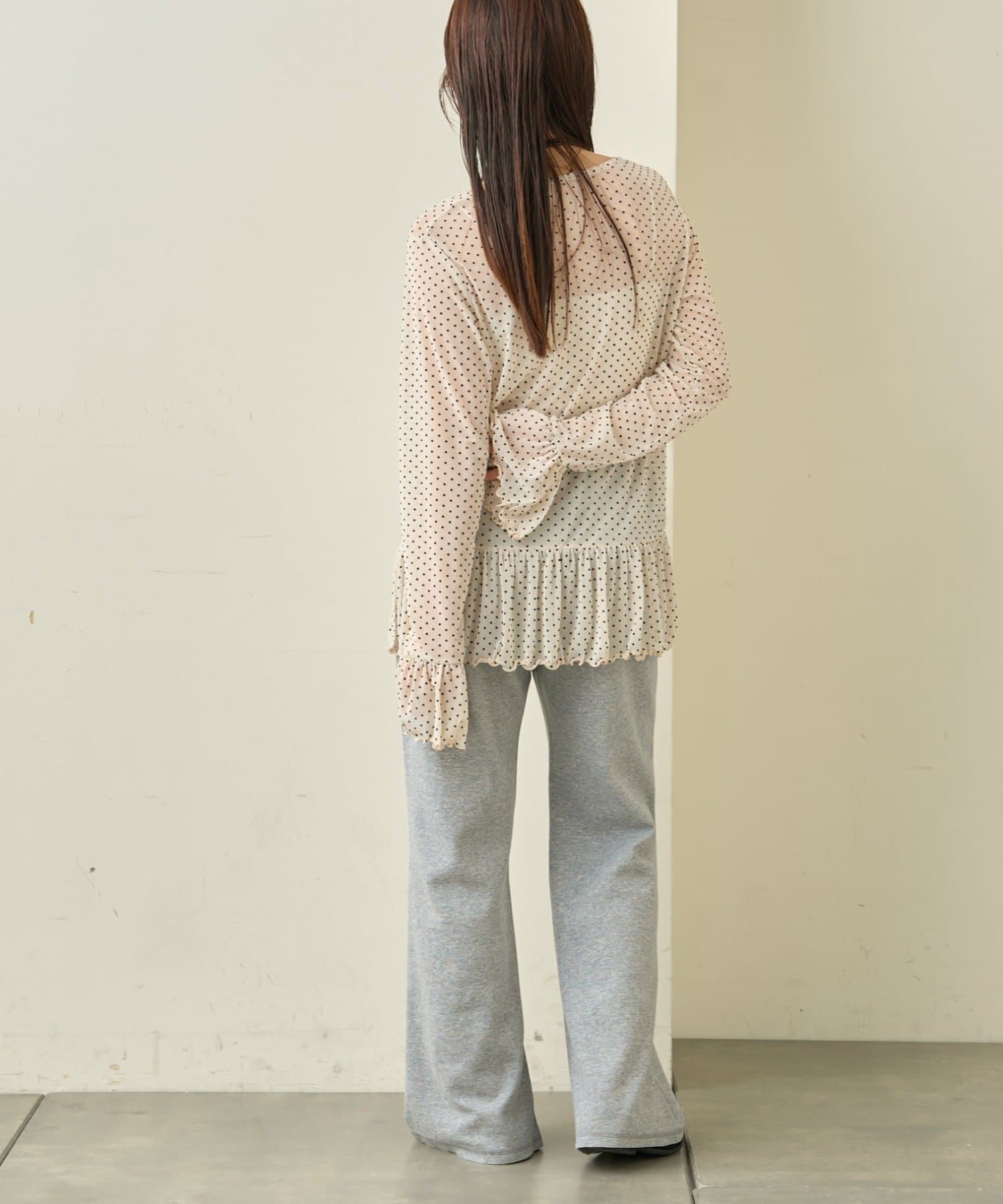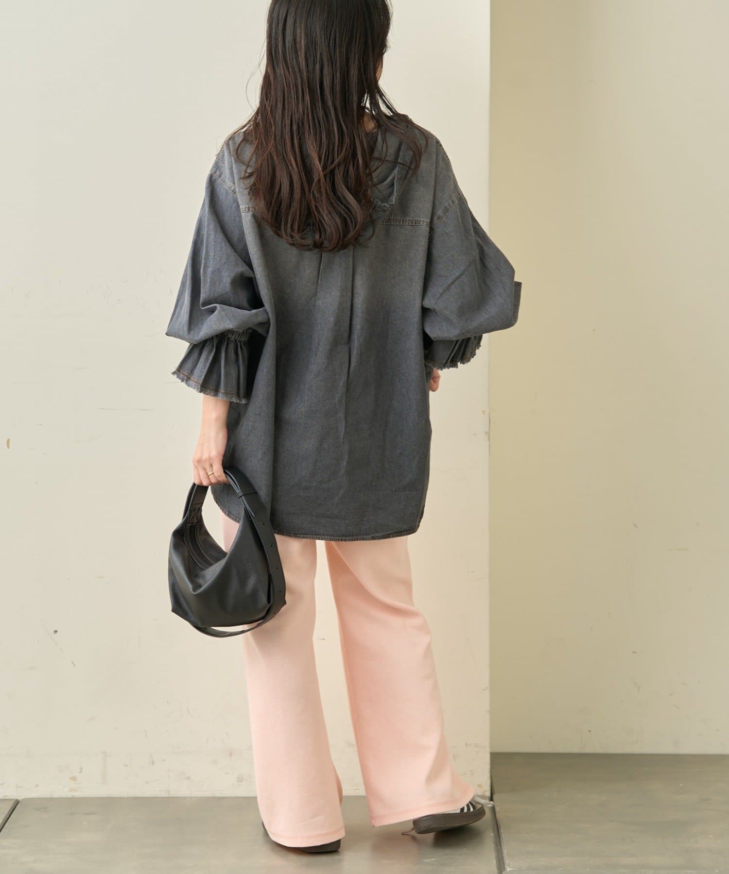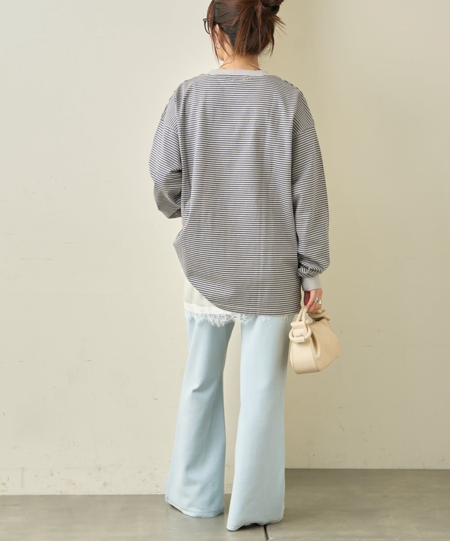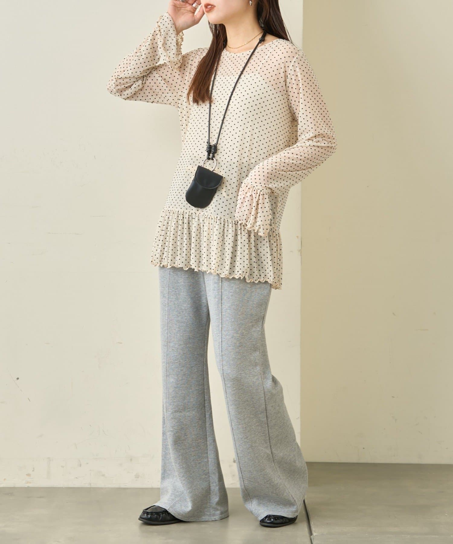 ウエストは紐付きでサイズ調整が可能な仕様。締め付け感が少なく、長時間の着用でもストレスを感じにくいのが魅力です。太ももまわりはゆったりとしつつ、裾に向かって自然に広がるワイドフレアシルエットで、気になる下半身をさりげなくカバー。センター部分の切り替えデザインが縦ラインを演出し、脚をまっすぐ長く見せてくれます。