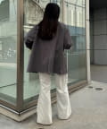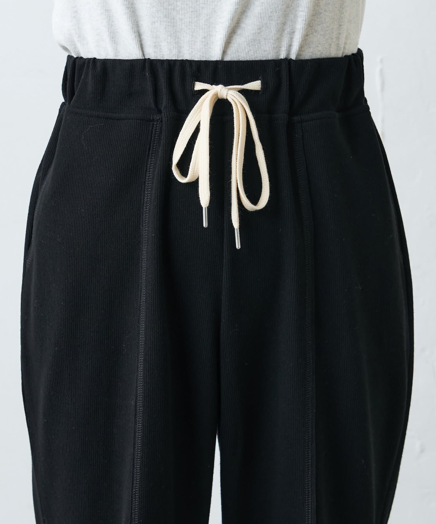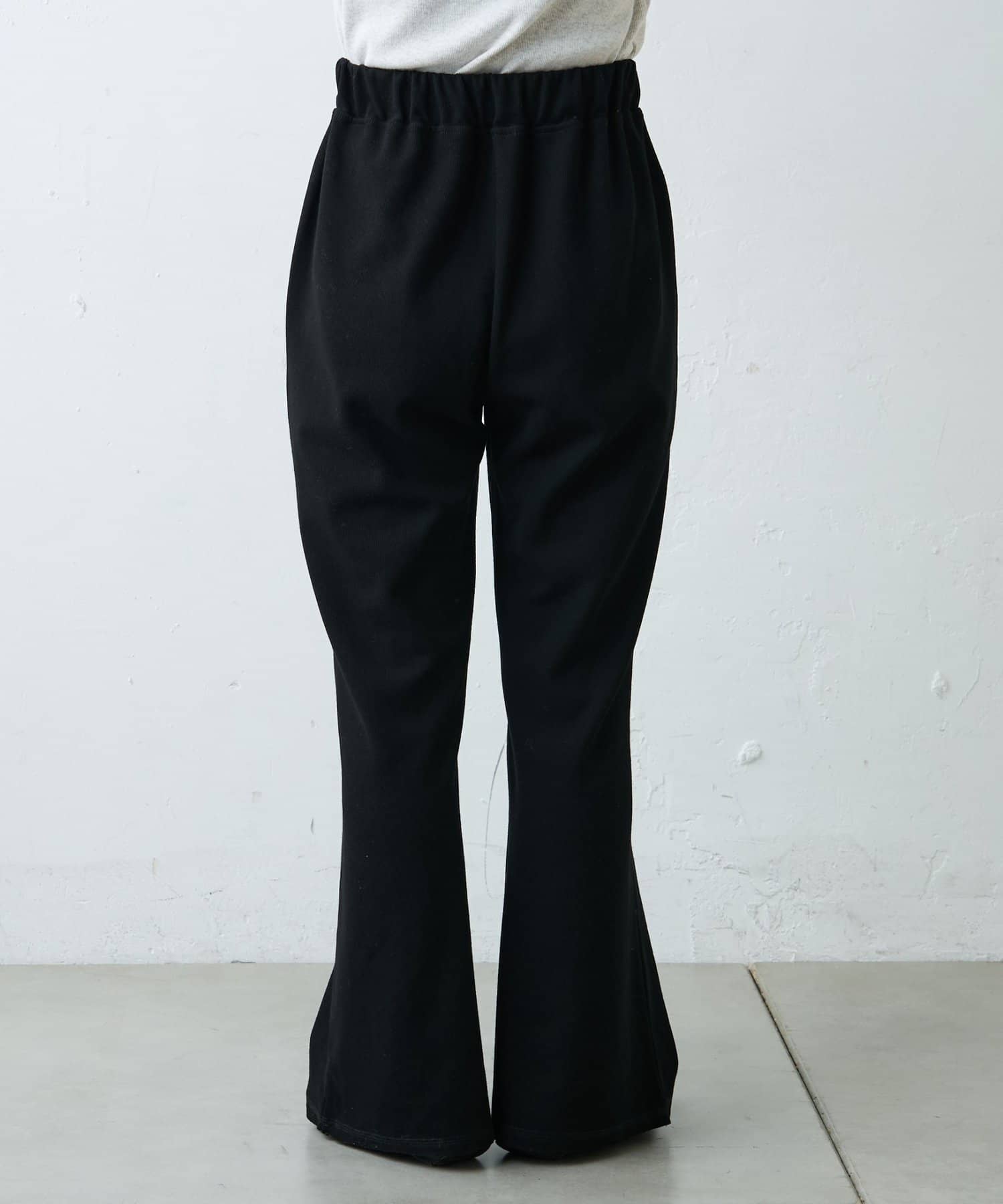程よい厚みと張り感のある、柔らかなリブ素材を使用したフレアパンツ。身体のラインを拾いにくく、穿くだけで縦のラインが強調されるため、すっきりとした印象に仕上がります。表面に凹凸のある生地感がのっぺり見えを防ぎ、シンプルながらも着映えする一本です。