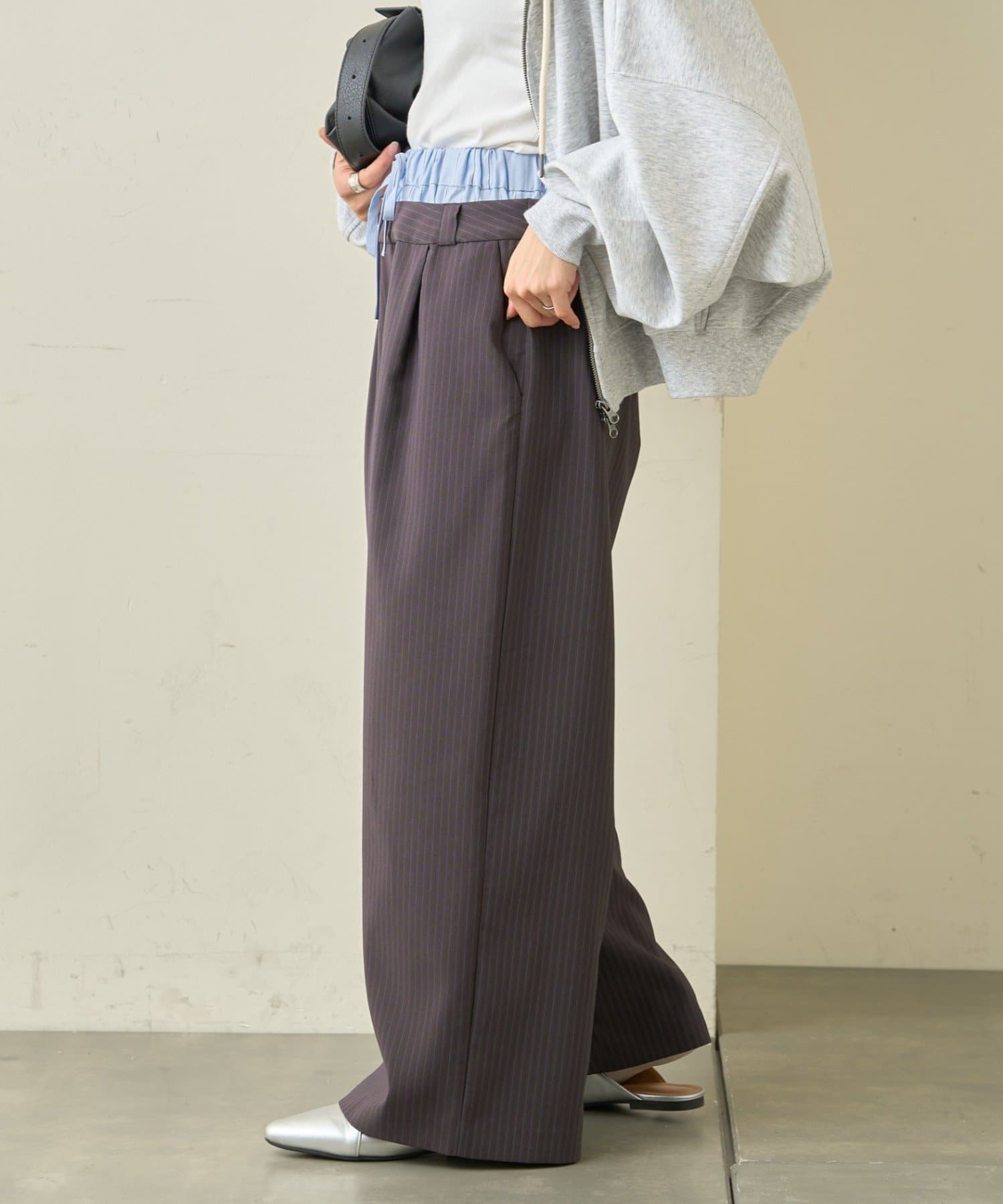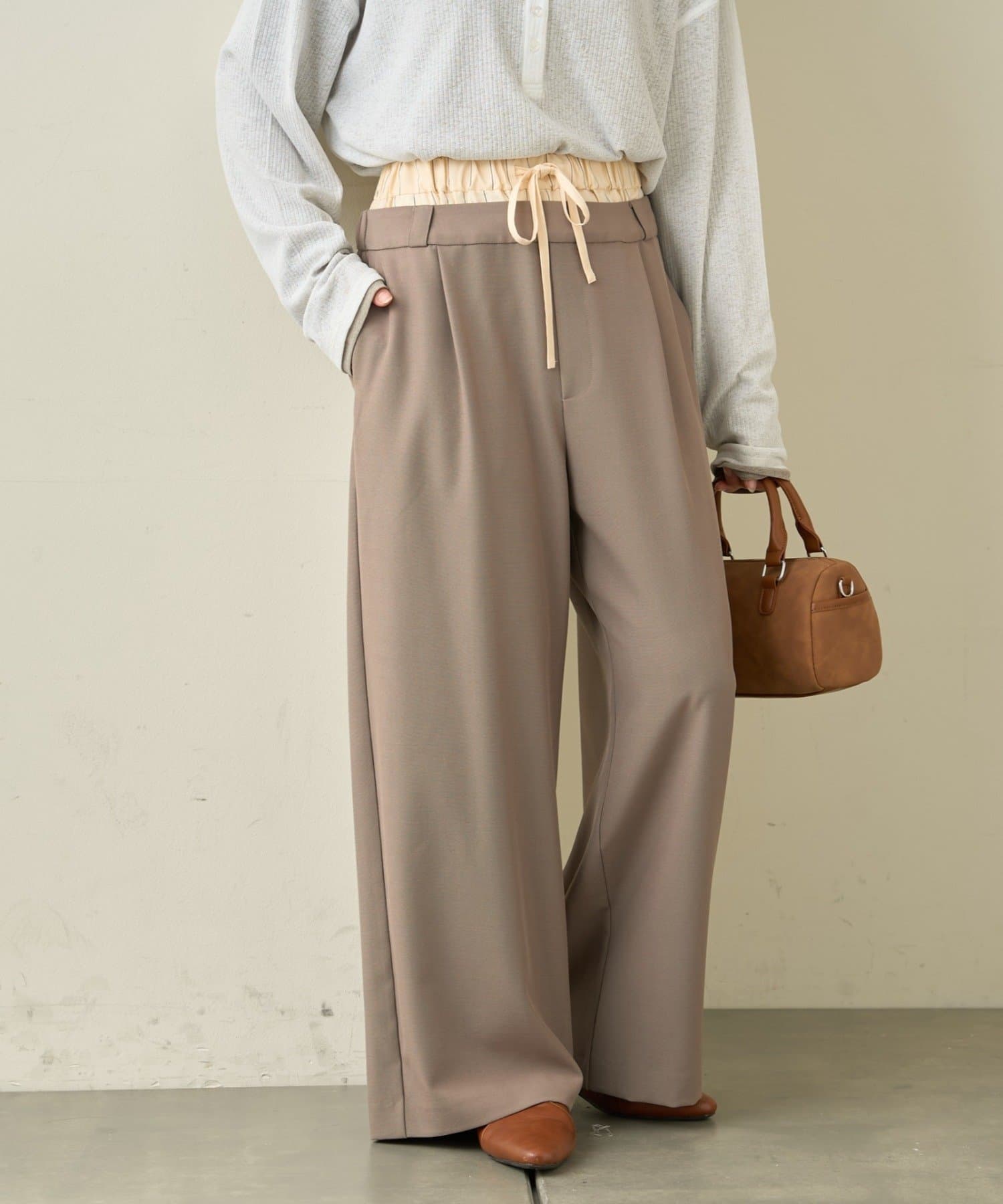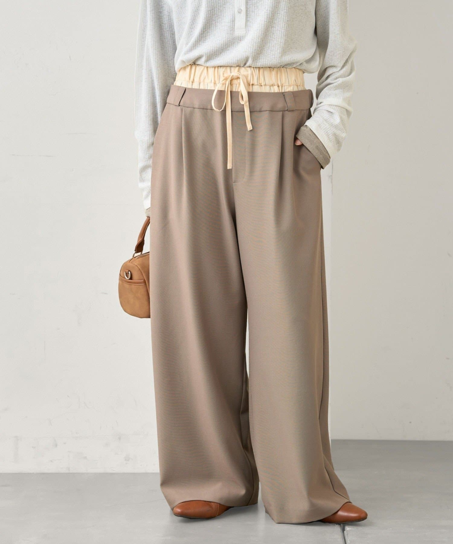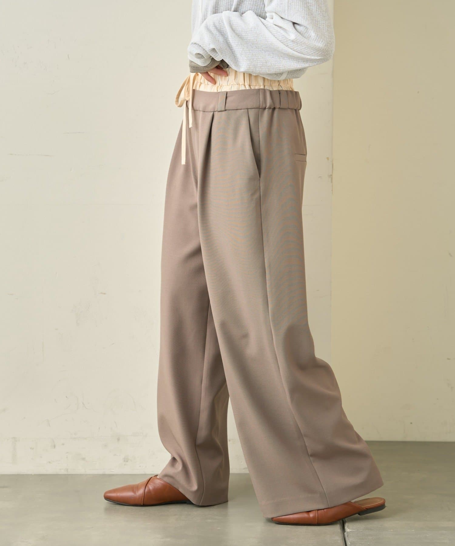 ワイドスラックスにパンツを重ね穿きしたような、ダブルウエストデザインが目を惹く一本。