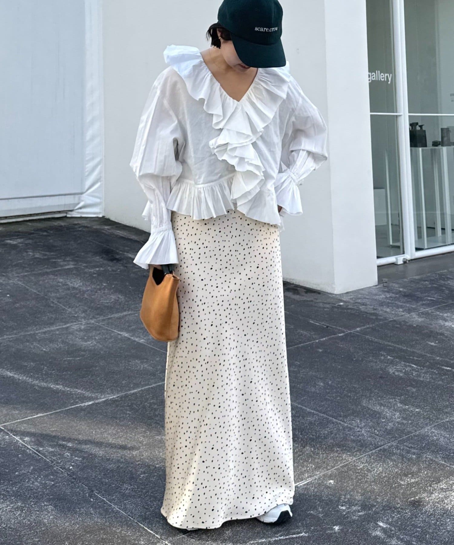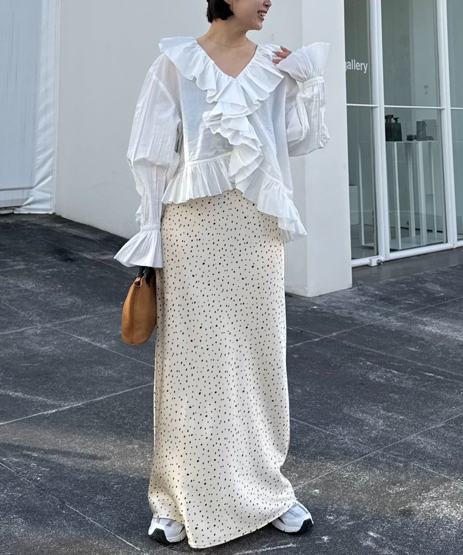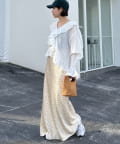 タックワイドパンツと組み合わせると、フリルのボリュームが引き立ちバランスの良い都会的な着こなしに。