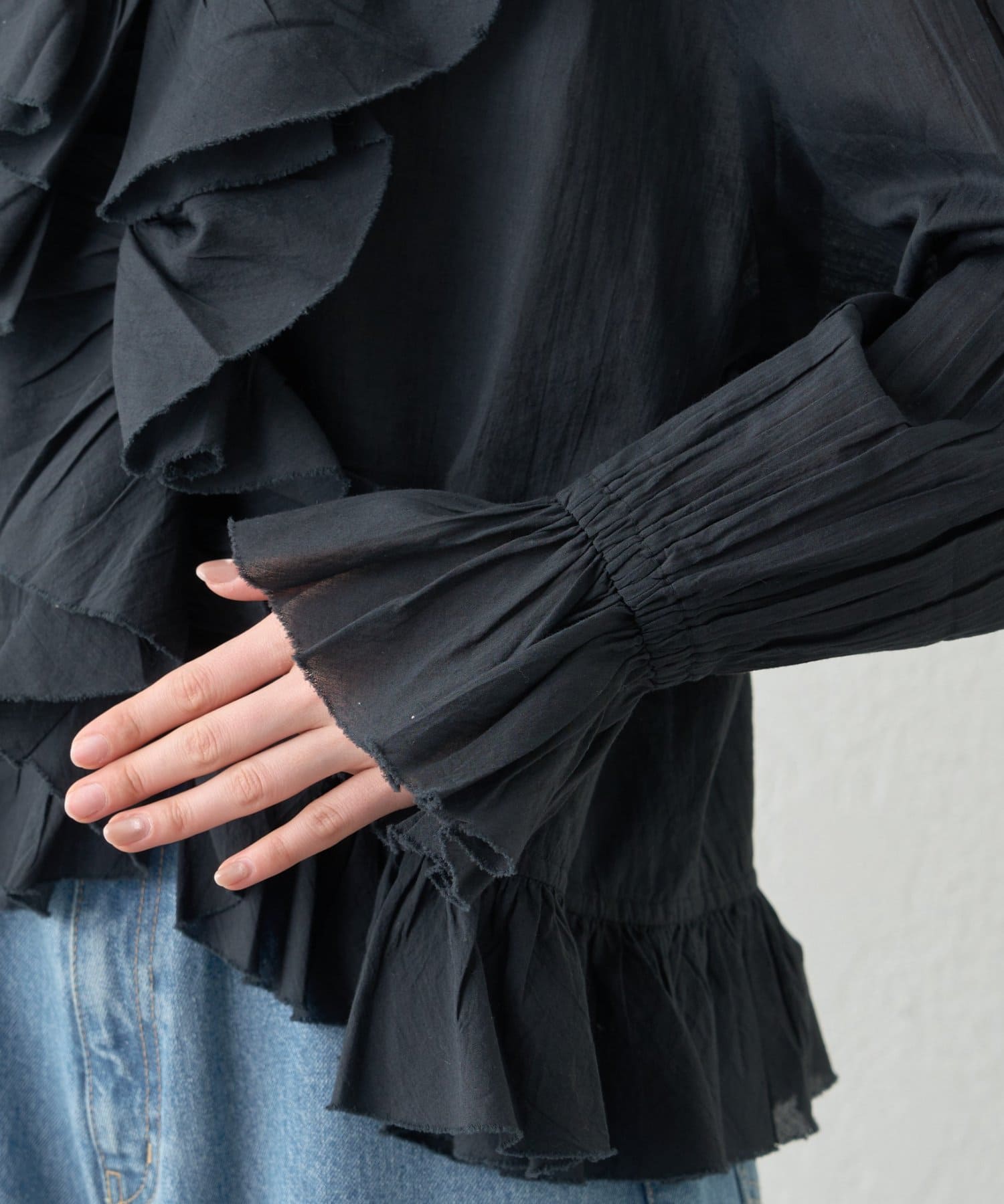 肩から袖、裾まで広めにフリルを施したデザインで、着るだけで華やかな印象に仕上がります。袖の付け根にはやわらかなギャザーを寄せ、ふんわり丸みのあるラインを形成。動くたび軽やかに揺れ、日常のコーデに立体感をプラスします。
