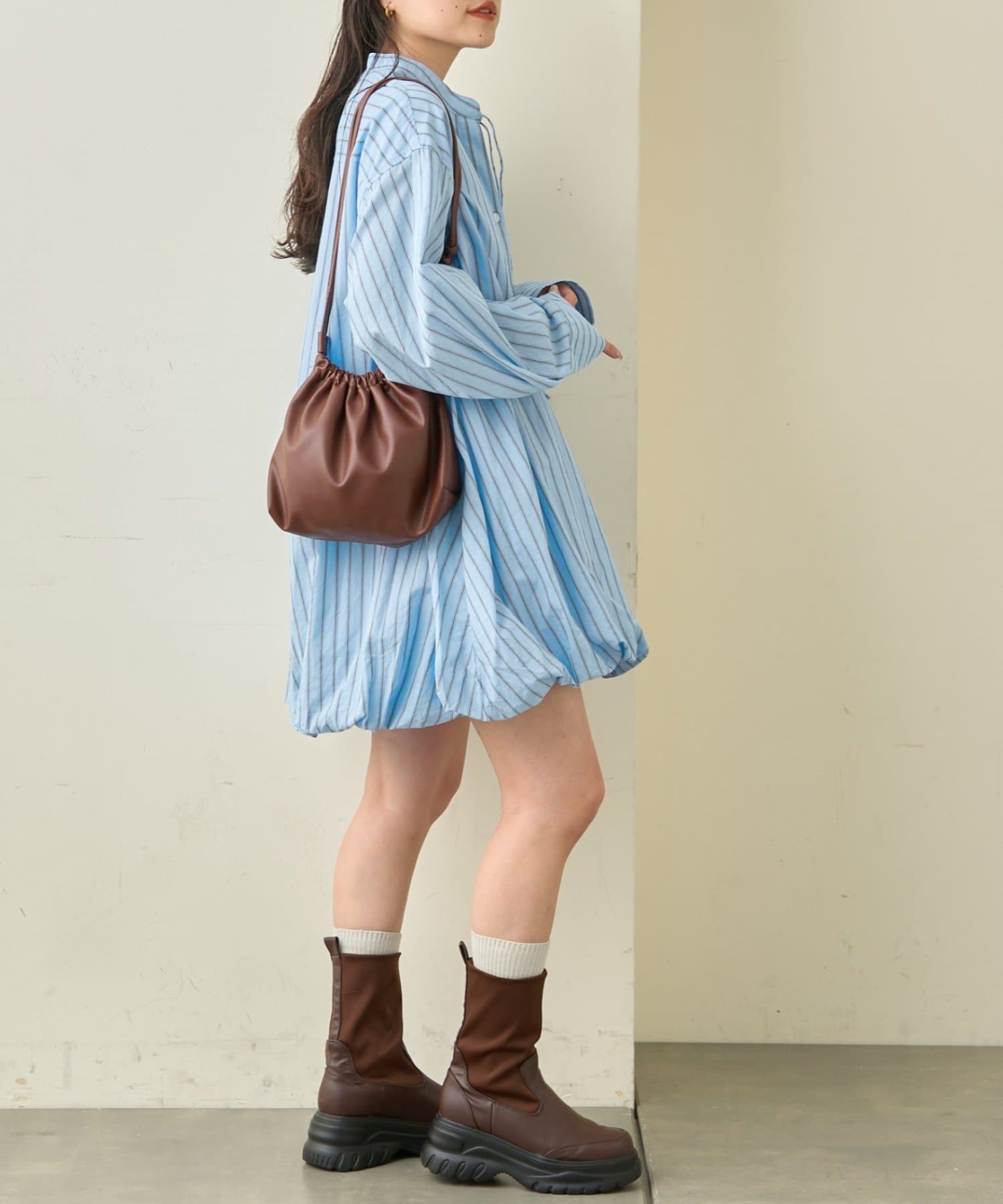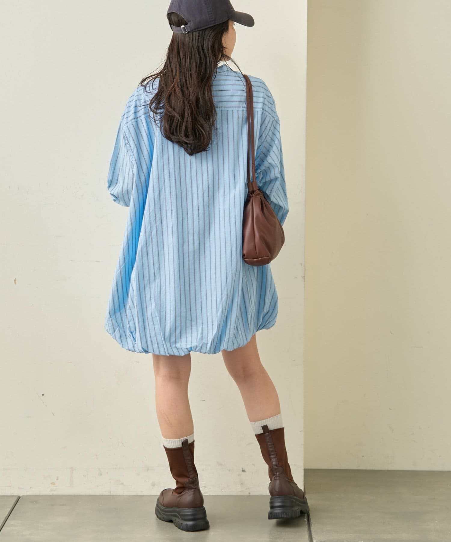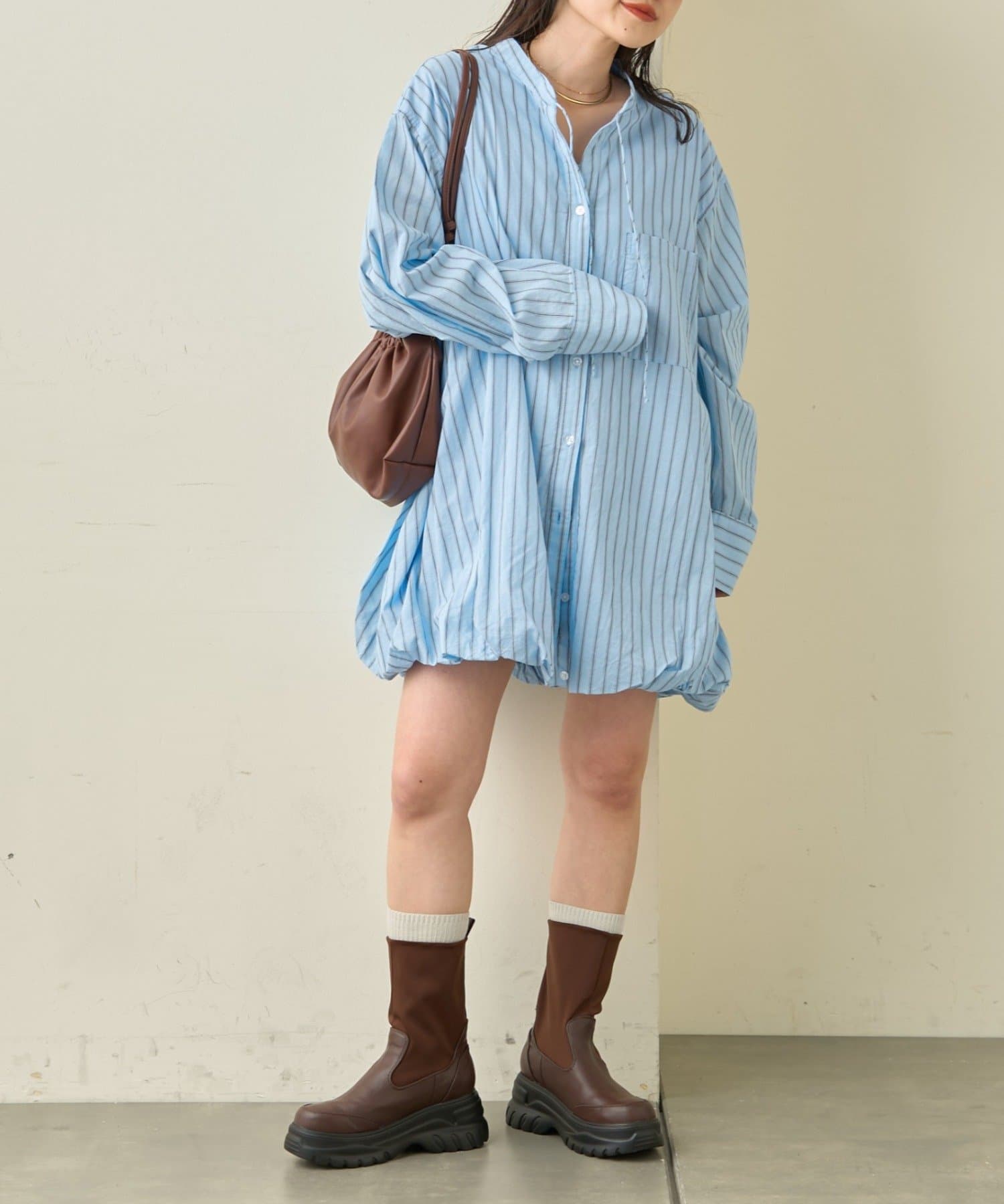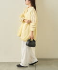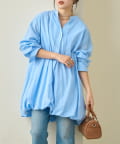 裾のバルーンシルエットが引き立ちバランス良くまとまります。足元はフラットシューズやスニーカーで抜け感を出すと、デイリー使いしやすい印象に。チュニックワンピ風に着る場合は、レギンスやナローパンツをレイヤードするのがおすすめです。紐を軽く結んでフェミニンに、あえて垂らしてラフにと、首元のアレンジで雰囲気を変えられます。