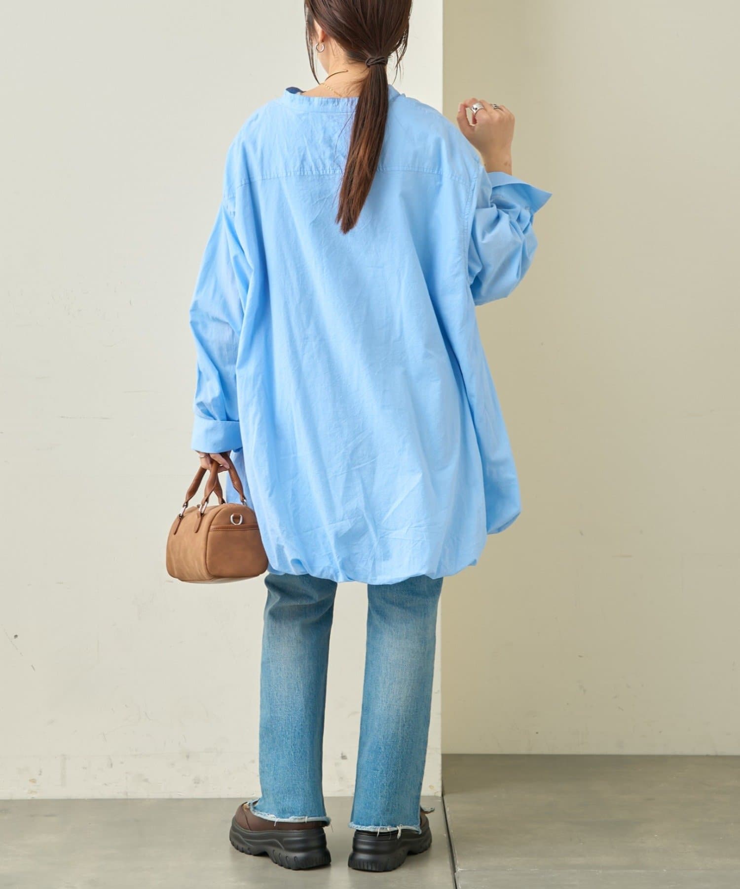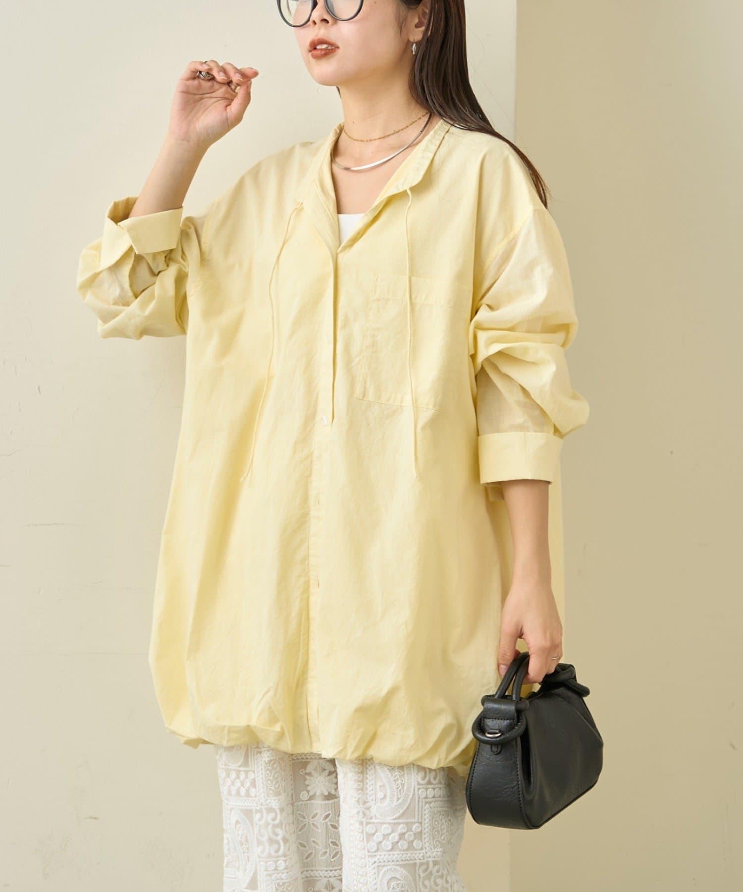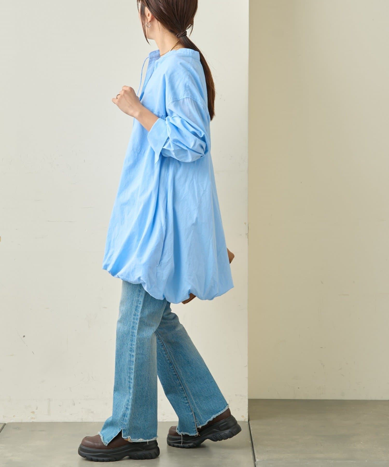 首元はすっきり見えが叶うバンドカラーに、程よく抜け感の出る紐付きスキッパーデザインを組み合わせたチュニックブラウス。顔まわりをシャープに見せつつ、結び方次第で印象を変えられるのがポイントです。裾はふんわりと丸みを持たせたバルーンシルエットで、動くたびに立体感が生まれ、シンプルながらもコーディネートの主役になる一枚に仕上げています。