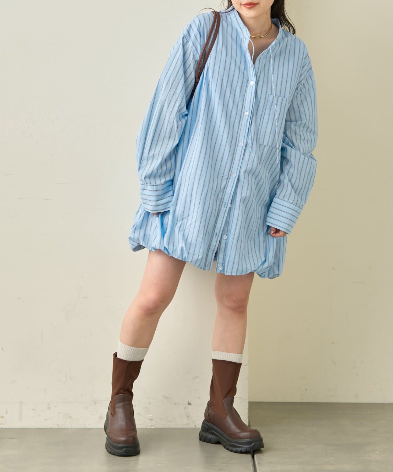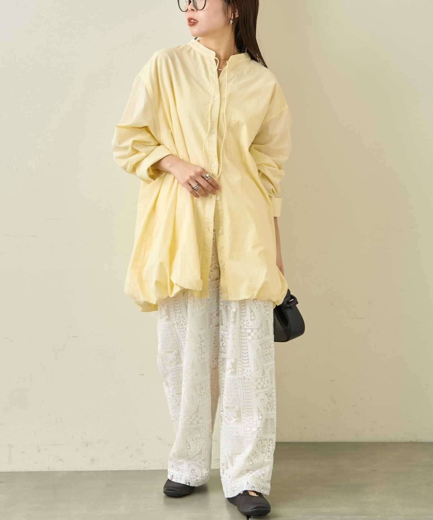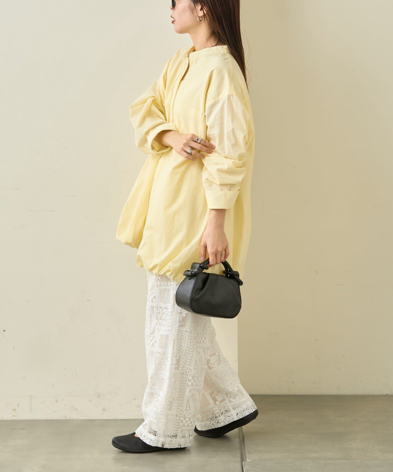首元はすっきり見えが叶うバンドカラーに、程よく抜け感の出る紐付きスキッパーデザインを組み合わせたチュニックブラウス。顔まわりをシャープに見せつつ、結び方次第で印象を変えられるのがポイントです。裾はふんわりと丸みを持たせたバルーンシルエットで、動くたびに立体感が生まれ、シンプルながらもコーディネートの主役になる一枚に仕上げています。