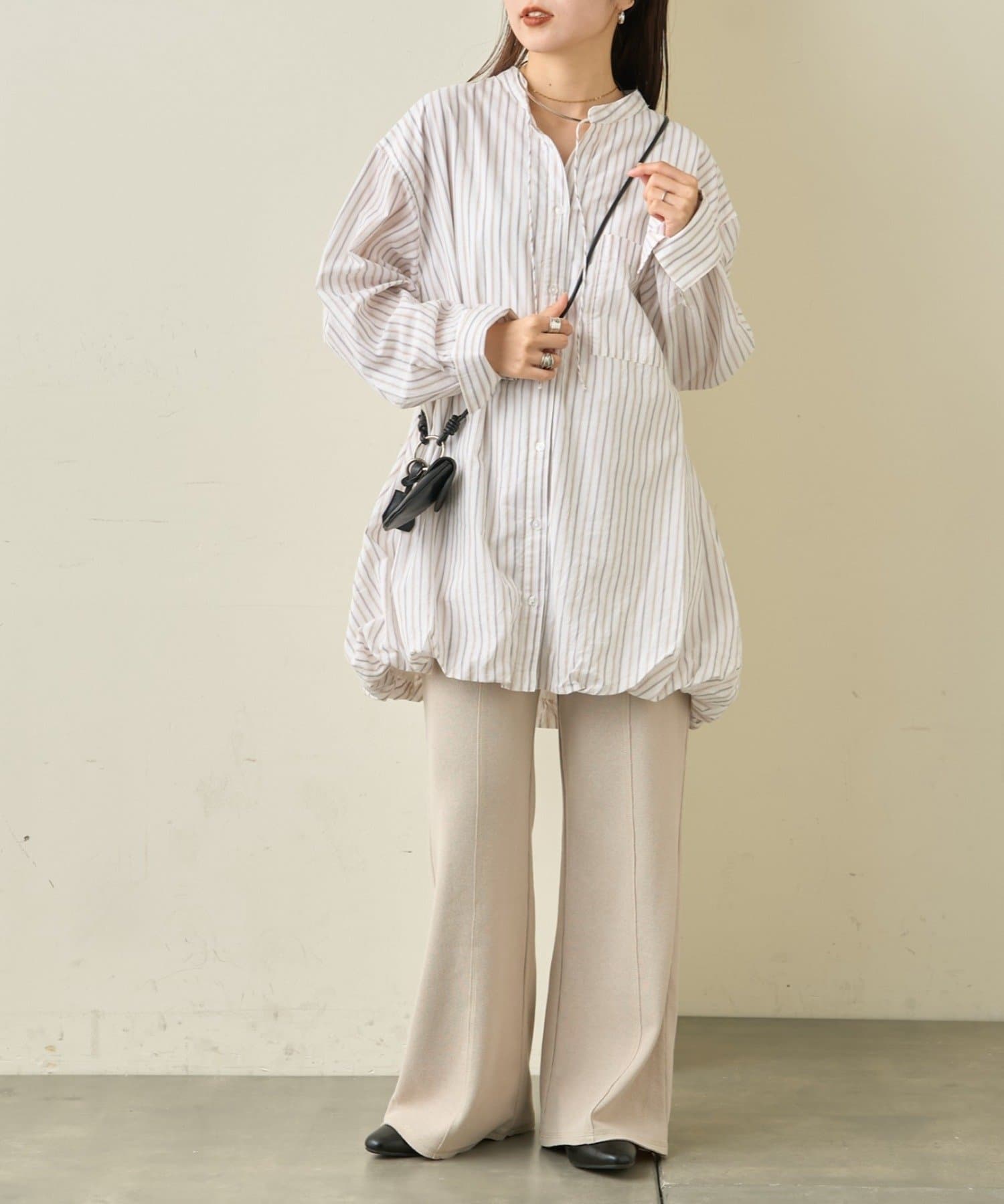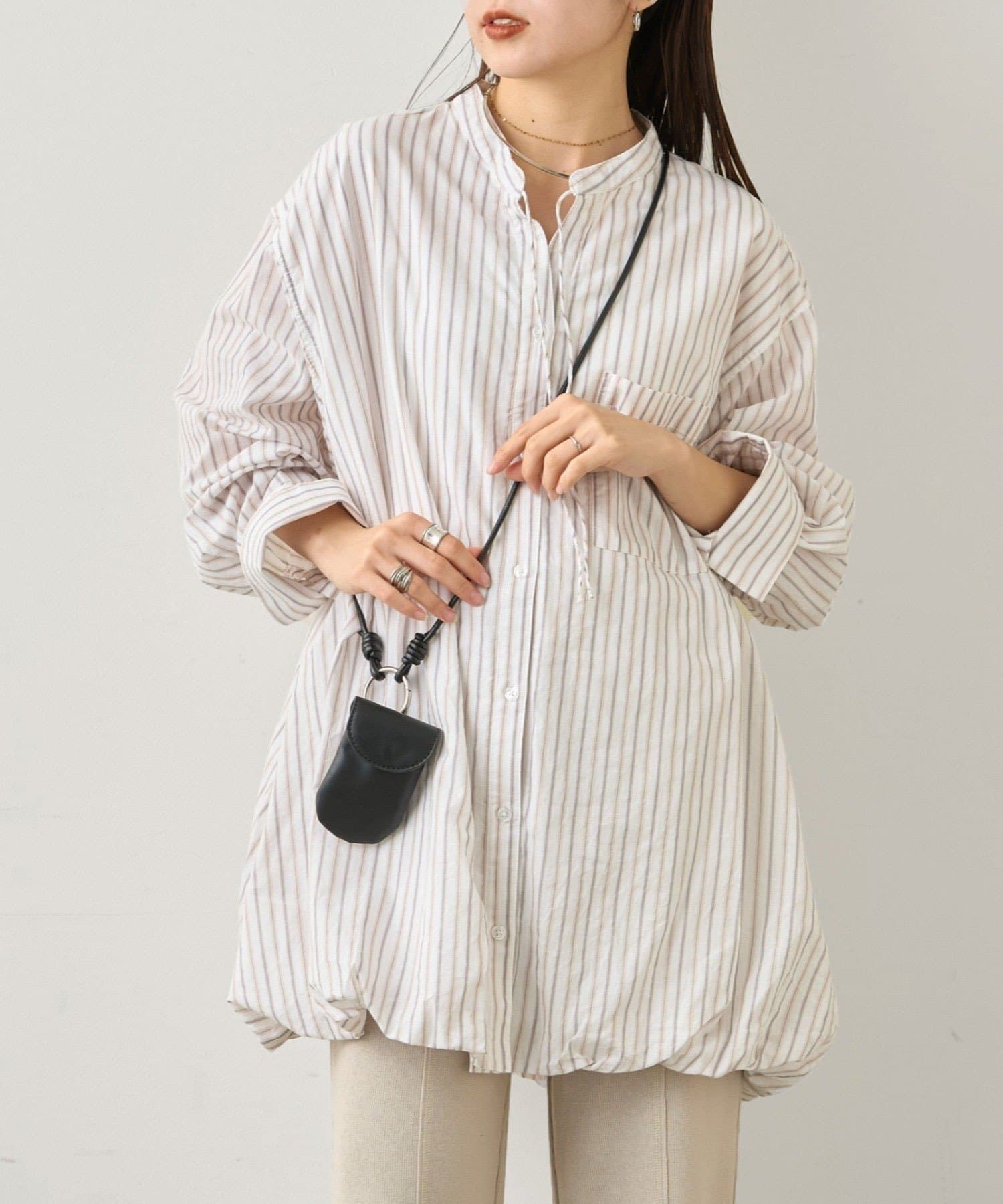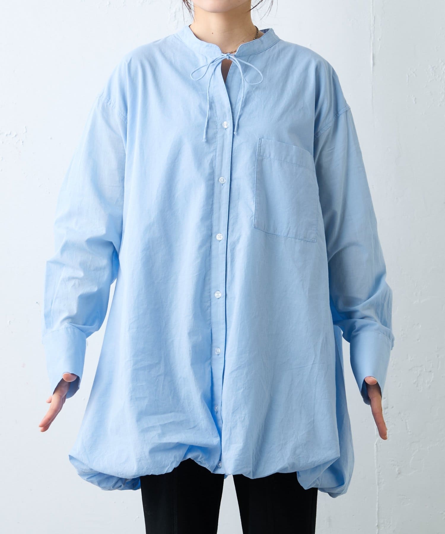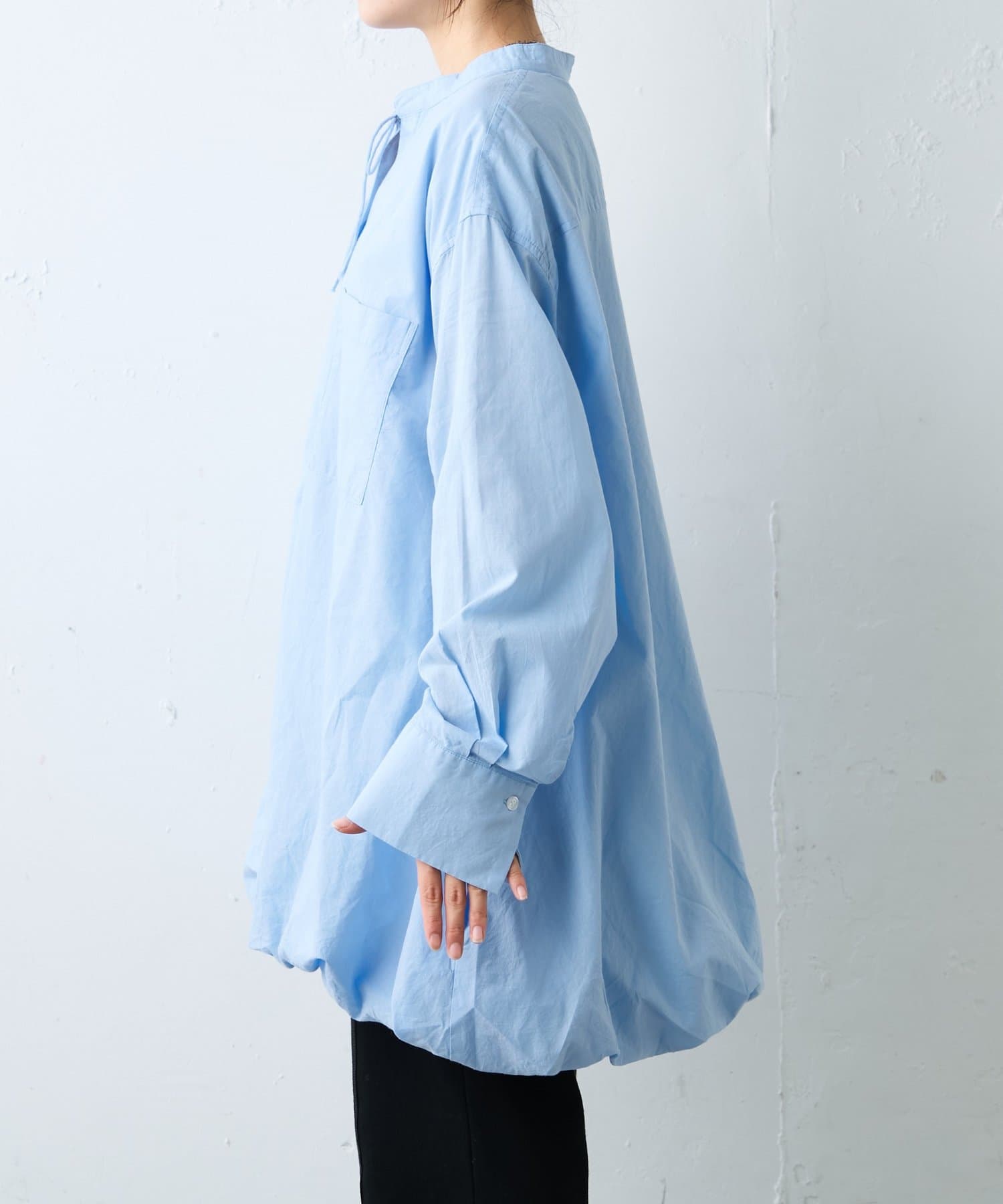 首元はすっきり見えが叶うバンドカラーに、程よく抜け感の出る紐付きスキッパーデザインを組み合わせたチュニックブラウス。顔まわりをシャープに見せつつ、結び方次第で印象を変えられるのがポイントです。裾はふんわりと丸みを持たせたバルーンシルエットで、動くたびに立体感が生まれ、シンプルながらもコーディネートの主役になる一枚に仕上げています。