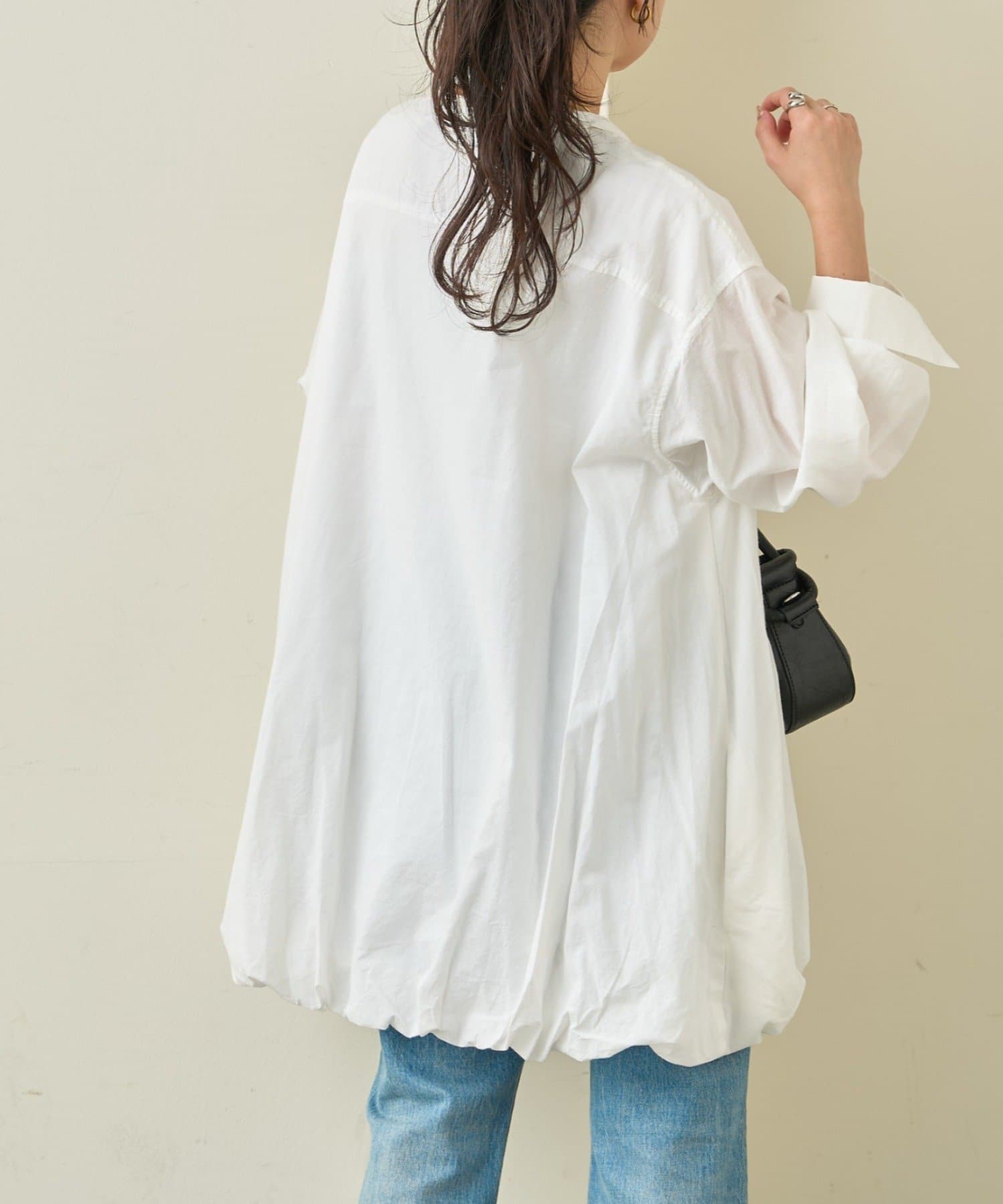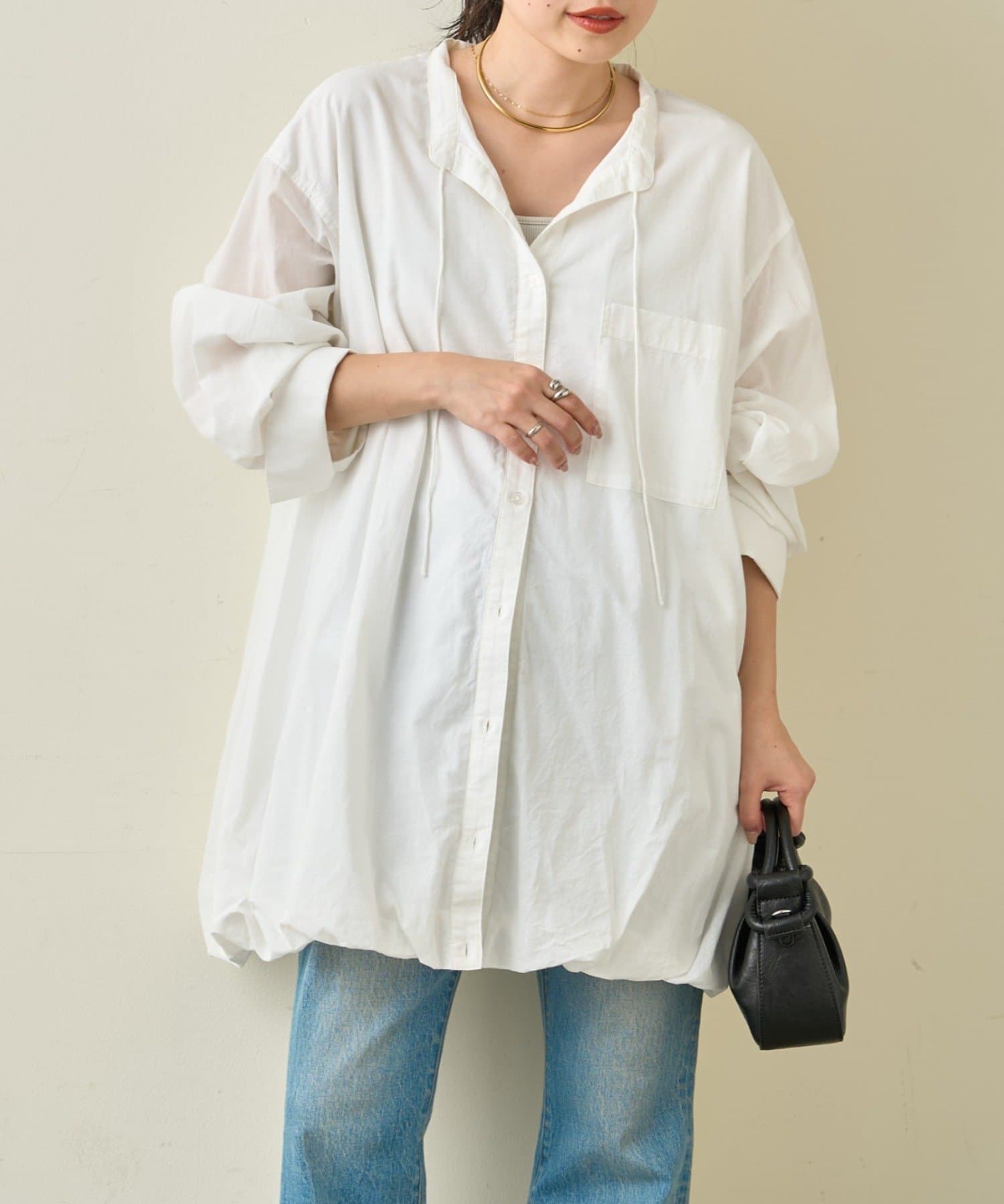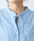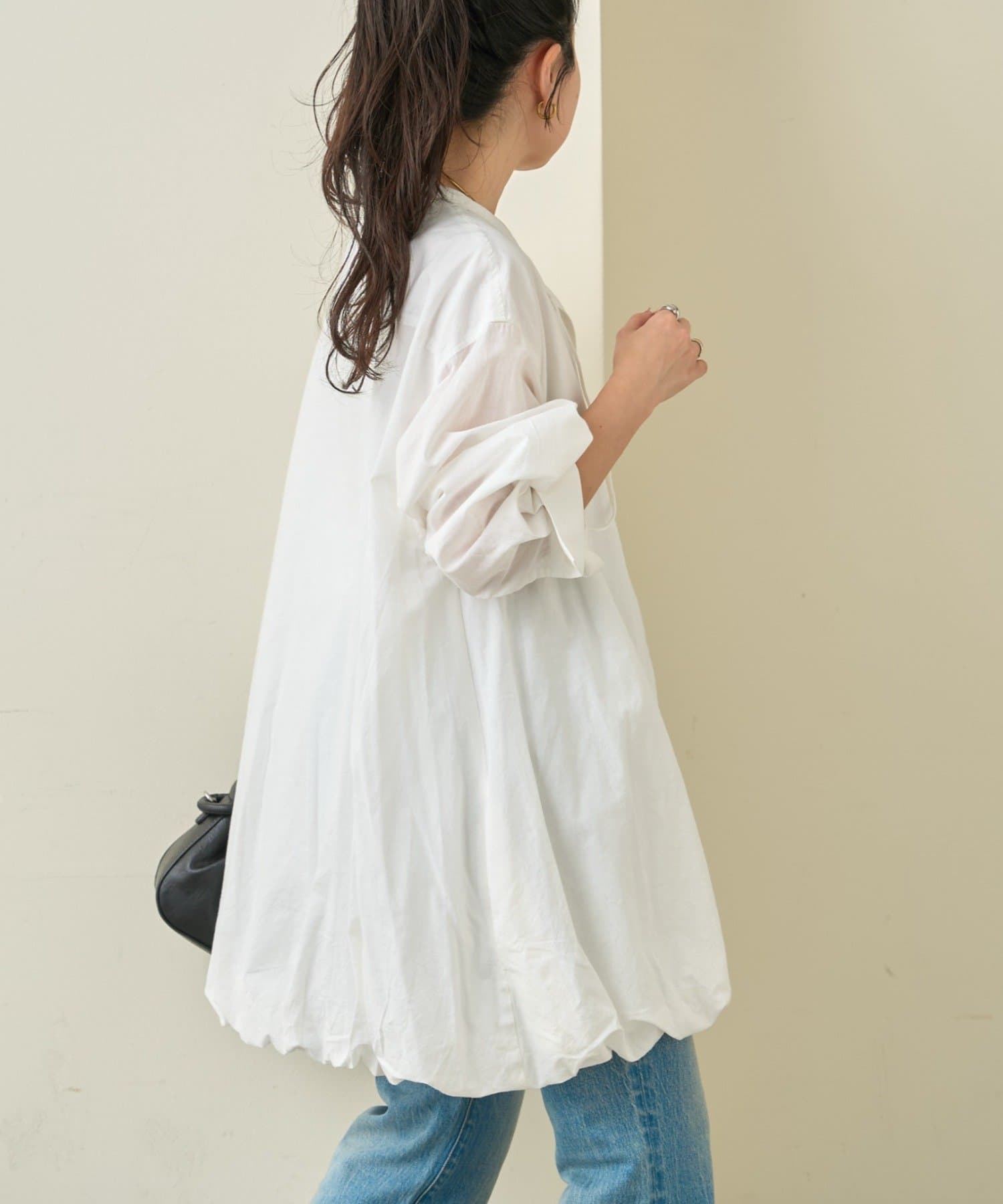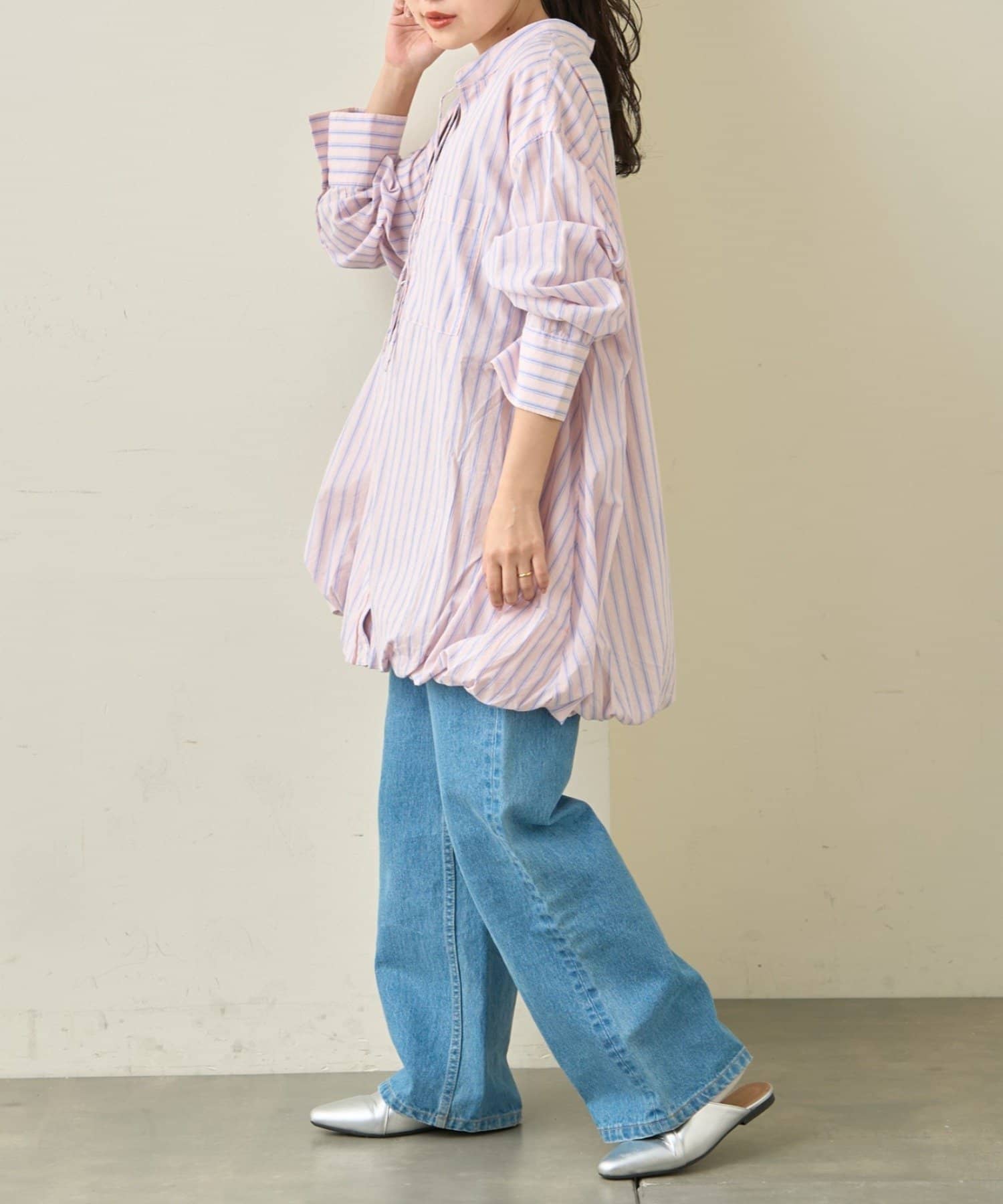 首元はすっきり見えが叶うバンドカラーに、程よく抜け感の出る紐付きスキッパーデザインを組み合わせたチュニックブラウス。顔まわりをシャープに見せつつ、結び方次第で印象を変えられるのがポイントです。裾はふんわりと丸みを持たせたバルーンシルエットで、動くたびに立体感が生まれ、シンプルながらもコーディネートの主役になる一枚に仕上げています。