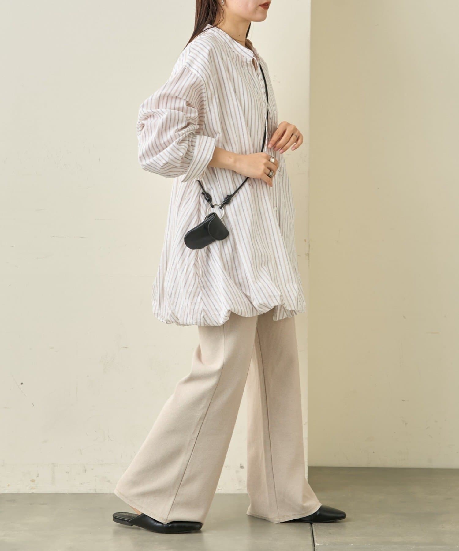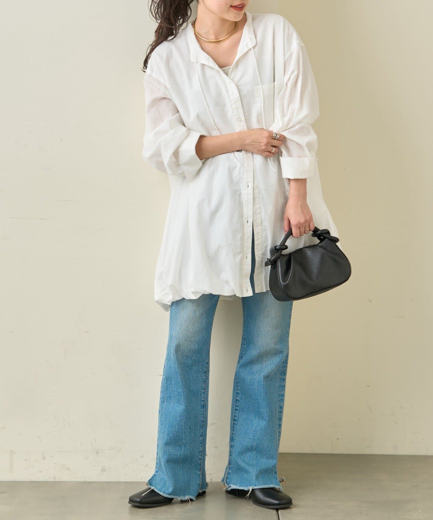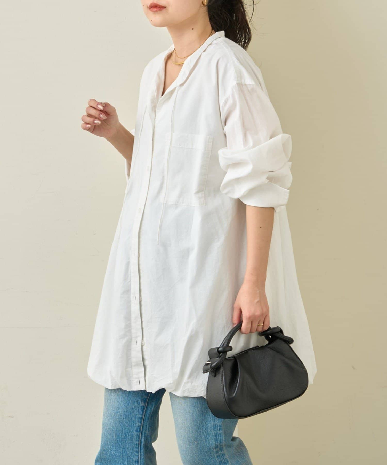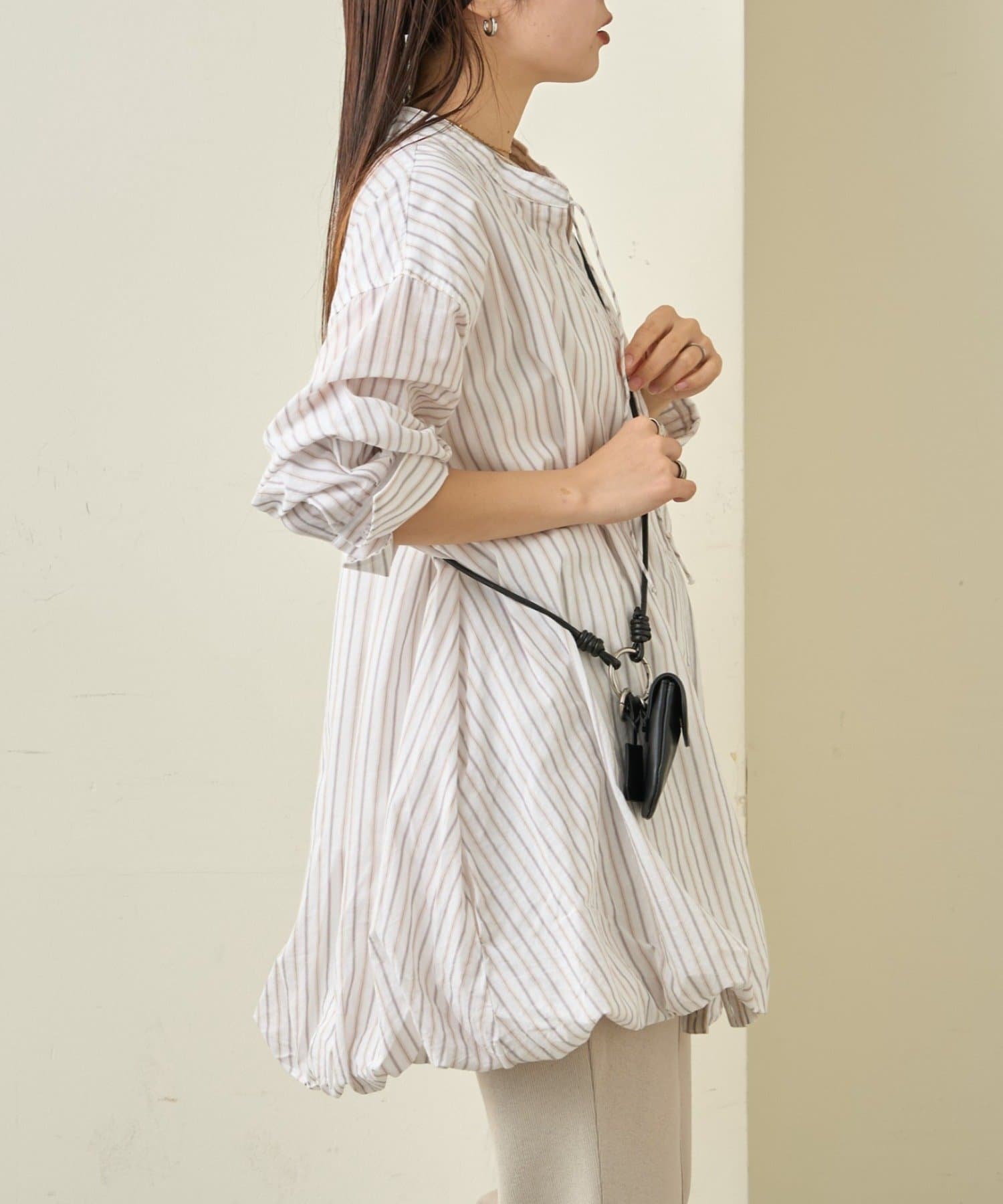 首元はすっきり見えが叶うバンドカラーに、程よく抜け感の出る紐付きスキッパーデザインを組み合わせたチュニックブラウス。顔まわりをシャープに見せつつ、結び方次第で印象を変えられるのがポイントです。裾はふんわりと丸みを持たせたバルーンシルエットで、動くたびに立体感が生まれ、シンプルながらもコーディネートの主役になる一枚に仕上げています。