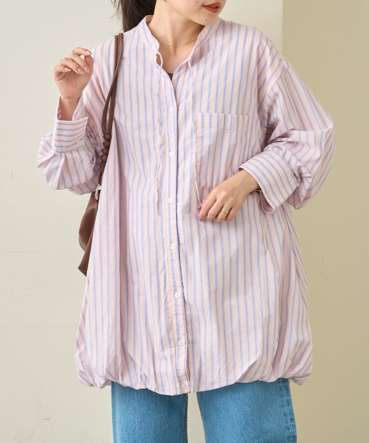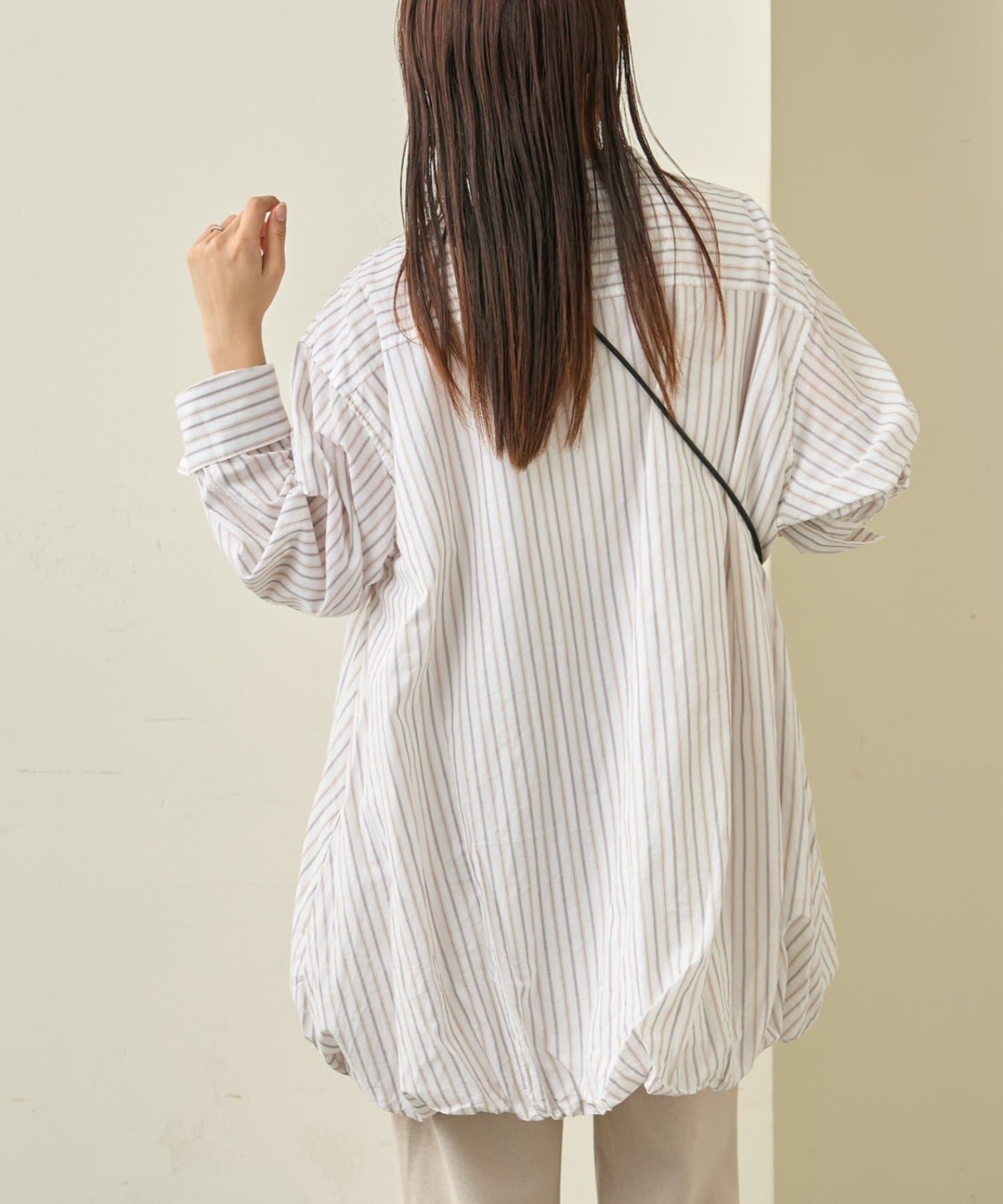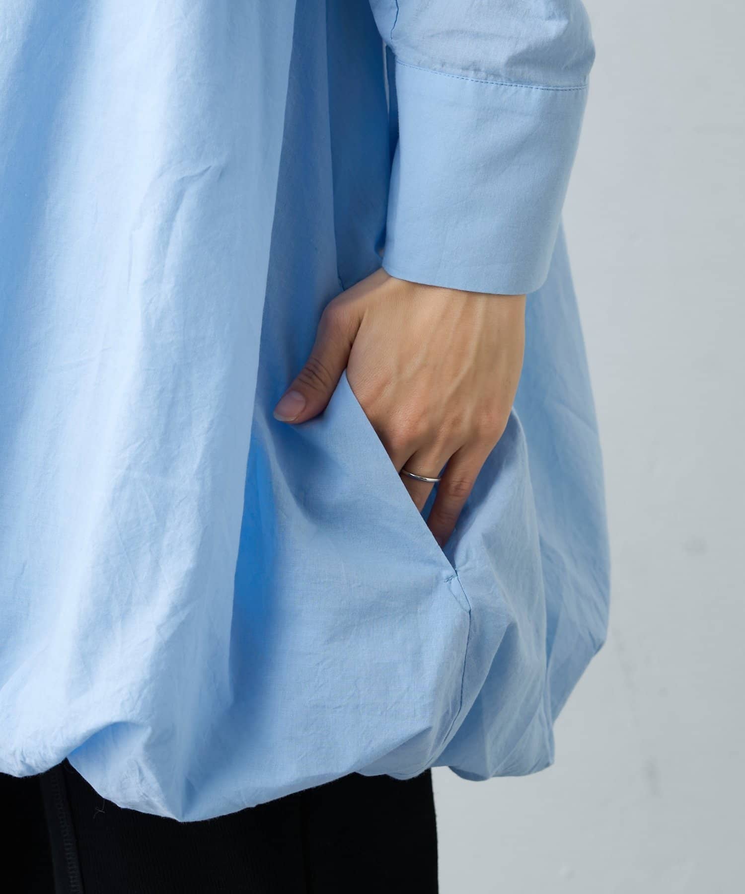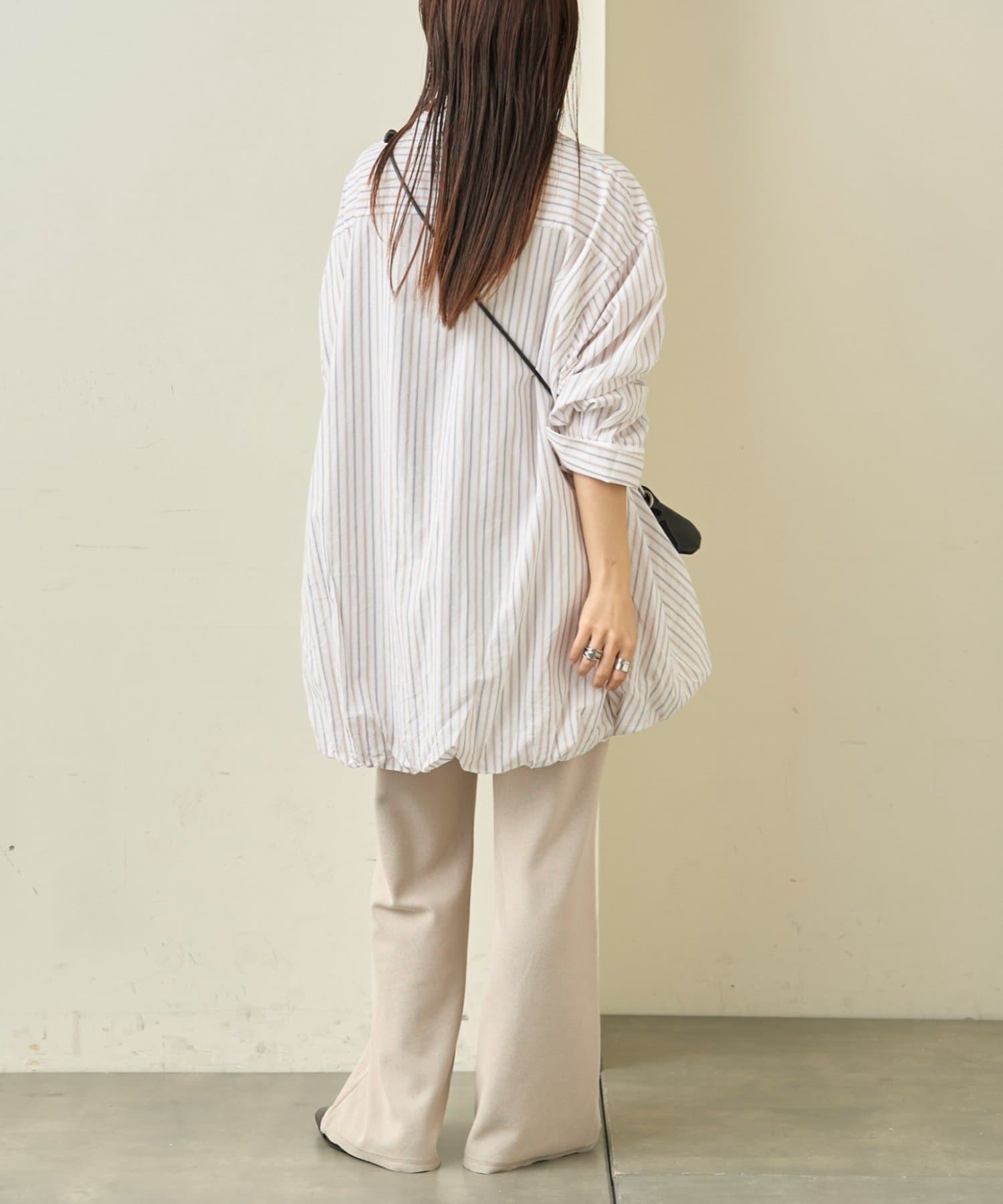 首元はすっきり見えが叶うバンドカラーに、程よく抜け感の出る紐付きスキッパーデザインを組み合わせたチュニックブラウス。顔まわりをシャープに見せつつ、結び方次第で印象を変えられるのがポイントです。裾はふんわりと丸みを持たせたバルーンシルエットで、動くたびに立体感が生まれ、シンプルながらもコーディネートの主役になる一枚に仕上げています。
