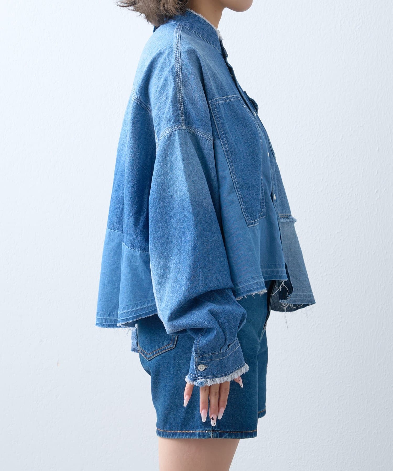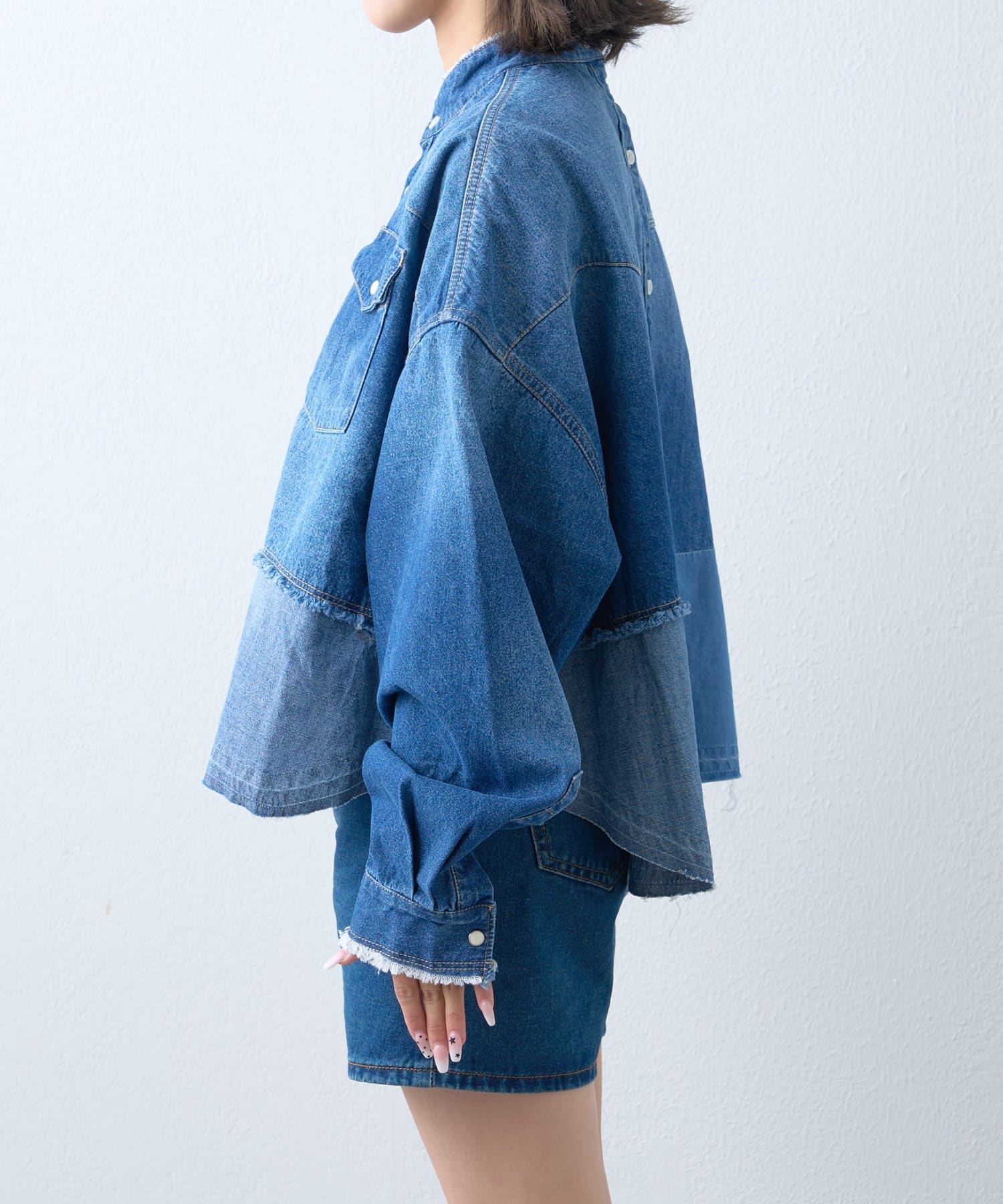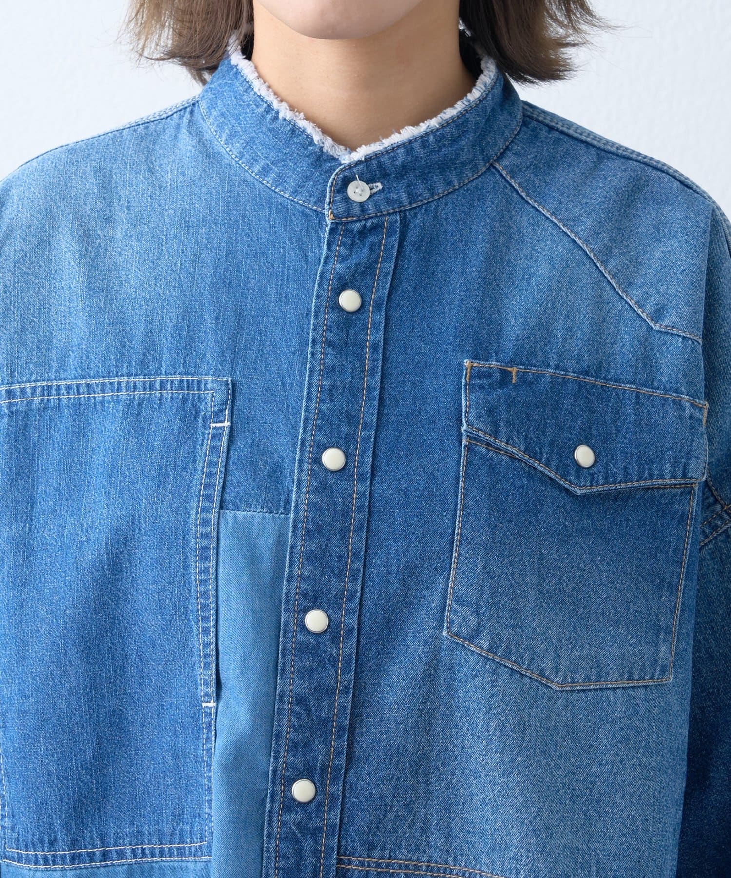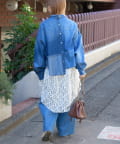 首元はバンドカラーでスッキリと。フロントボタンを開けて羽織としても着用できるので、様々な着こなしが楽しめます。
