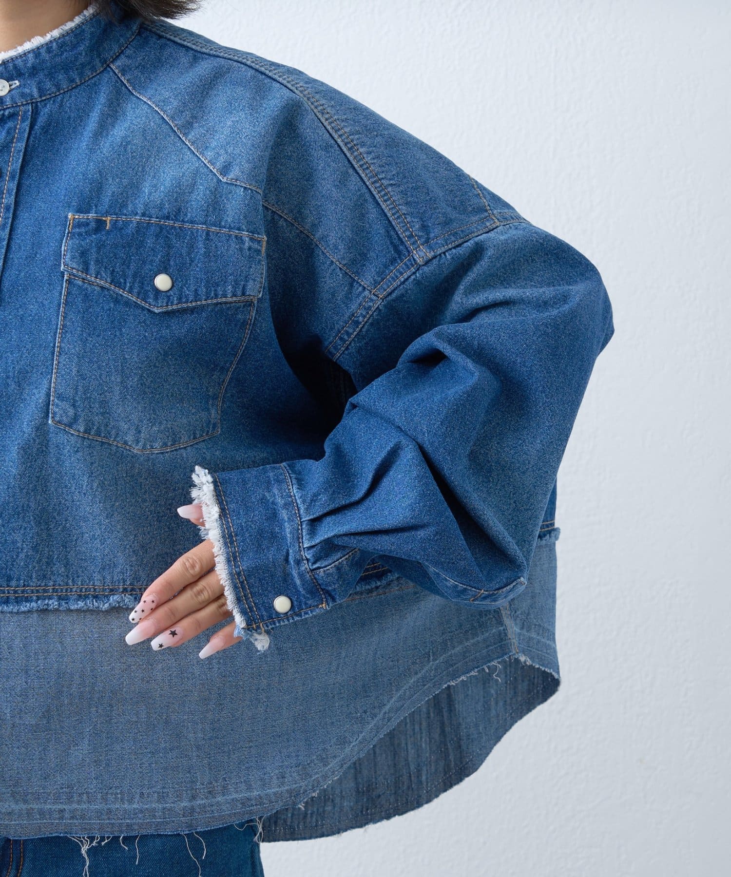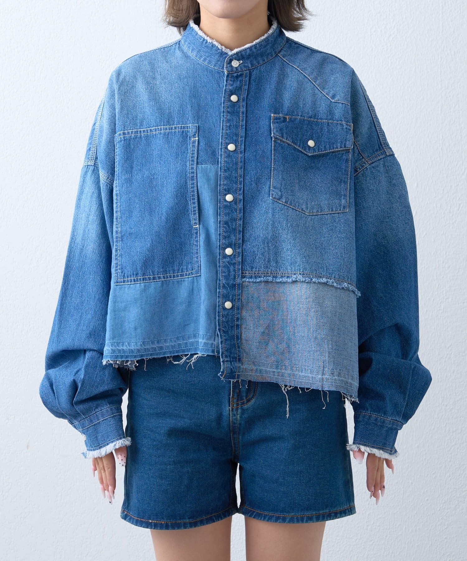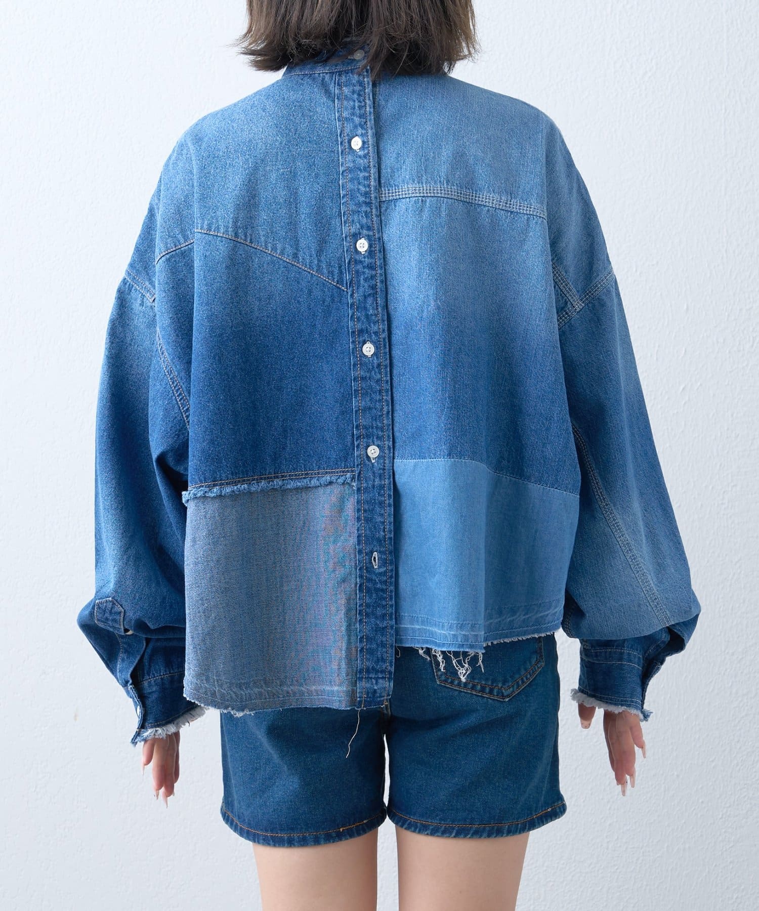 首元はバンドカラーでスッキリと。フロントボタンを開けて羽織としても着用できるので、様々な着こなしが楽しめます。