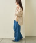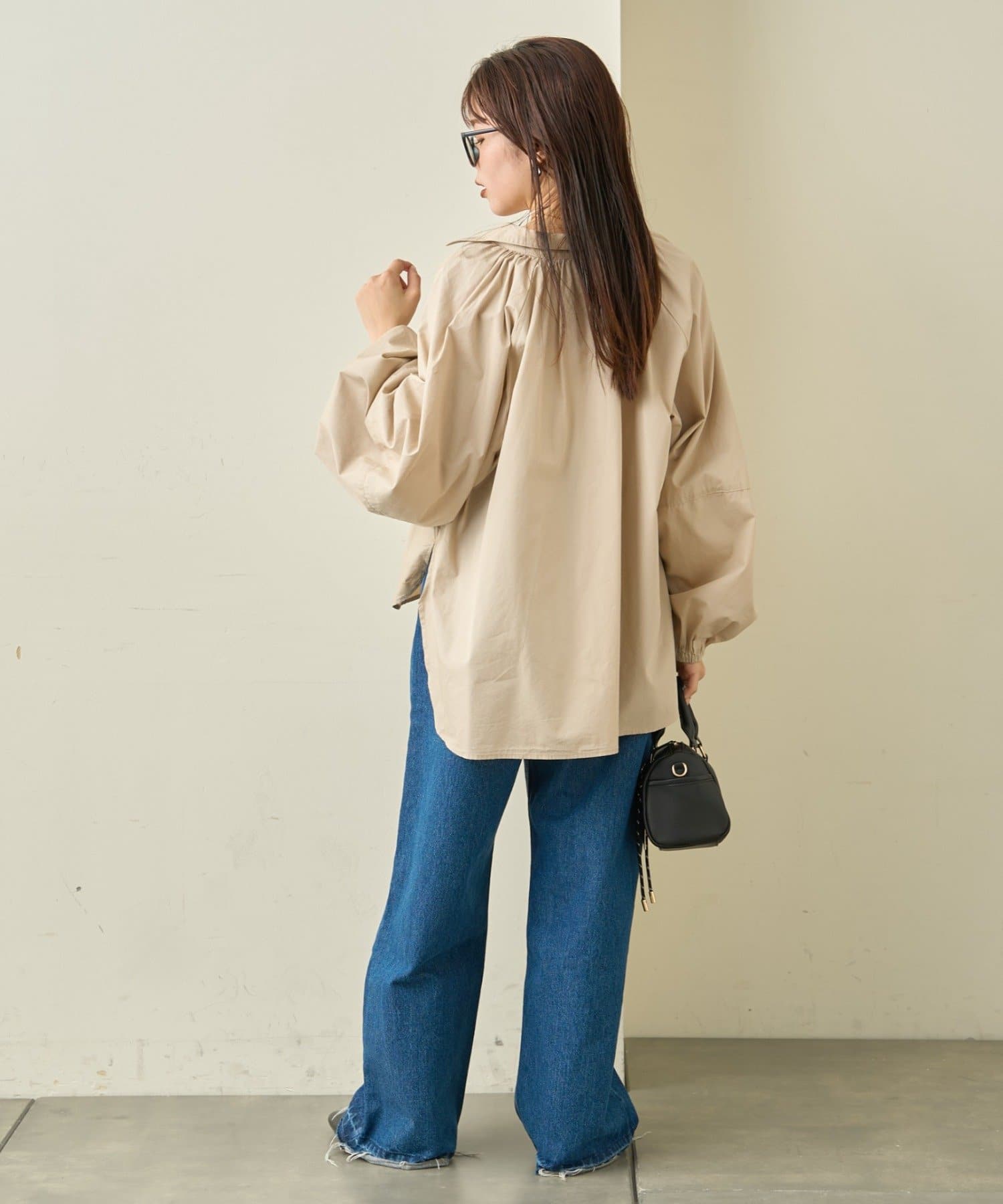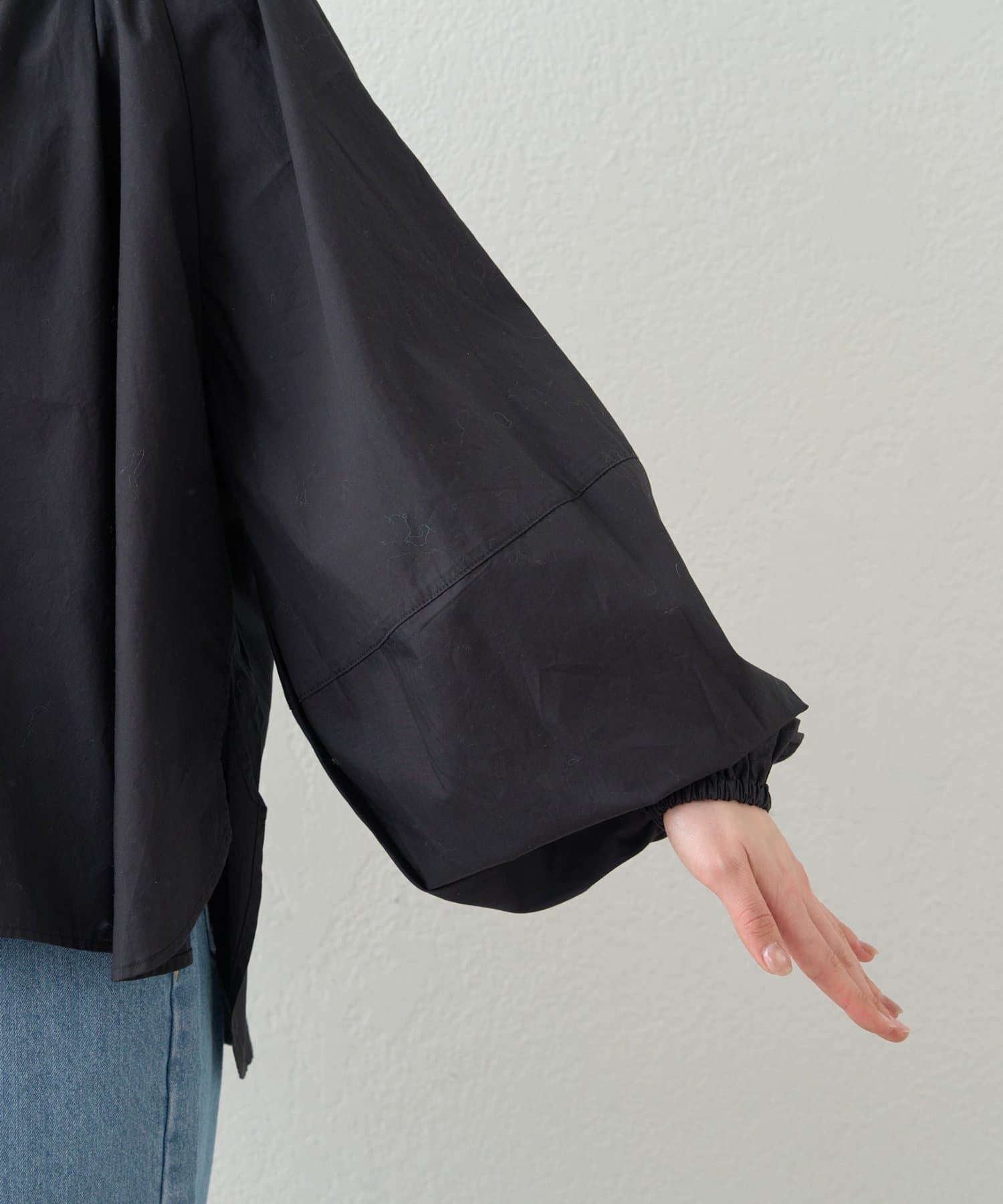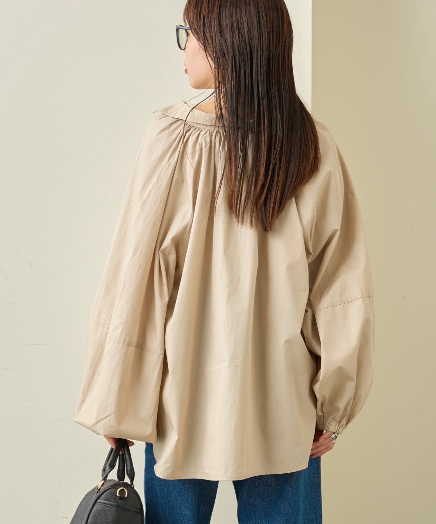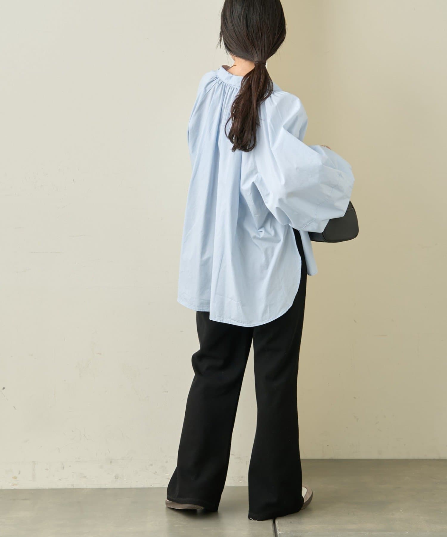 袖はボリューム感を持たせつつ、袖口をゴムでキュッと絞ることでメリハリのあるシルエットに。腕まくりもしやすく、実用性も兼ね備えています。裾はラウンドヘム仕様のため、アウトスタイルはもちろん、インしてももたつきにくく、着こなしの幅が広がります。デイリーから少しきれいめなシーンまで対応できる、着回し力の高いブラウスです。
