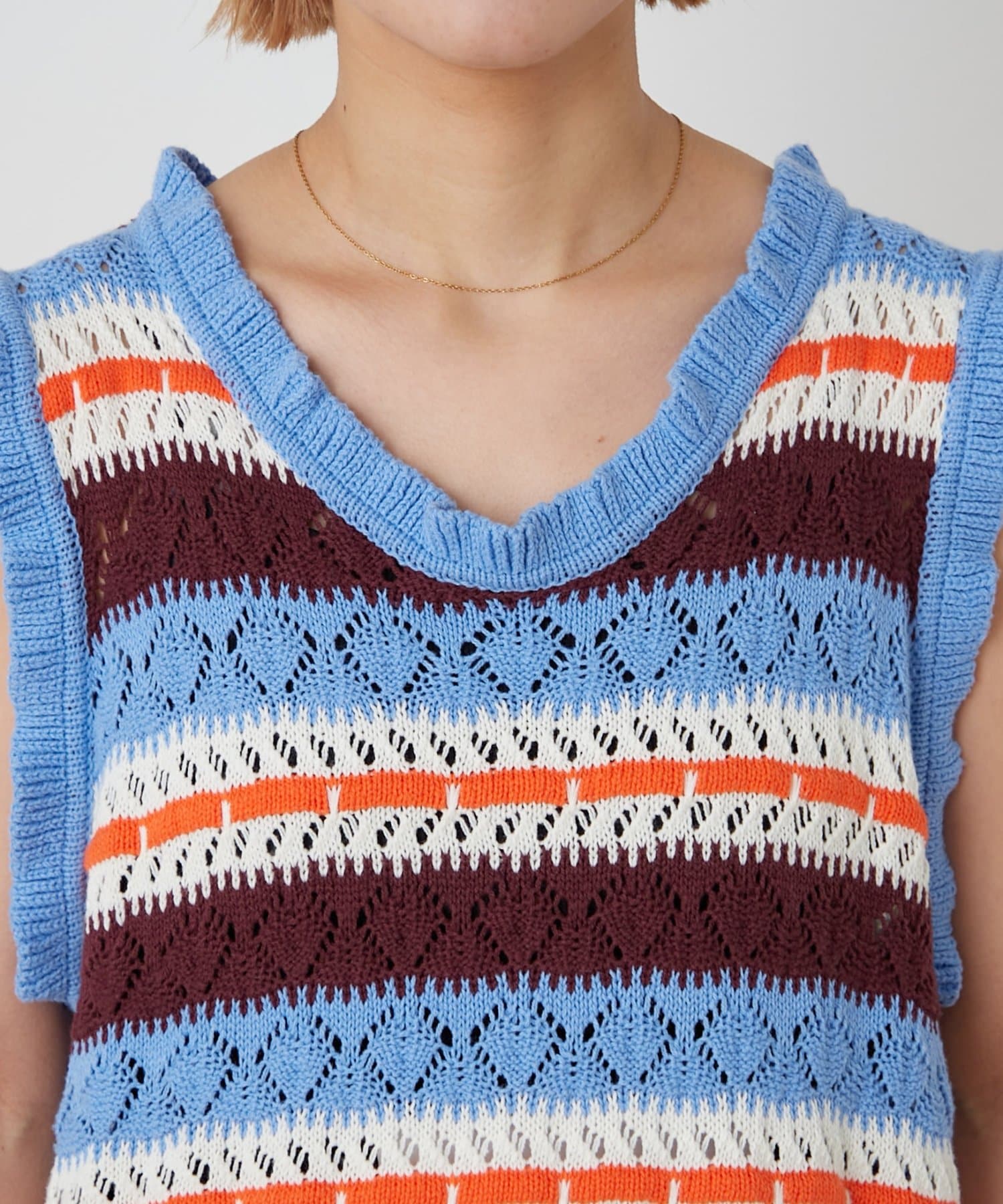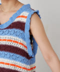 透かし編みで涼しげな印象を与えつつ、フリルがあしらわれていることで、さらにキュートな雰囲気を演出します。