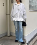 女性っぽいコーデにMIXすることでパーカーでもラフになりすぎず、きれいめな印象にも着れます。