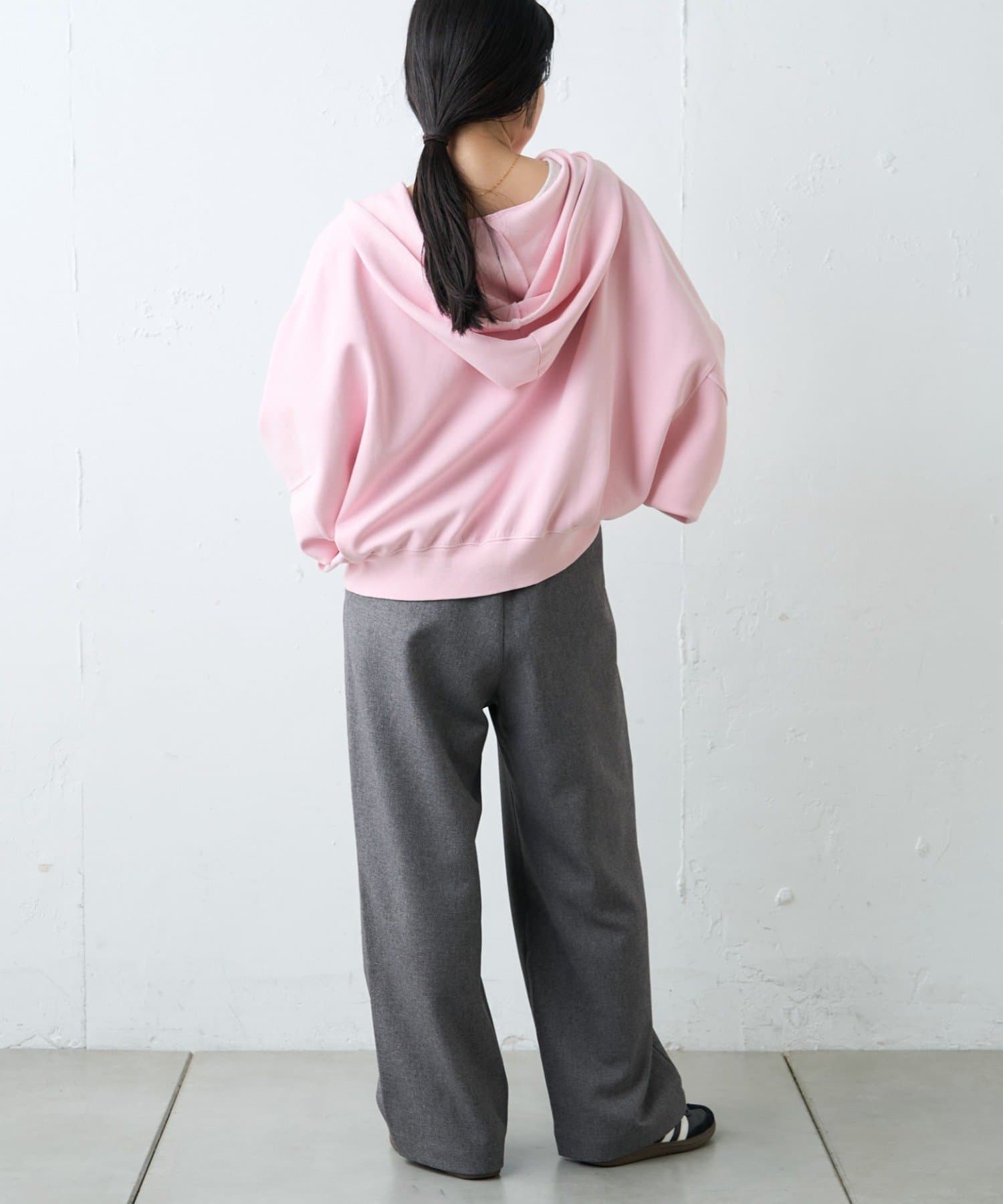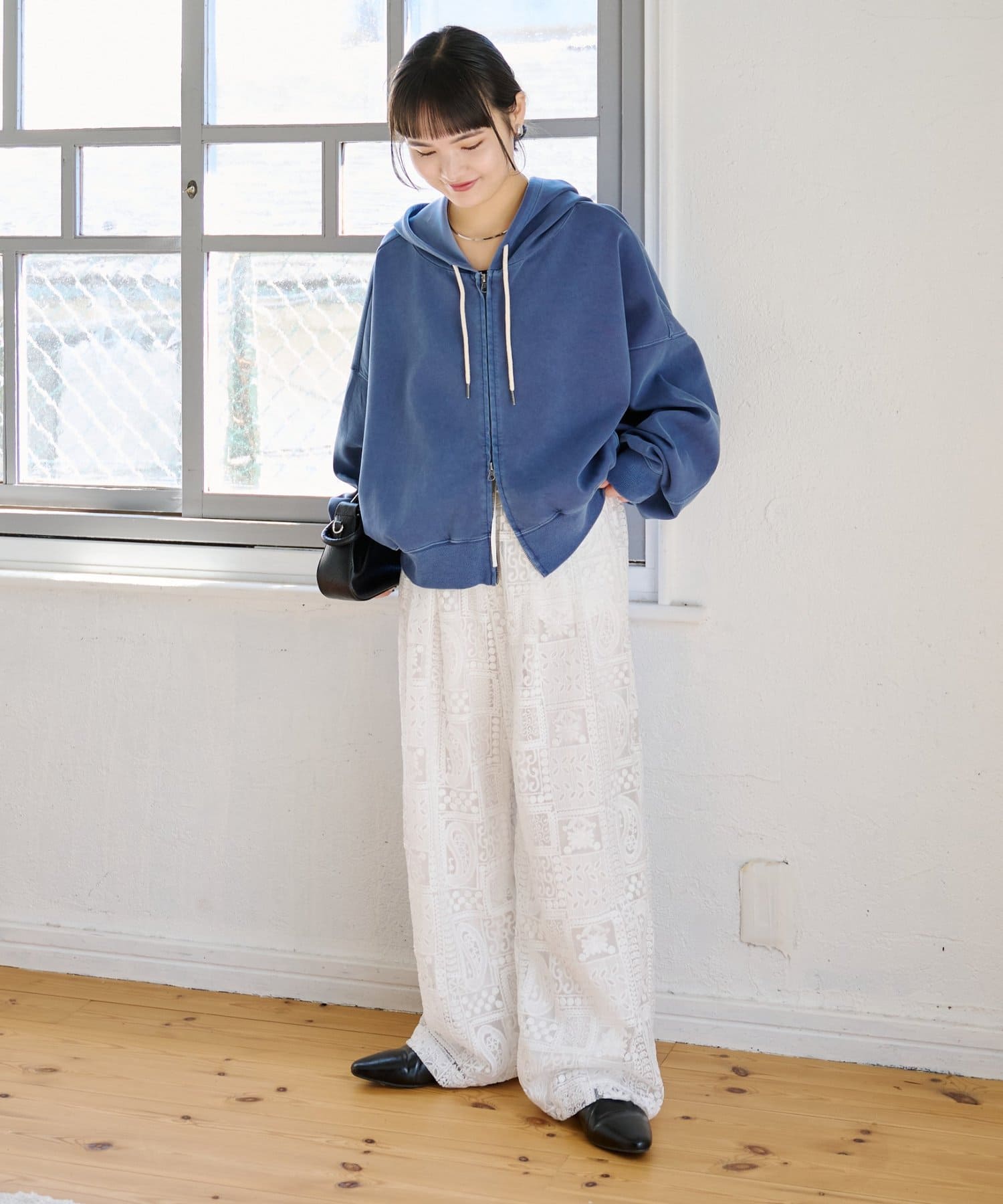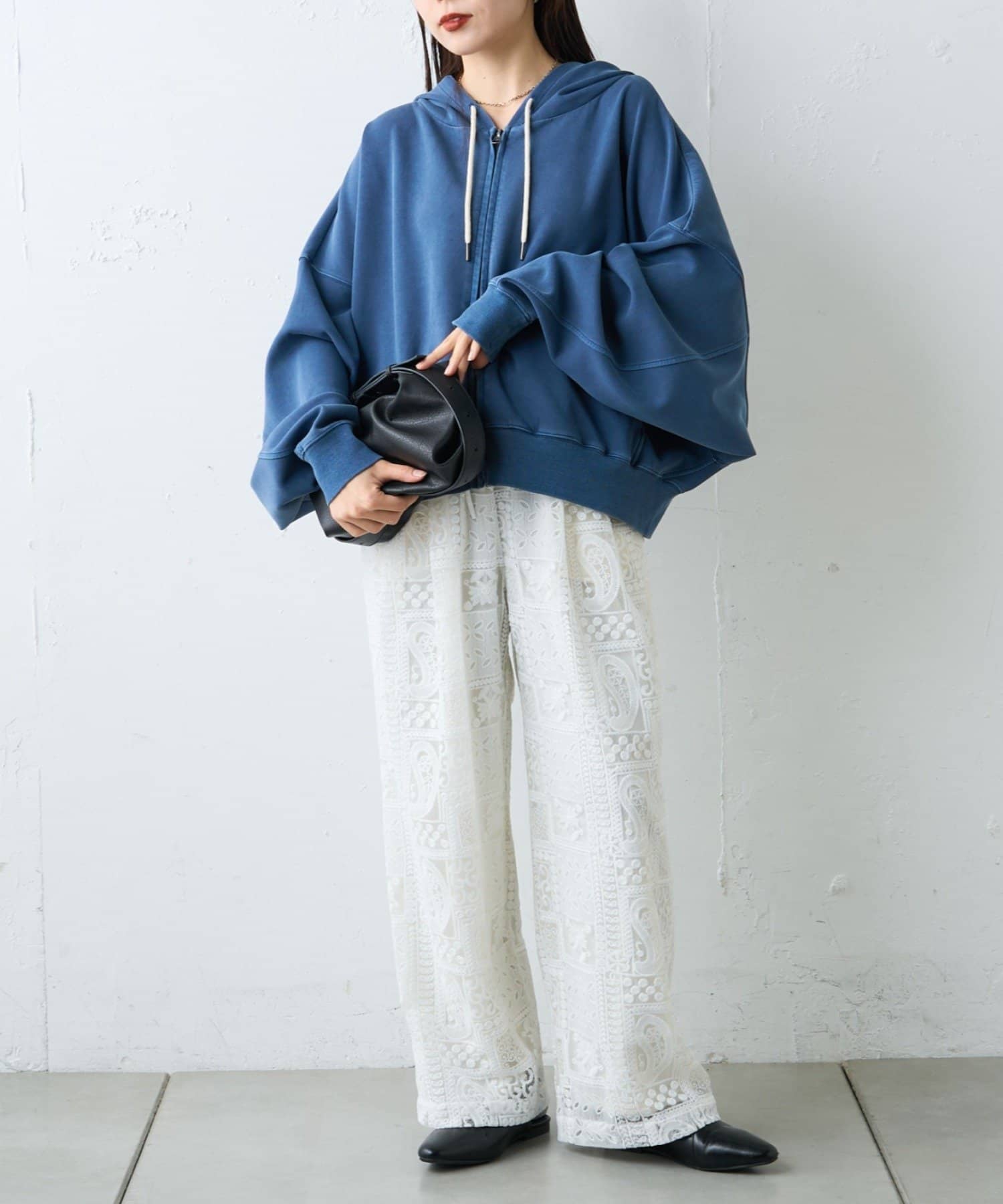 女性っぽいコーデにMIXすることでパーカーでもラフになりすぎず、きれいめな印象にも着れます。