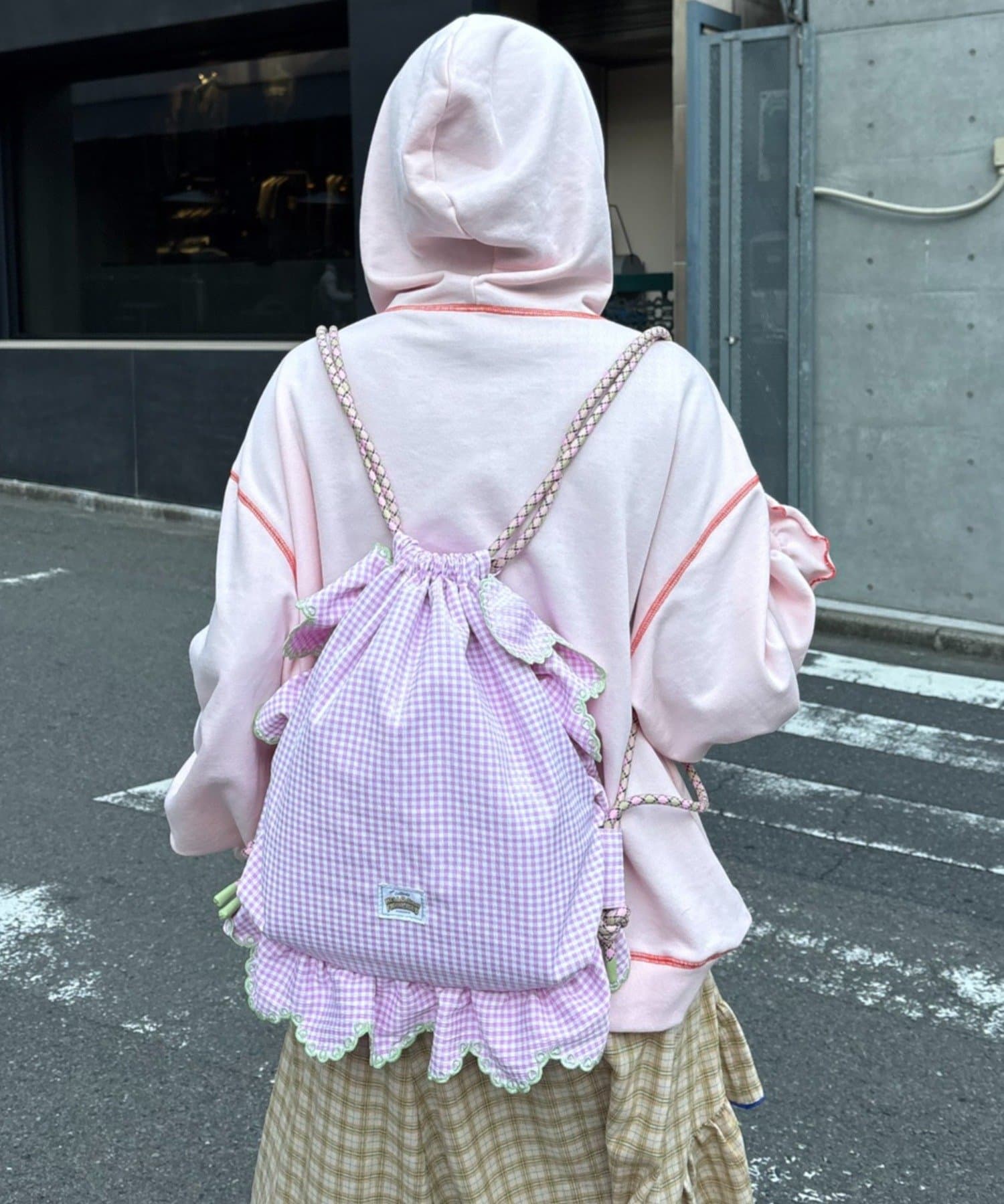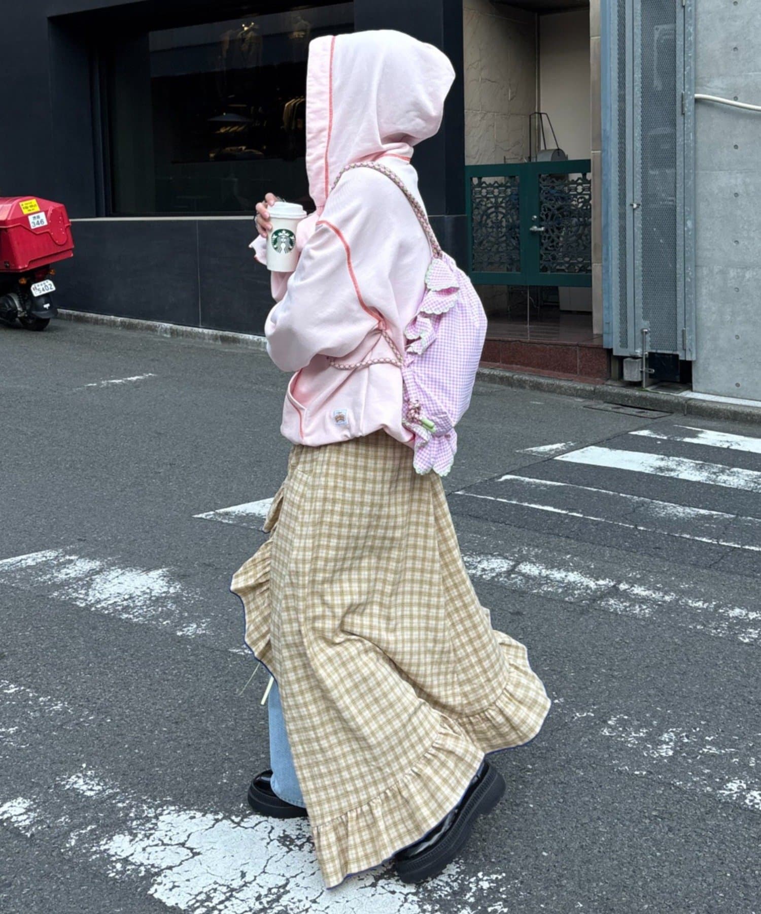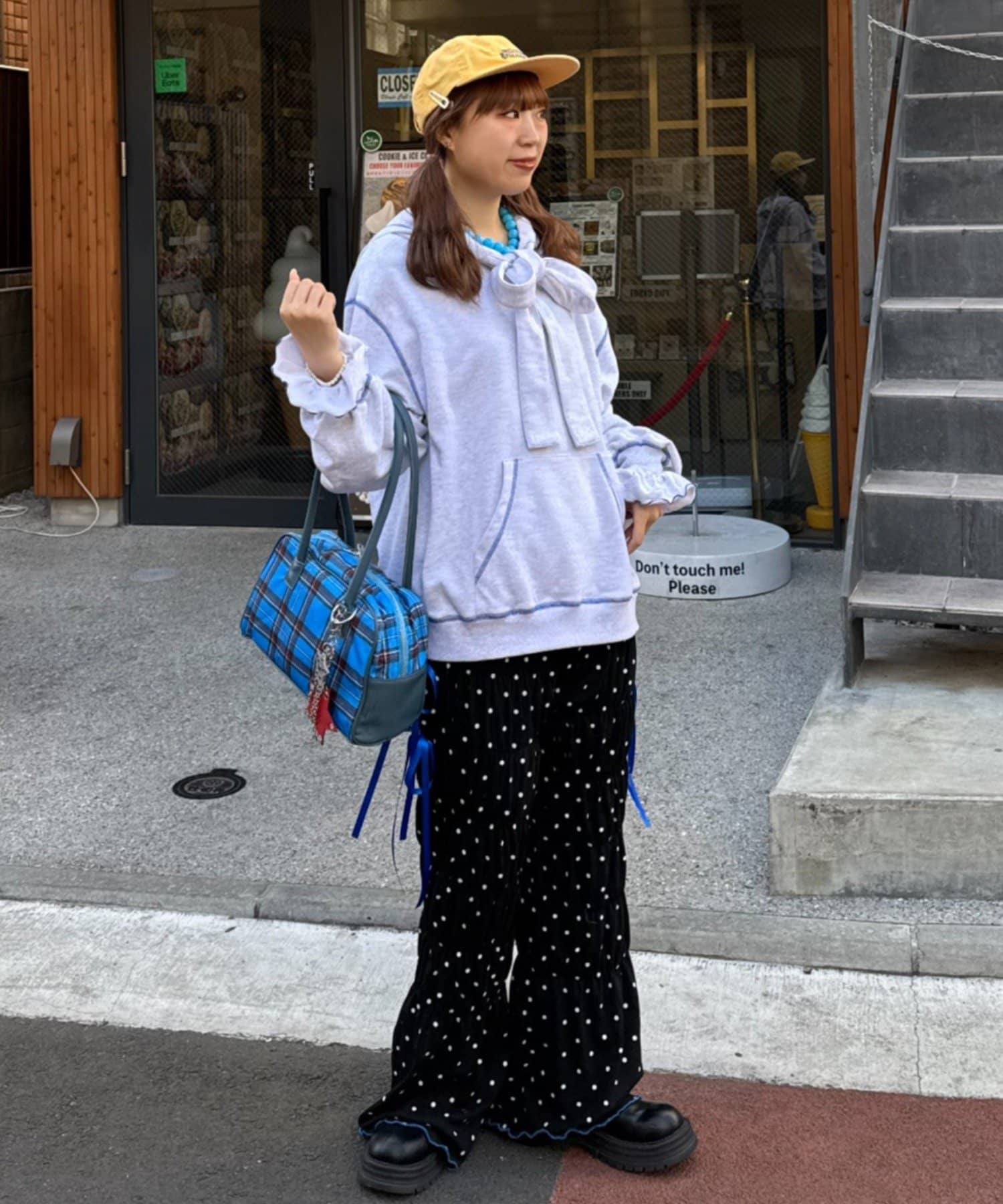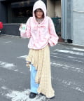 フード付きで、カジュアルながらもガーリーな印象を与えます。