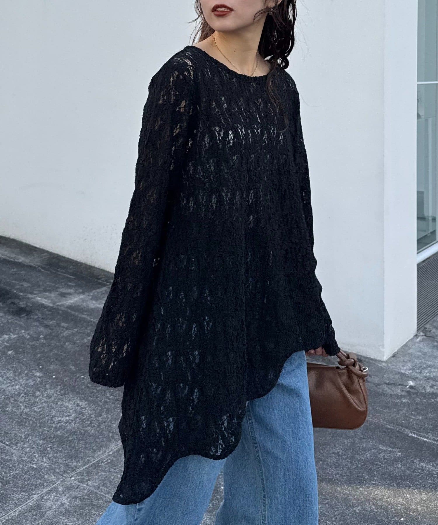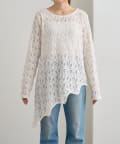 繊細なレース素材を使用し、裾に動きを持たせたアシンメトリーデザインが印象的なチュニック。