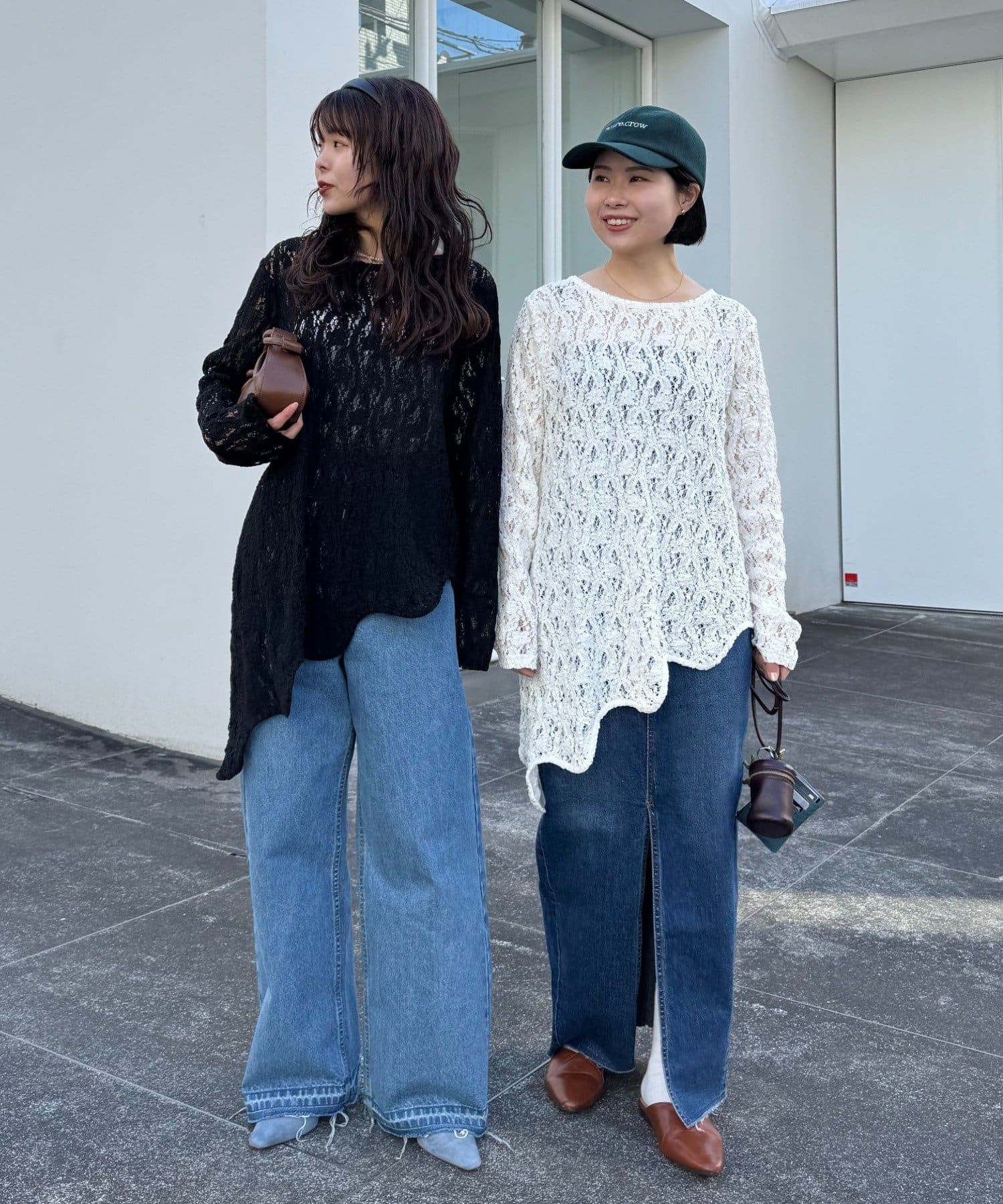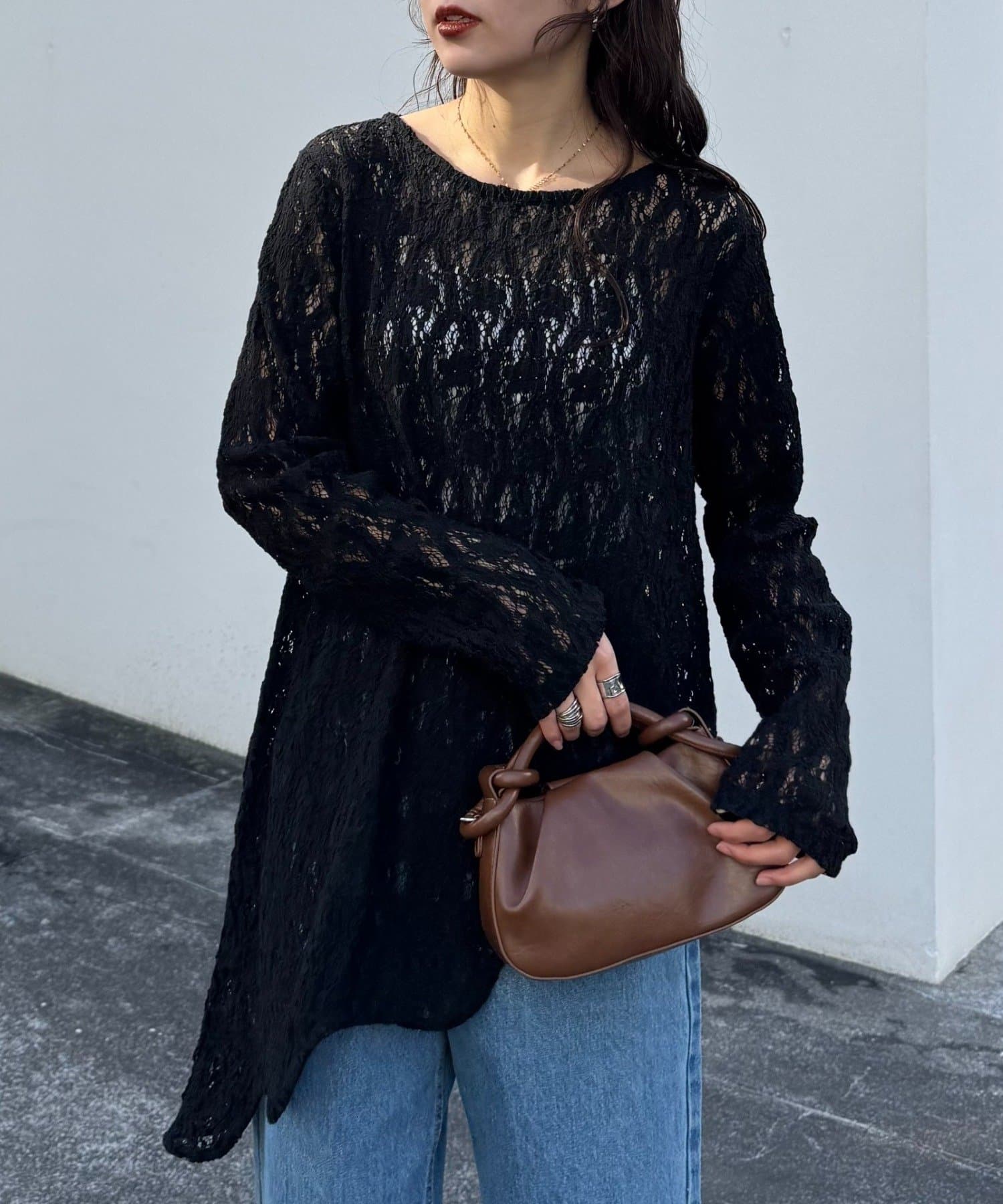デニムやスラックスの上に重ねるだけで、レースの表情が引き立つ大人カジュアルに仕上がります。