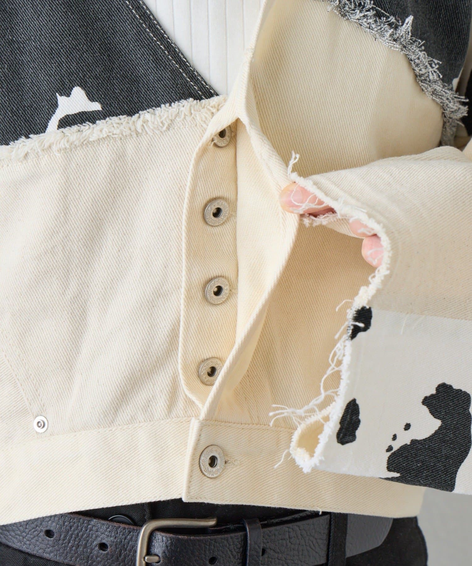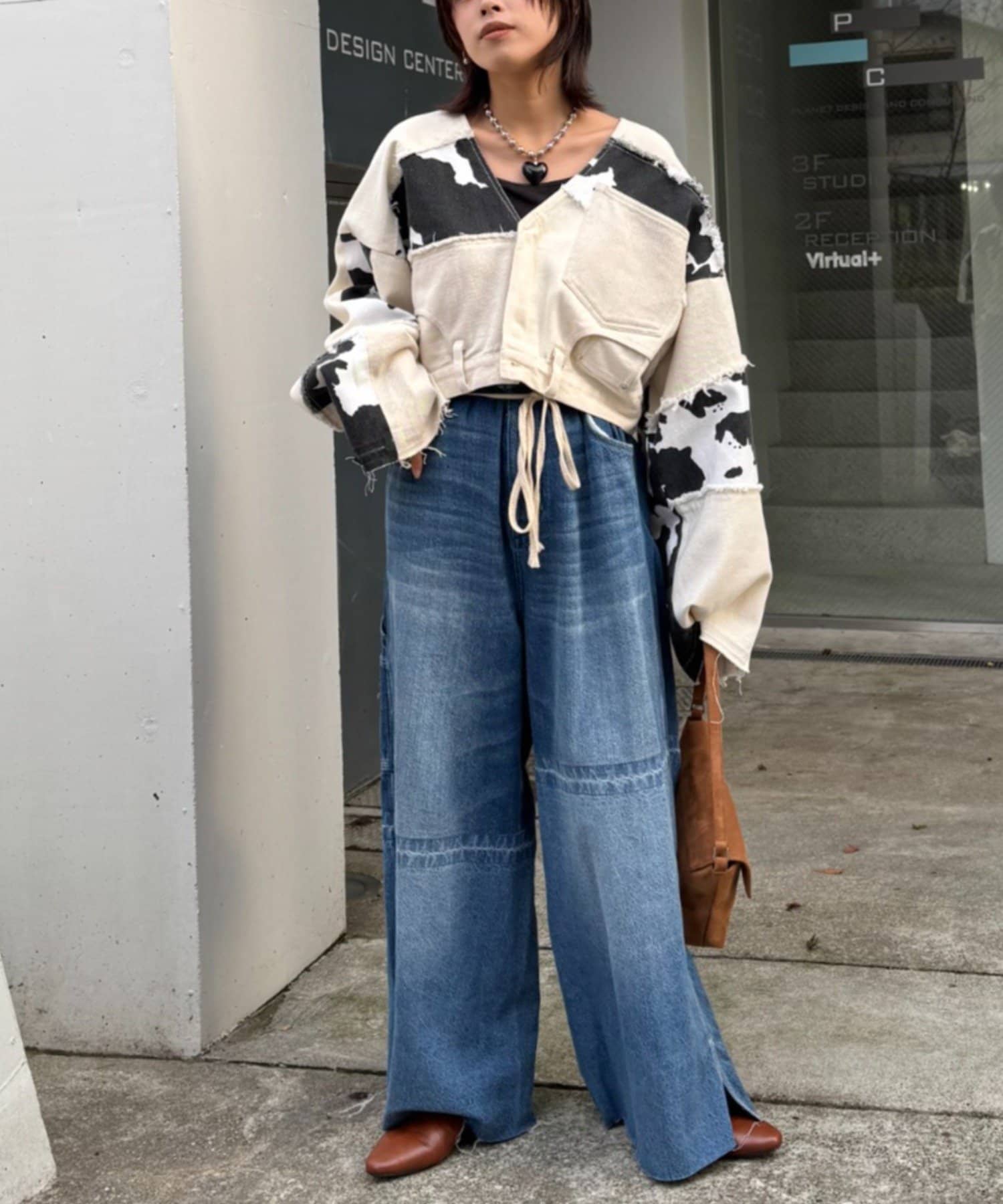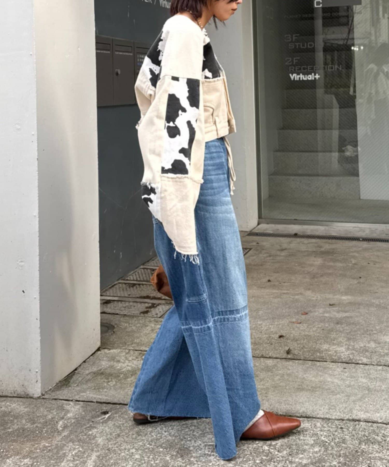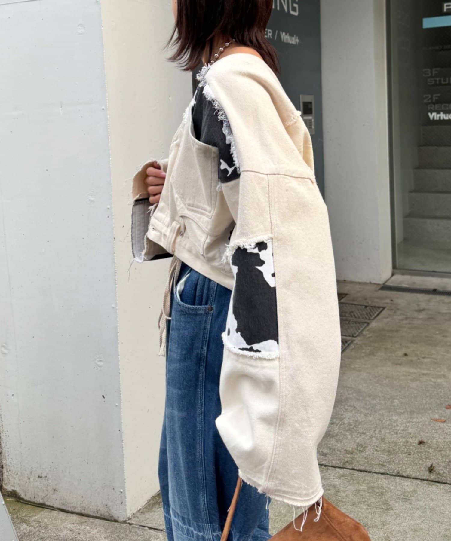 切りっぱなしのディテールやデニムをリメイクしたデザインが、こなれ感を演出。