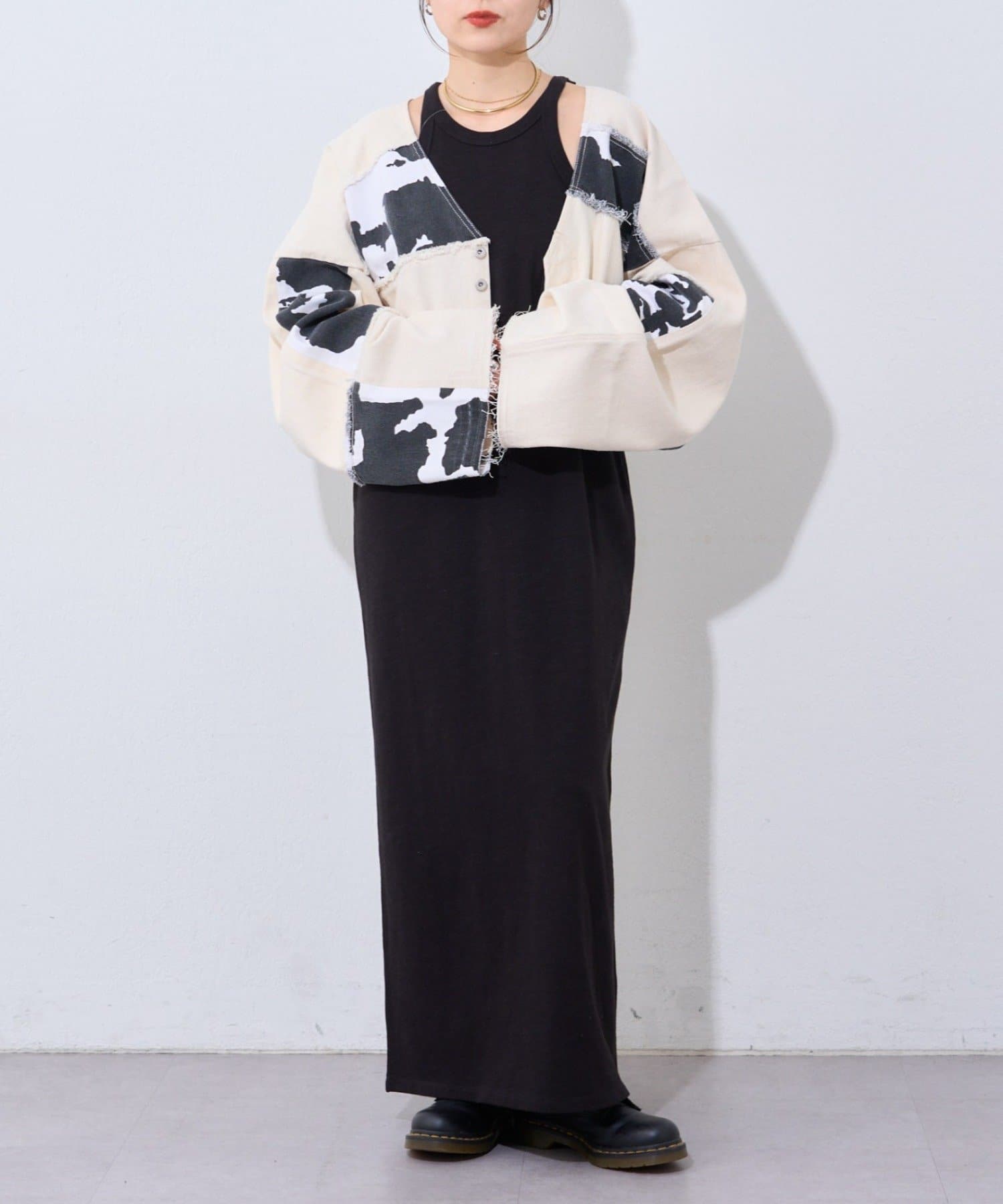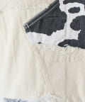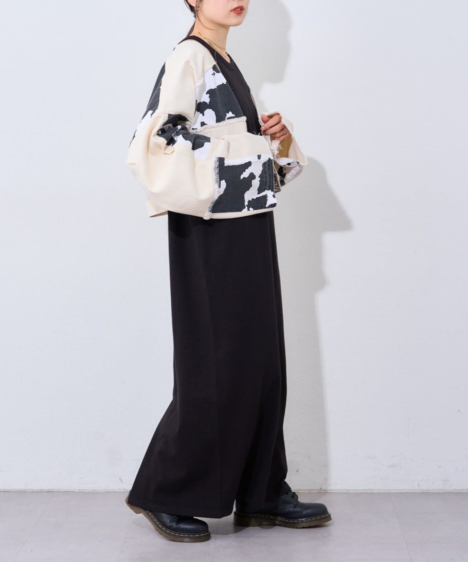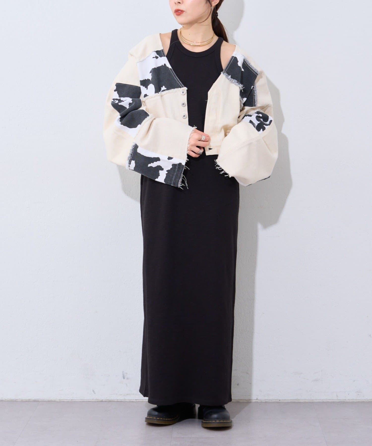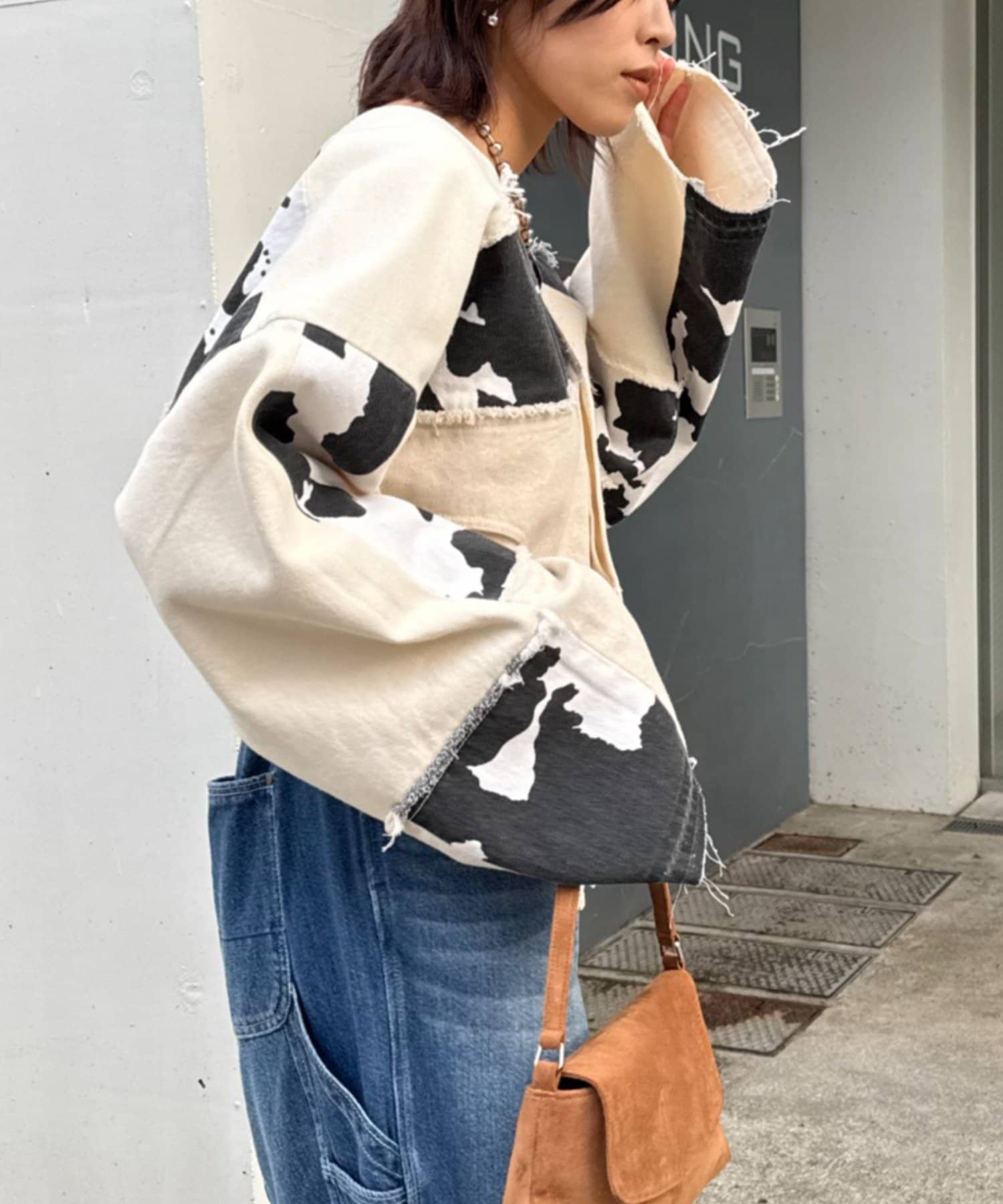 切りっぱなしのディテールやデニムをリメイクしたデザインが、こなれ感を演出。
