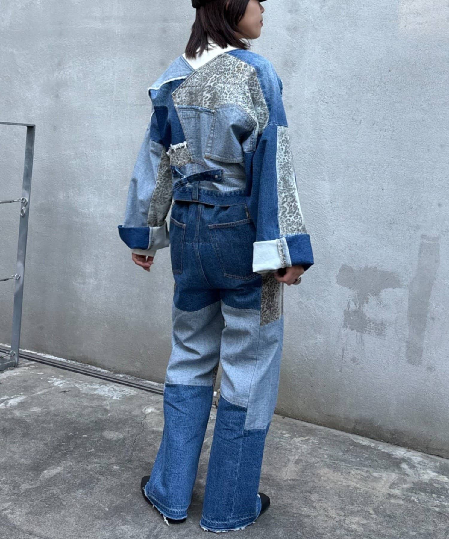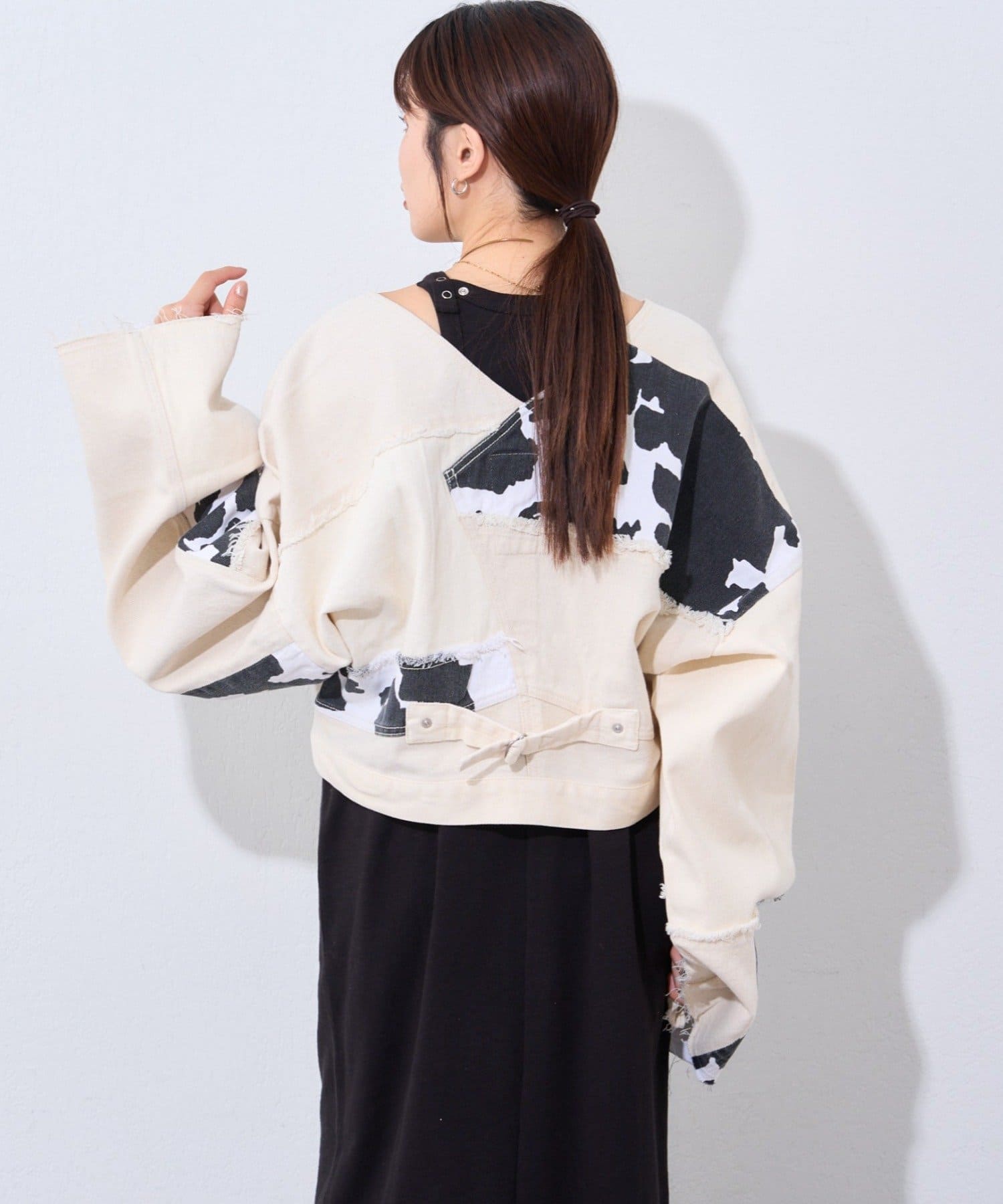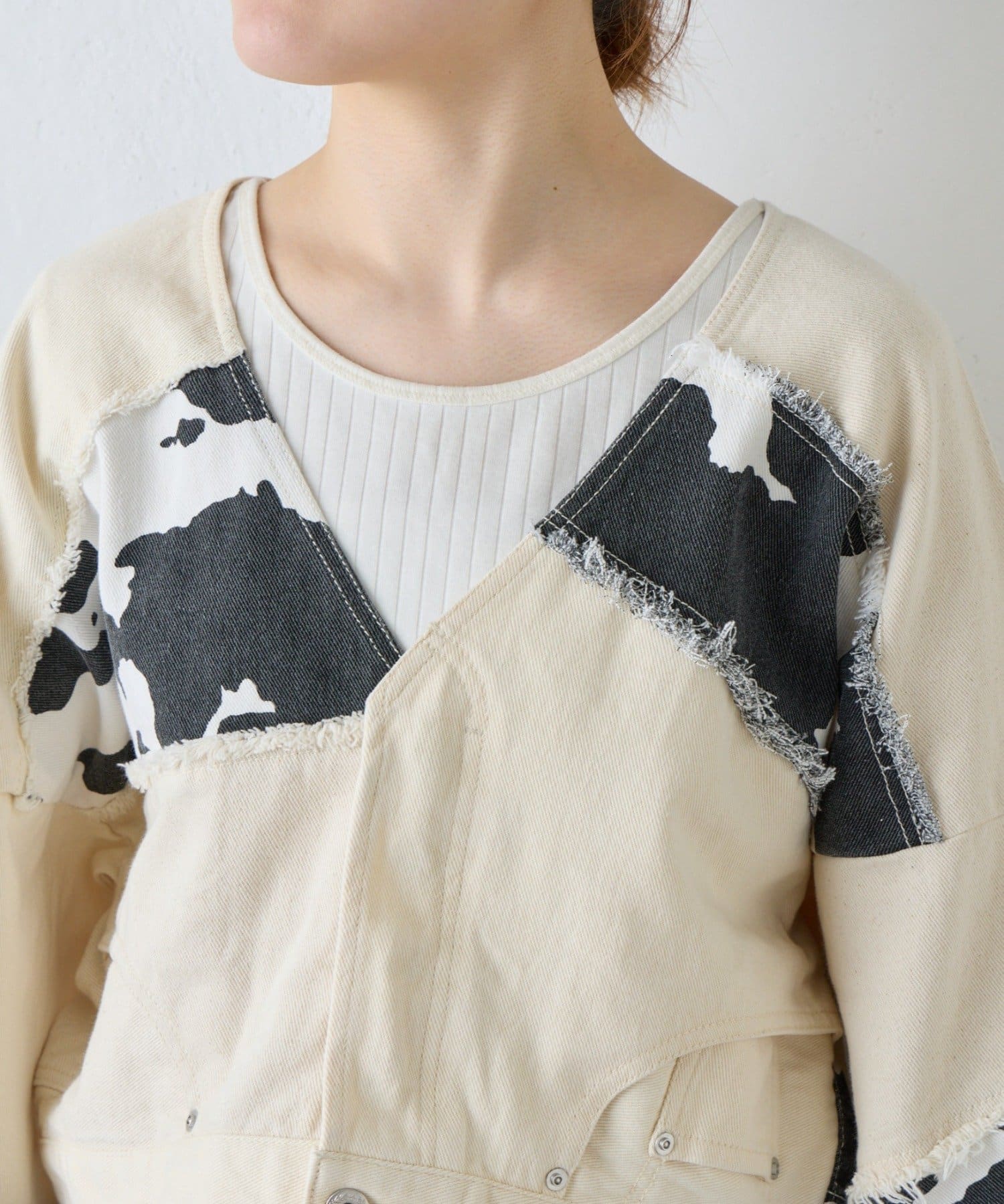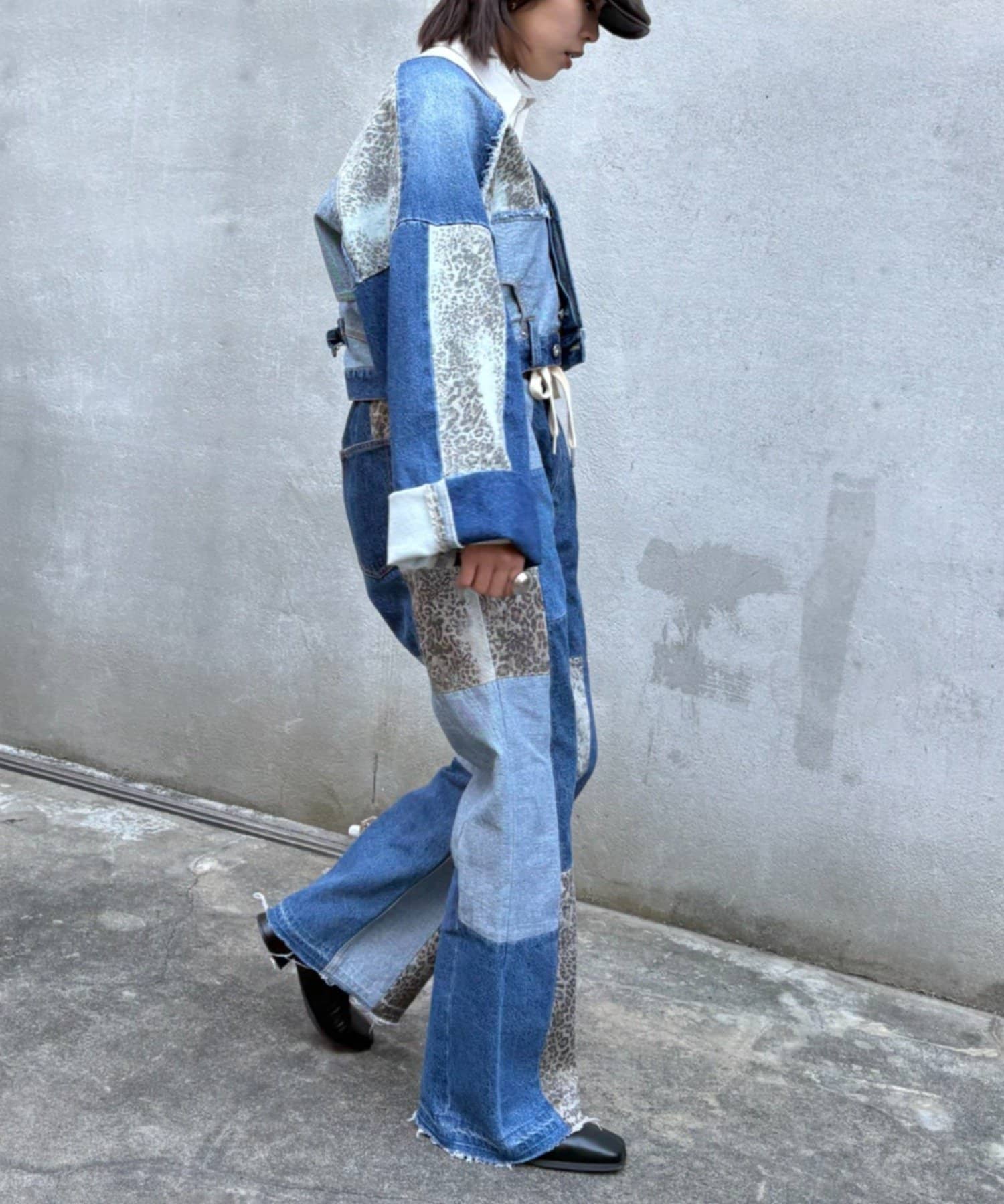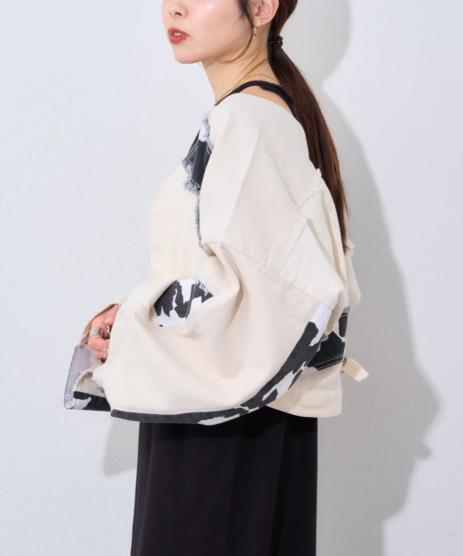 リメイク風のパッチワークデザインが目を引くデニムジャケット。