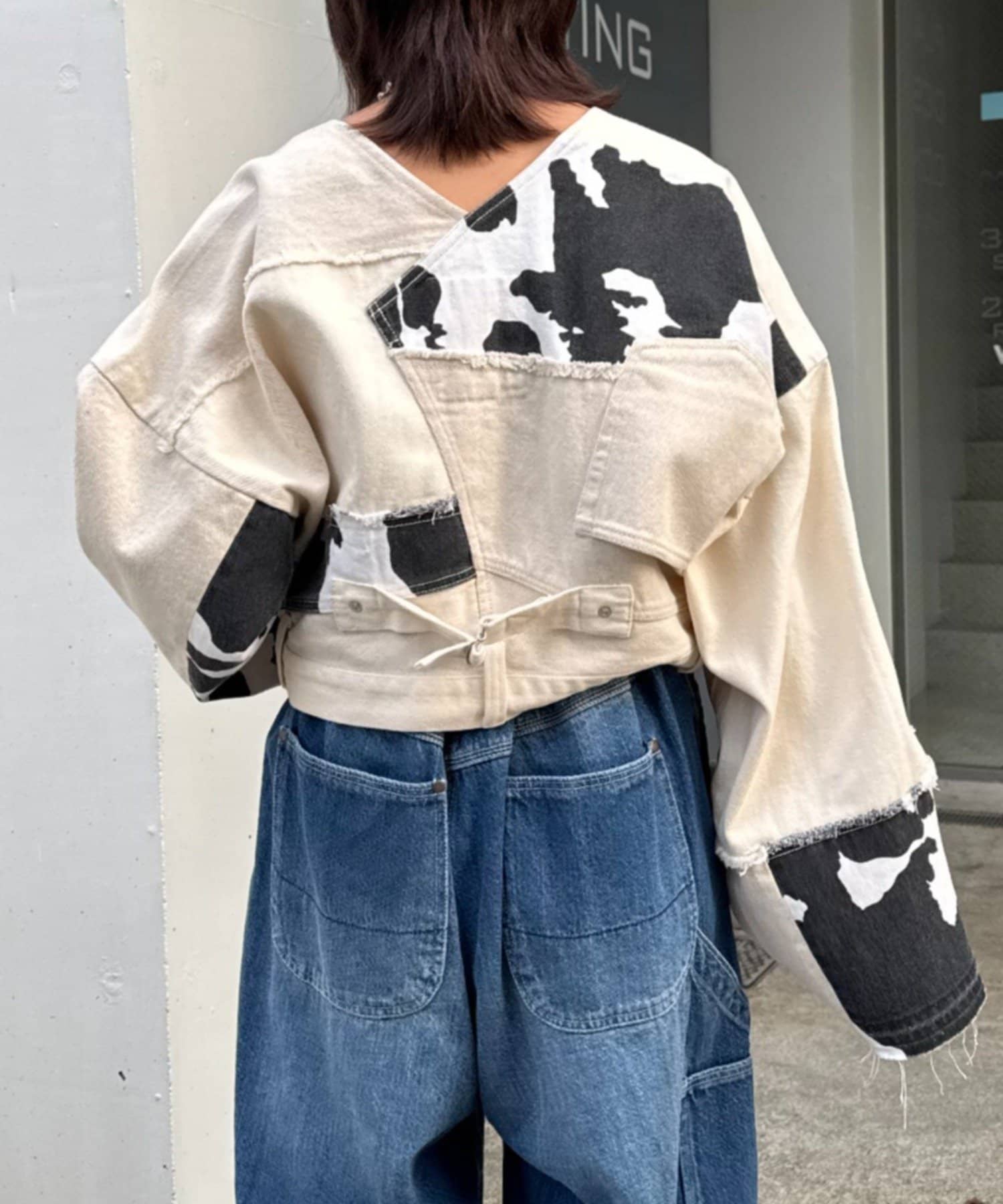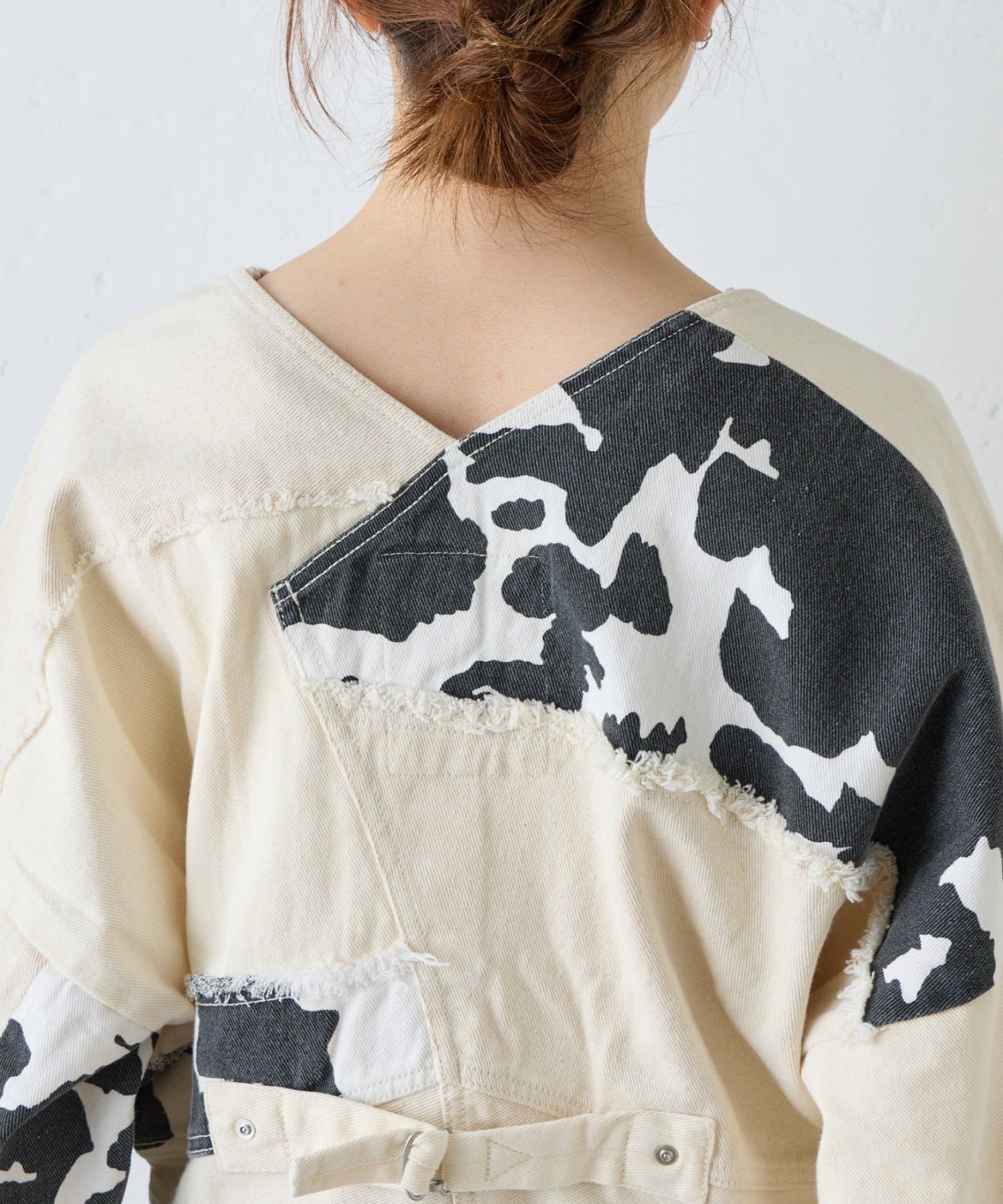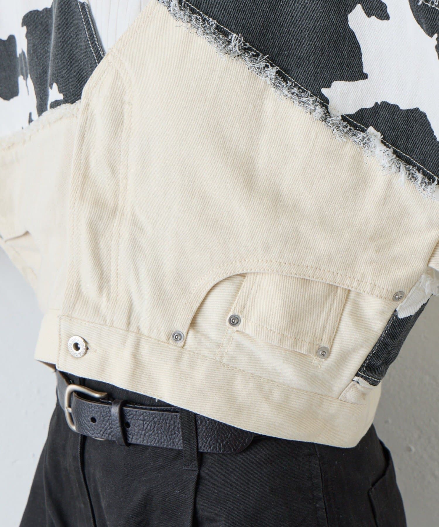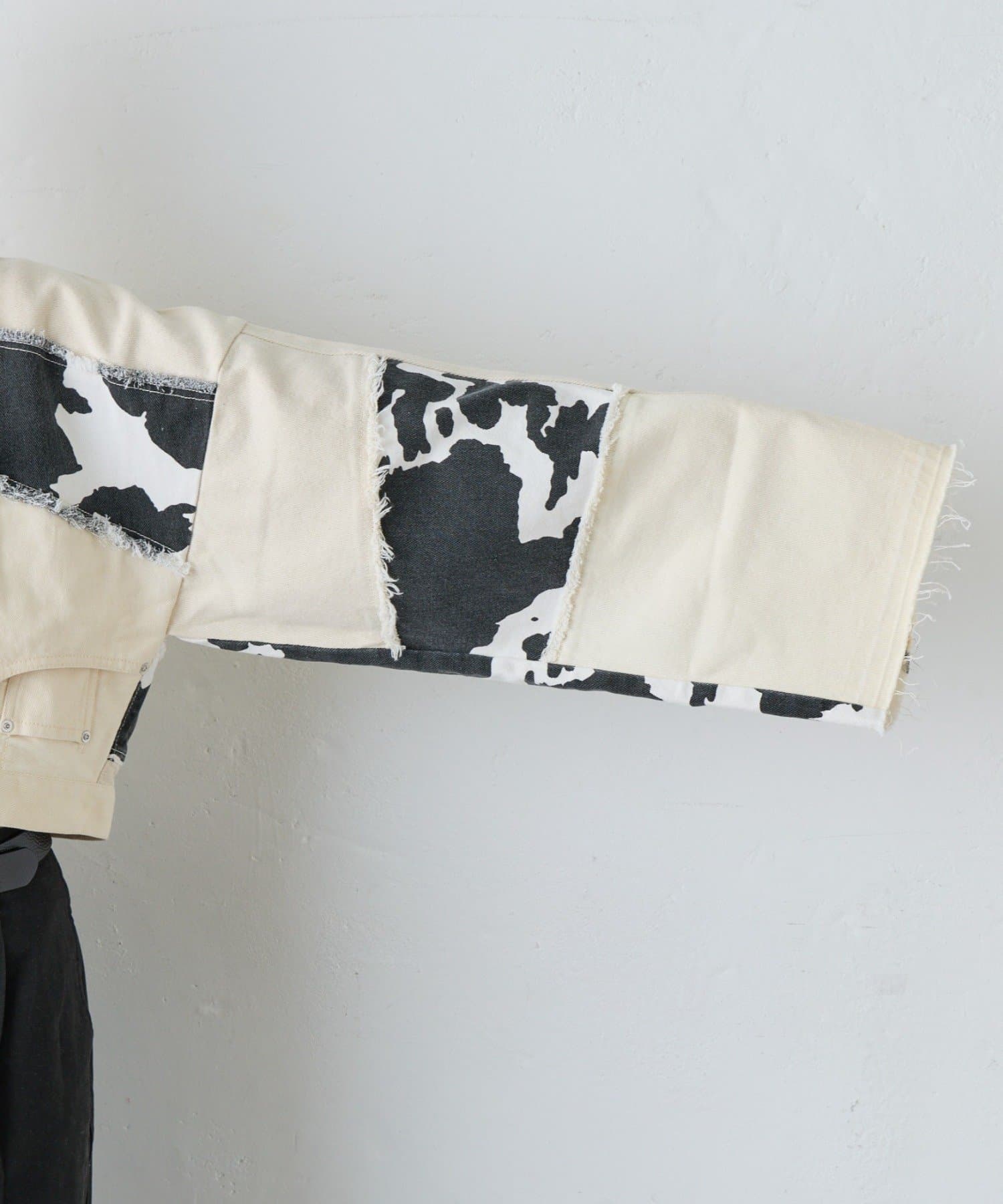 リメイク風のパッチワークデザインが目を引くデニムジャケット。