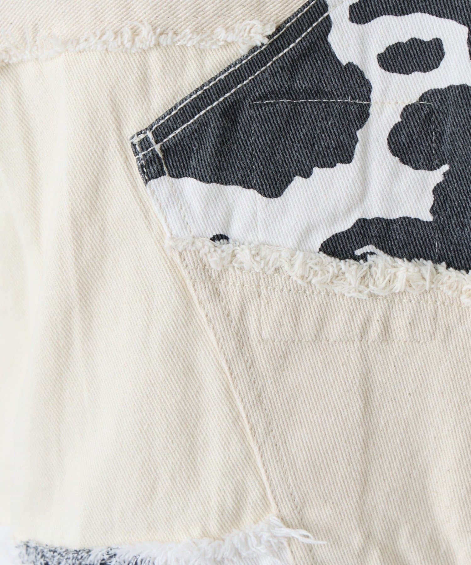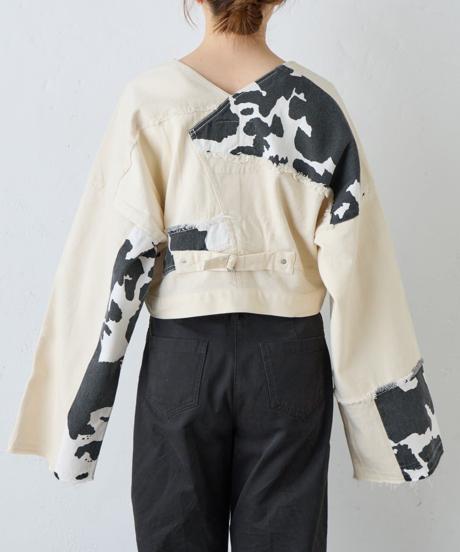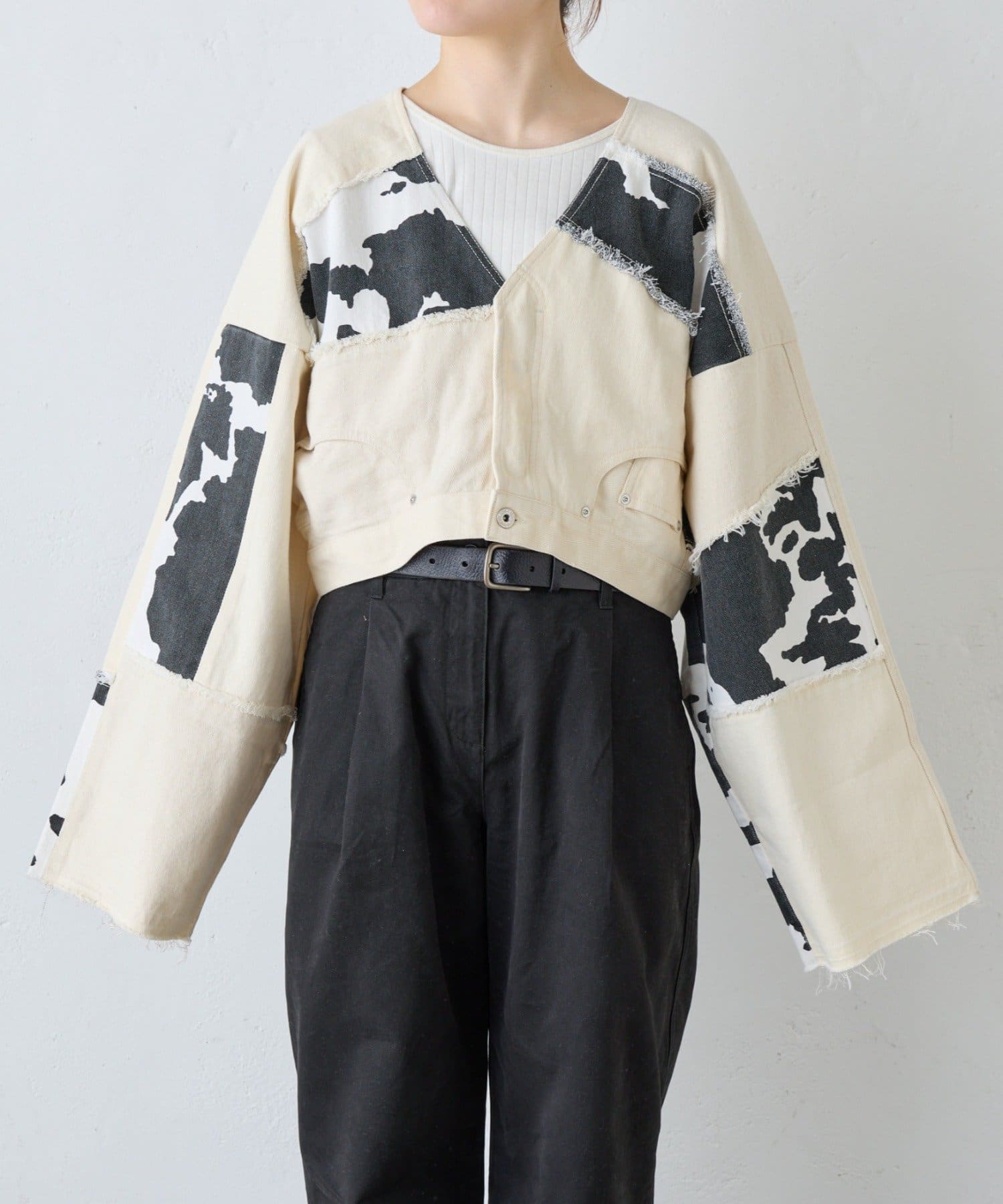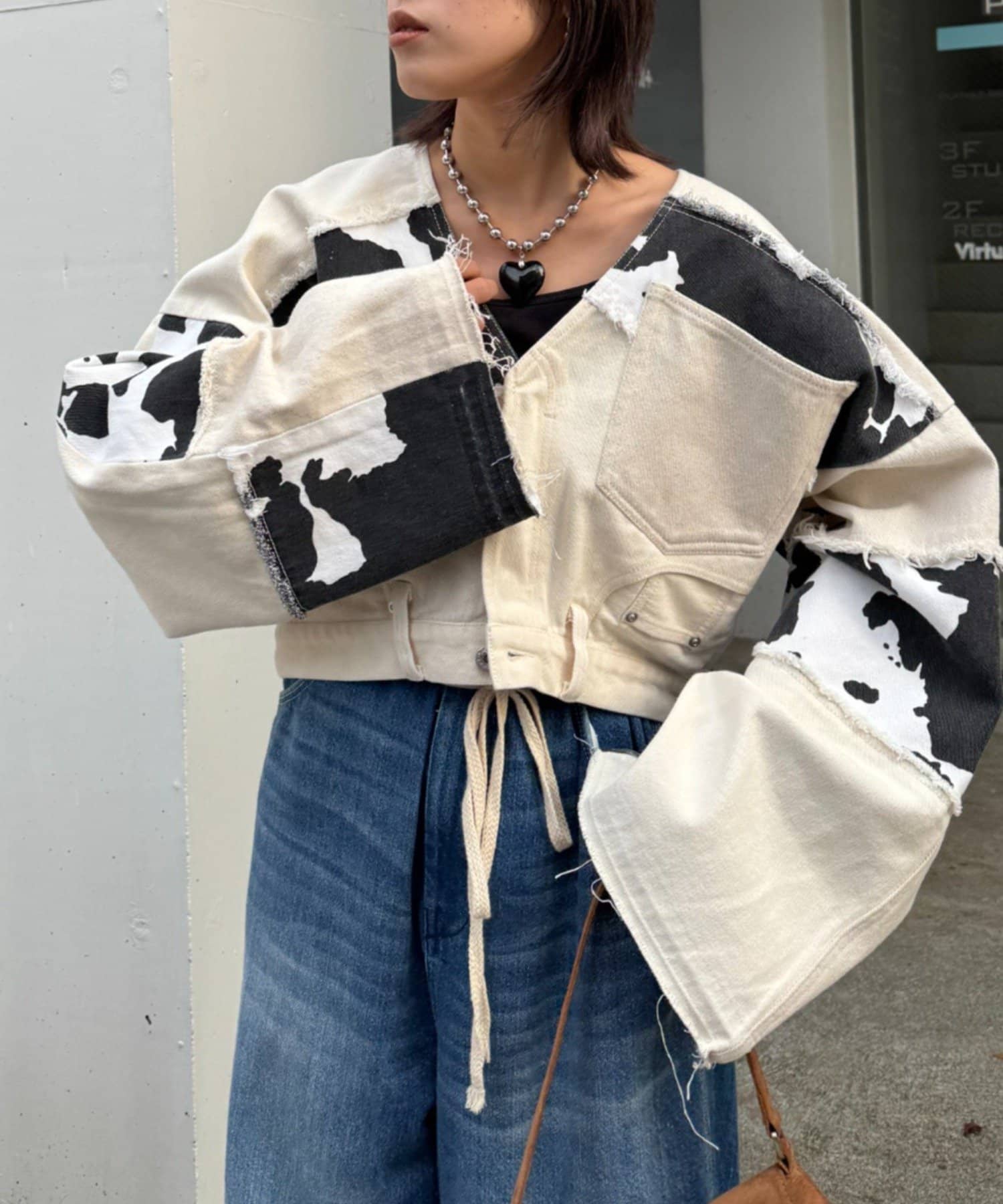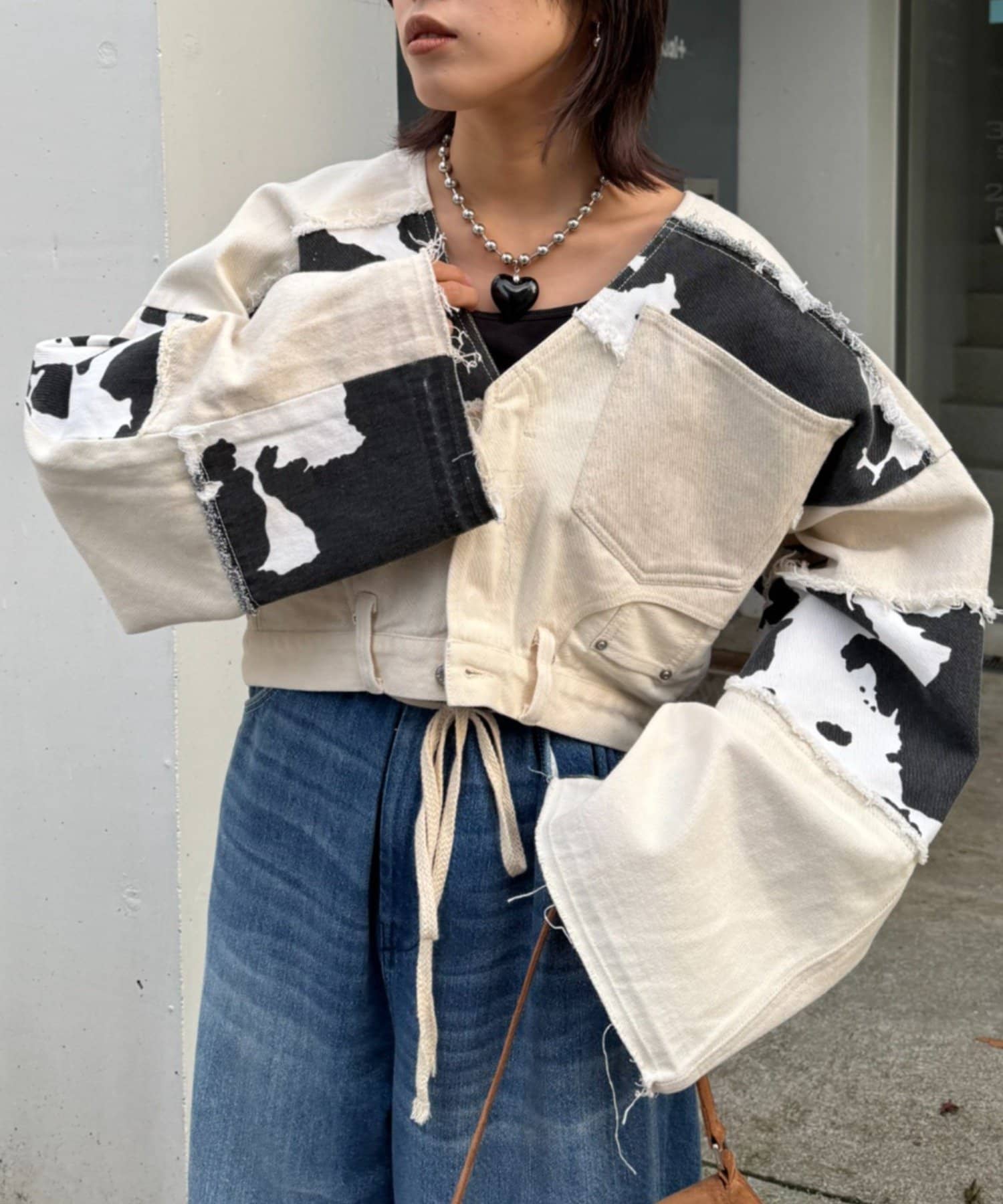 リメイク風のパッチワークデザインが目を引くデニムジャケット。