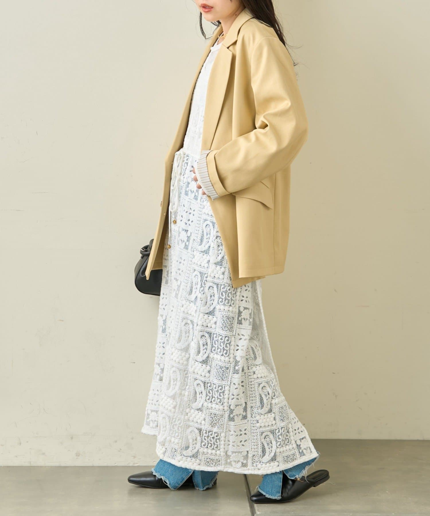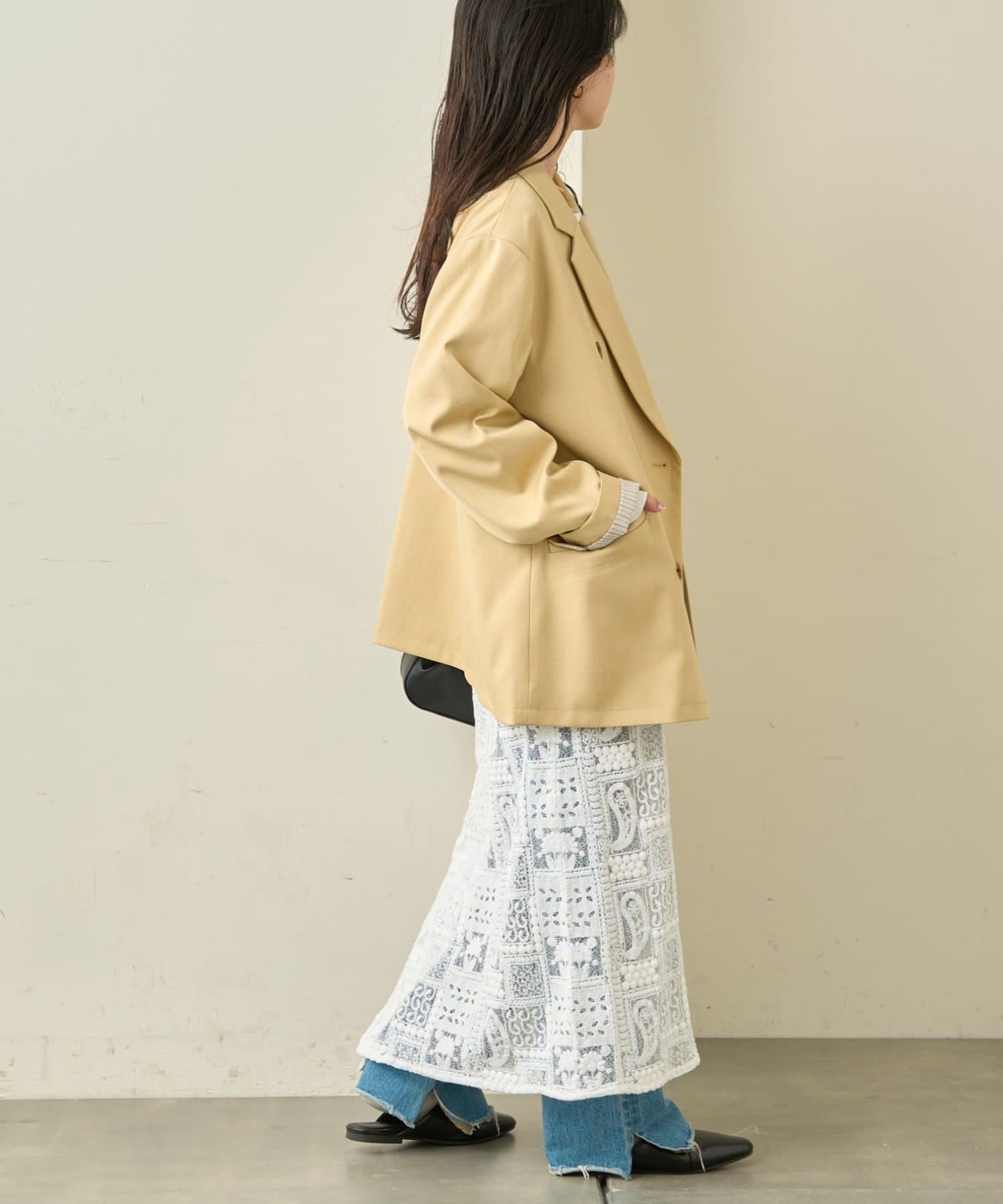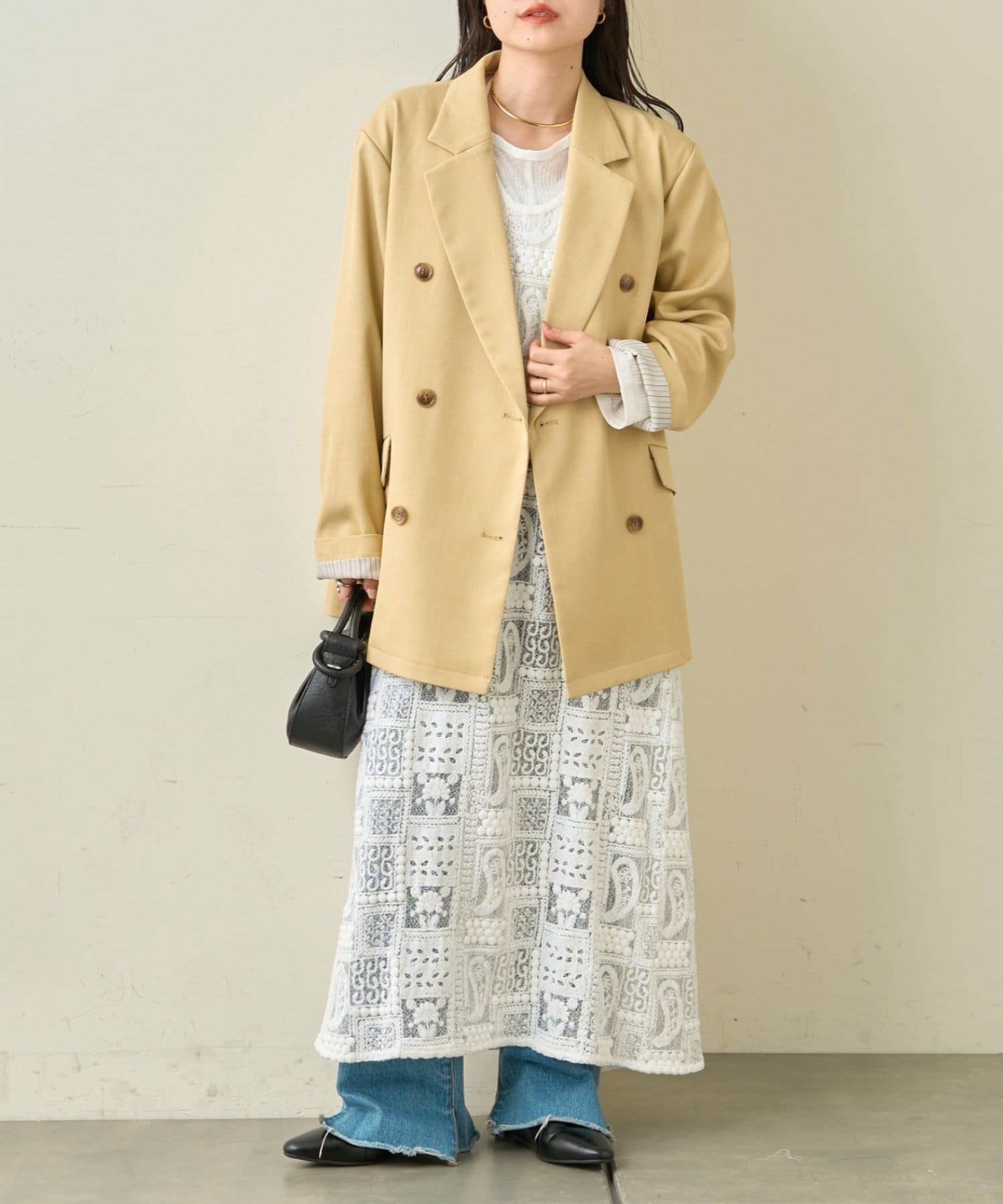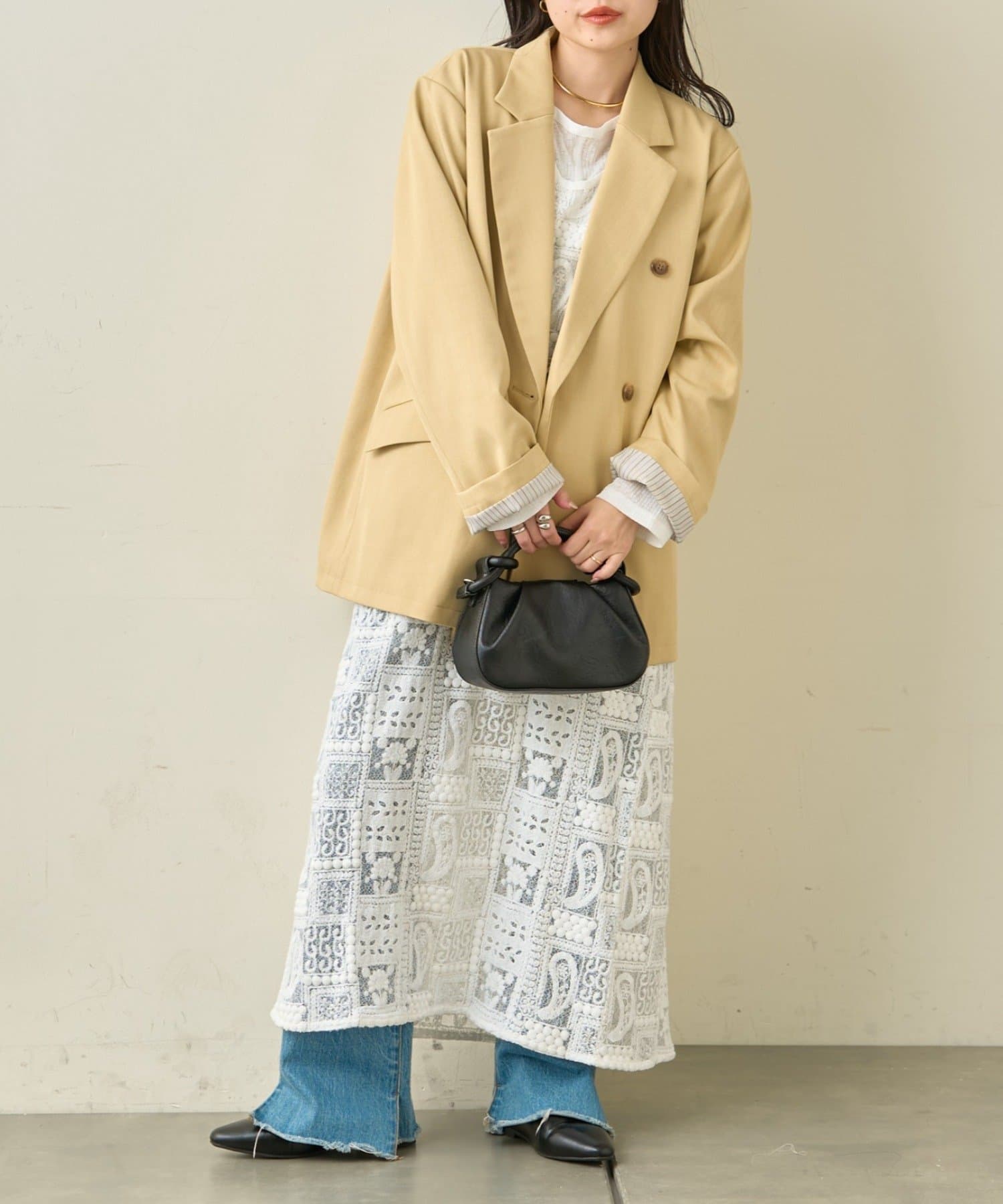 袖は折り返して着られる仕様になっており、手元に抜け感をプラスできるのもポイント。あえてラフに袖をまくることで、かっちりしすぎず、デイリーに取り入れやすい雰囲気になります。オーバーサイズながらも縦のラインがきれいに出るため、着ぶくれしにくく、パンツにもスカートにも合わせやすい一着。通勤から休日のお出かけまで幅広く活躍する、ワードローブにあると心強いレディースジャケットです。