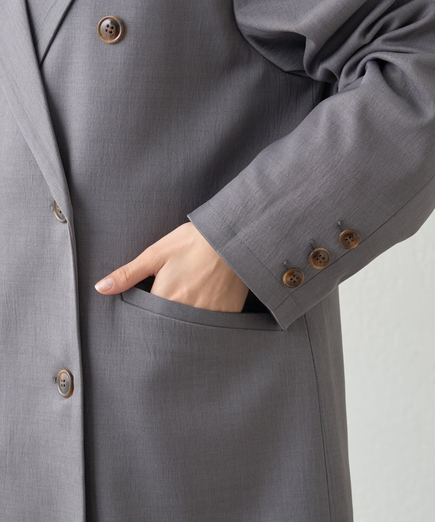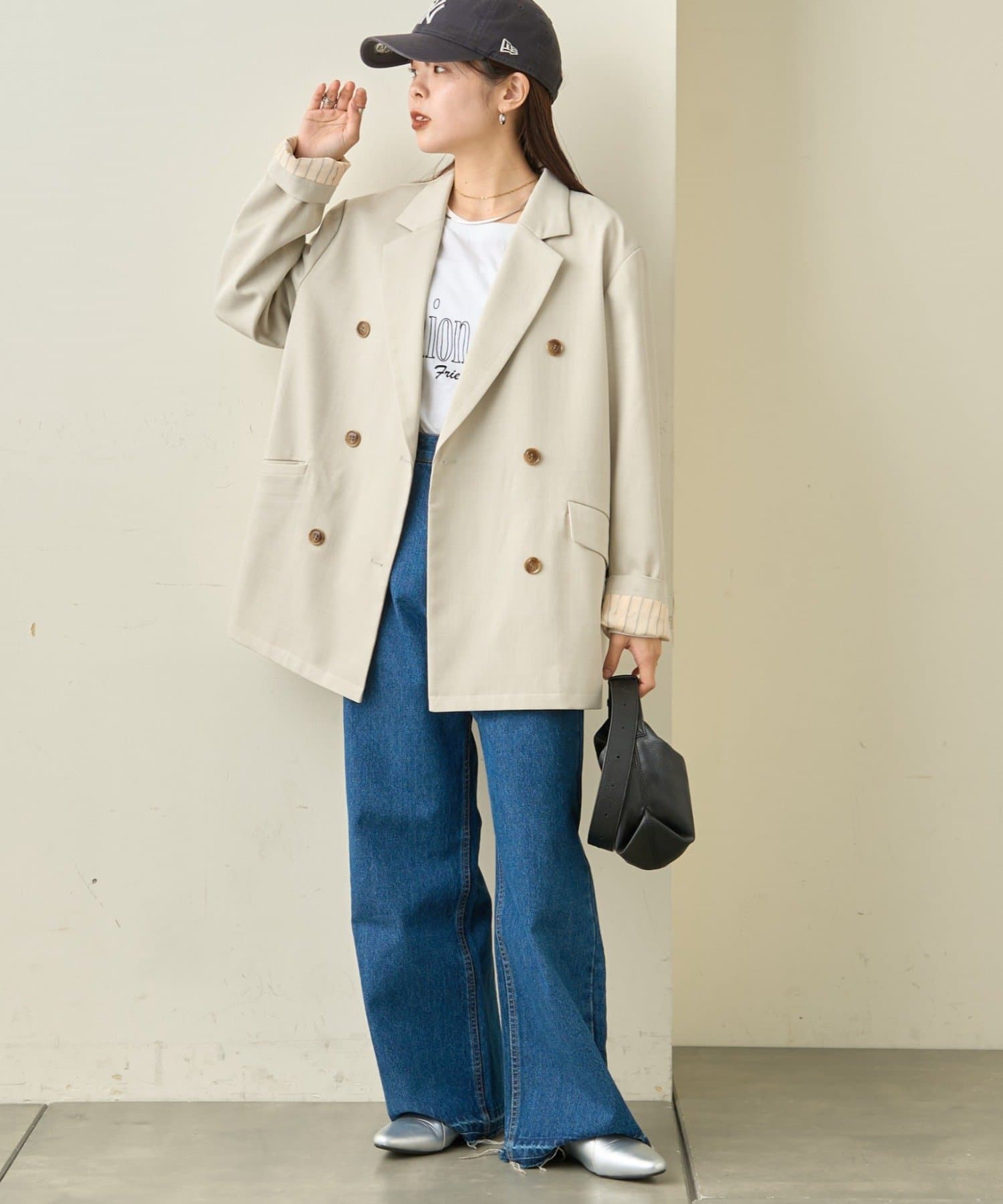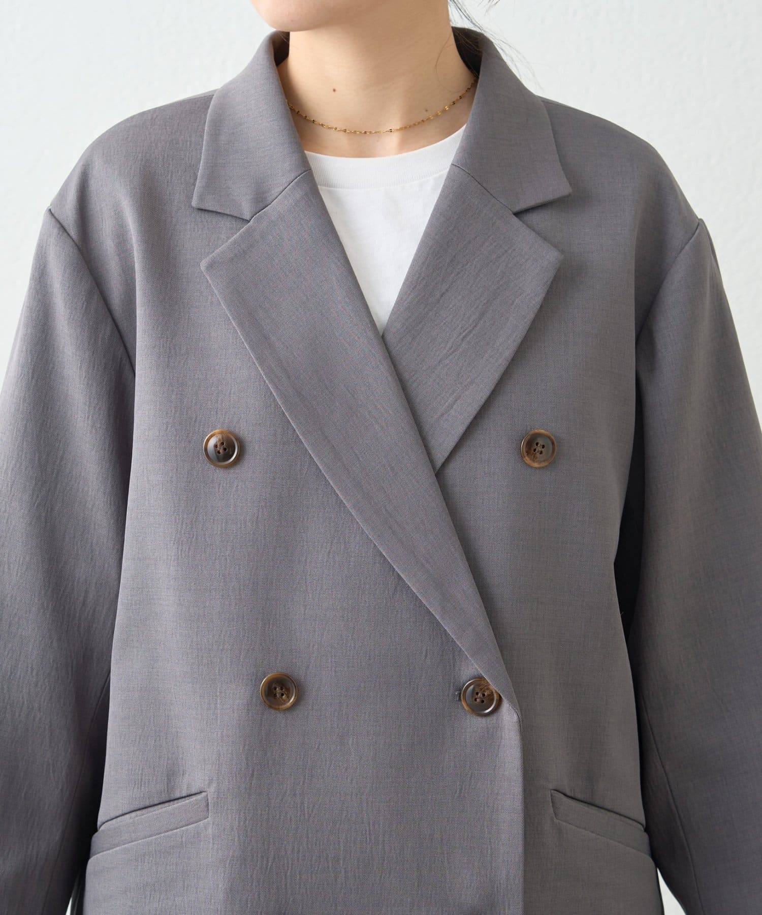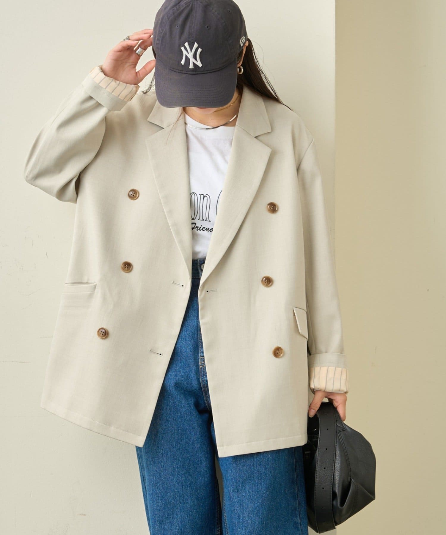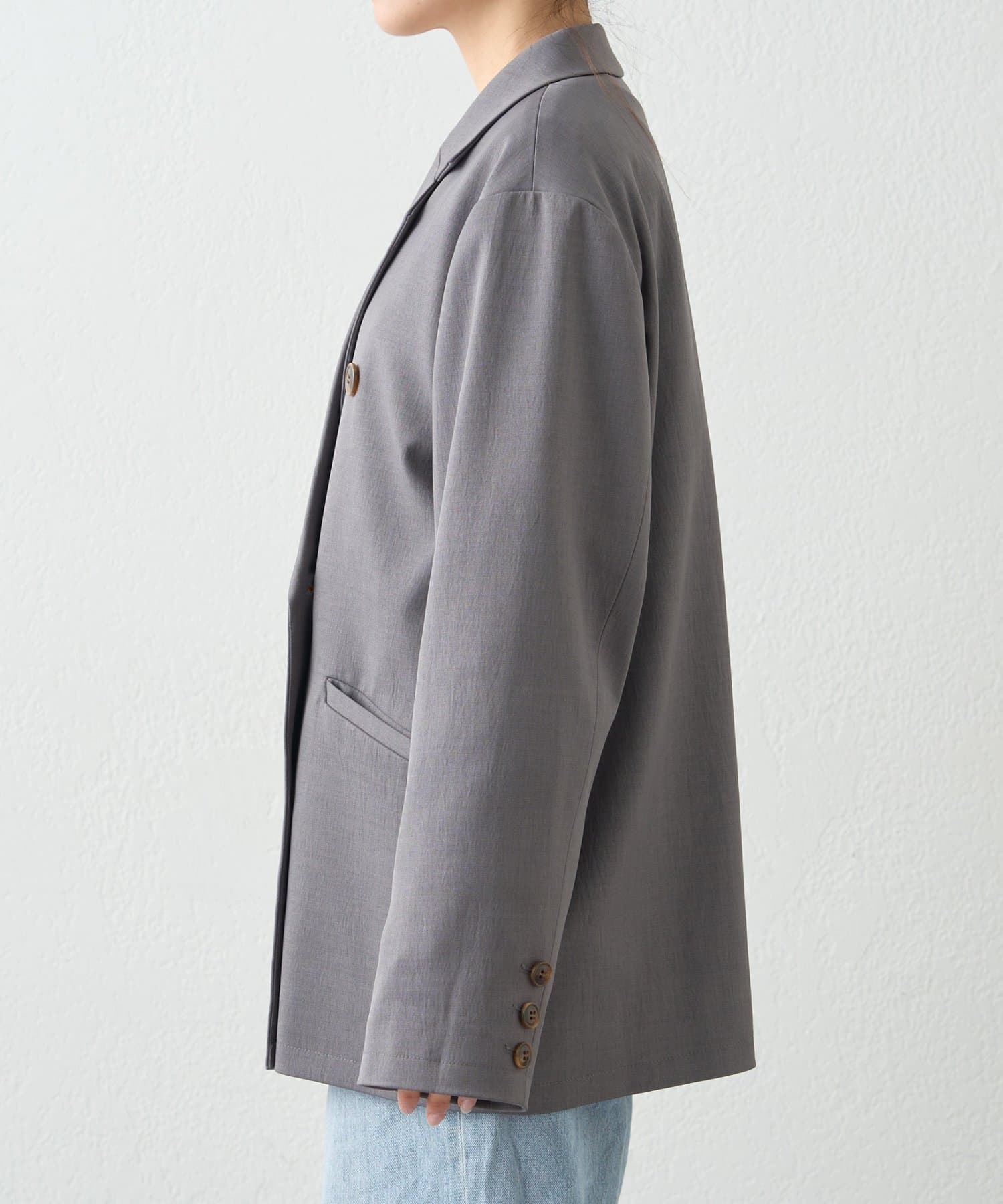 ほどよく肩を落としたオーバーサイズシルエットが今の気分にぴったりな、ダブル仕様のテーラージャケットです。きちんと感のある襟元は、先がシャープに折れたデザインを採用し、顔まわりをすっきりと見せてくれます。メンズライクな雰囲気を持ちながらも、全体のバランスは女性が着やすいように調整されており、羽織るだけでこなれた印象に仕上がります。