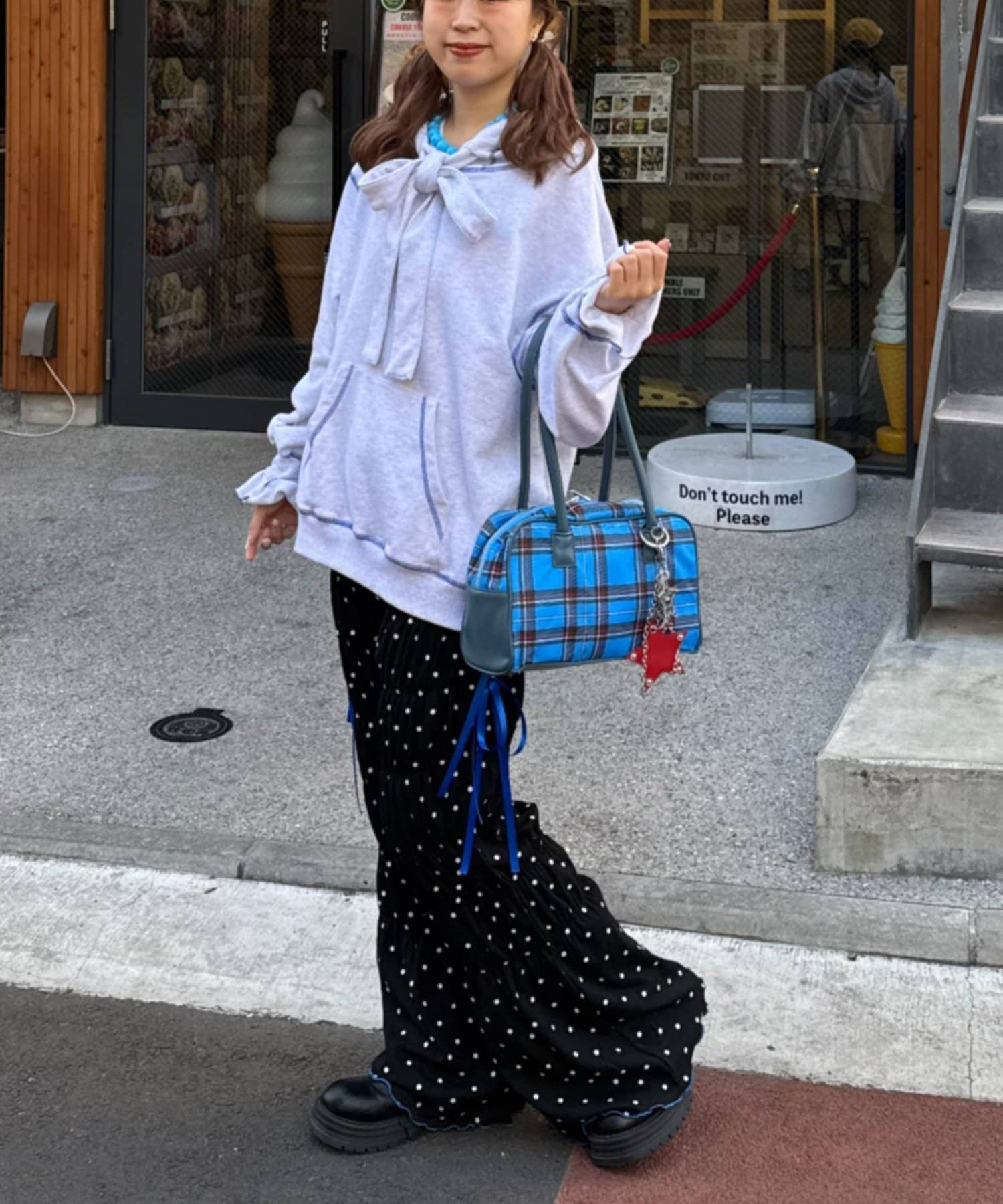 また、トップスをインして、ウエストのリボンをアクセントにする着こなしも素敵です。