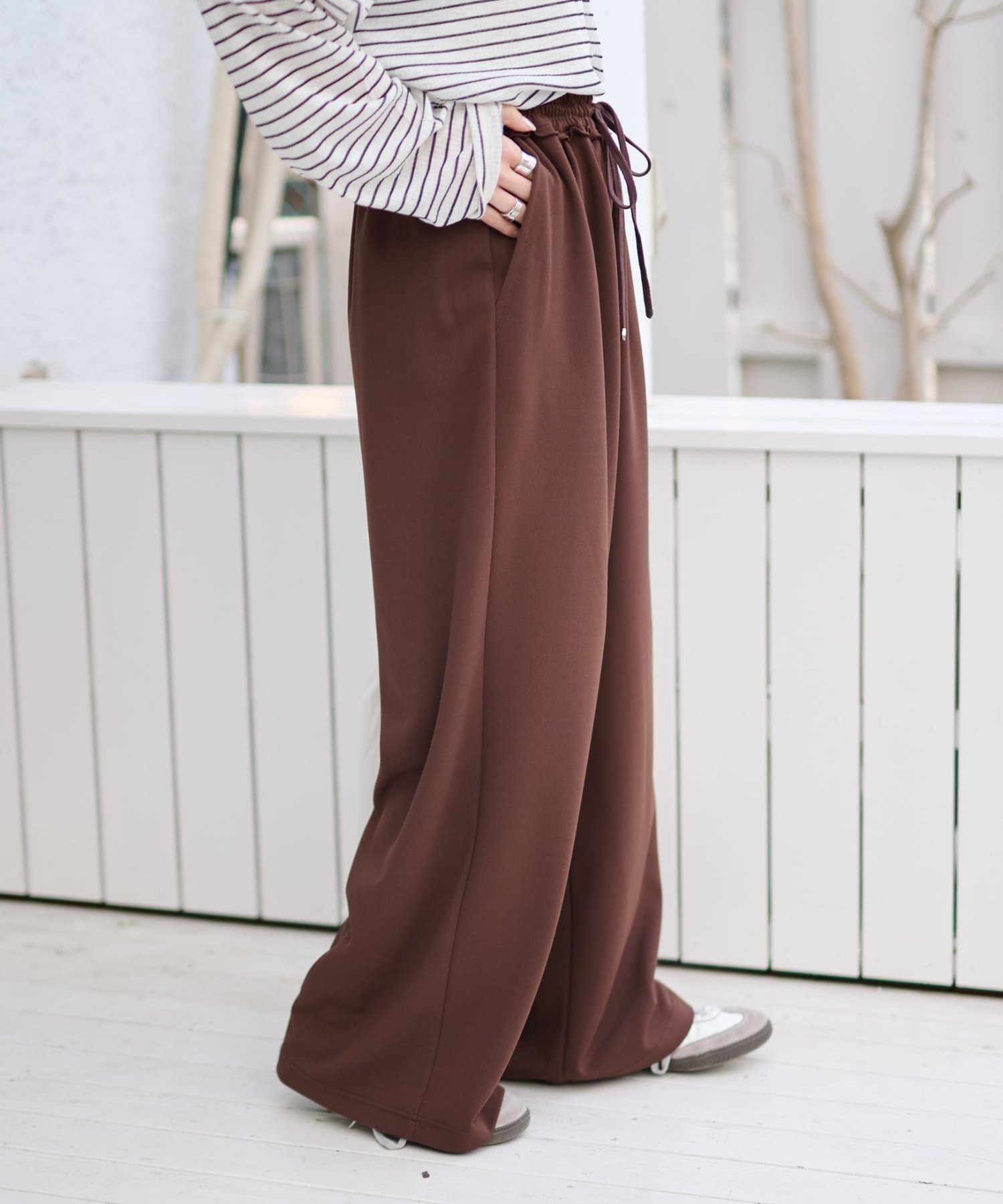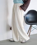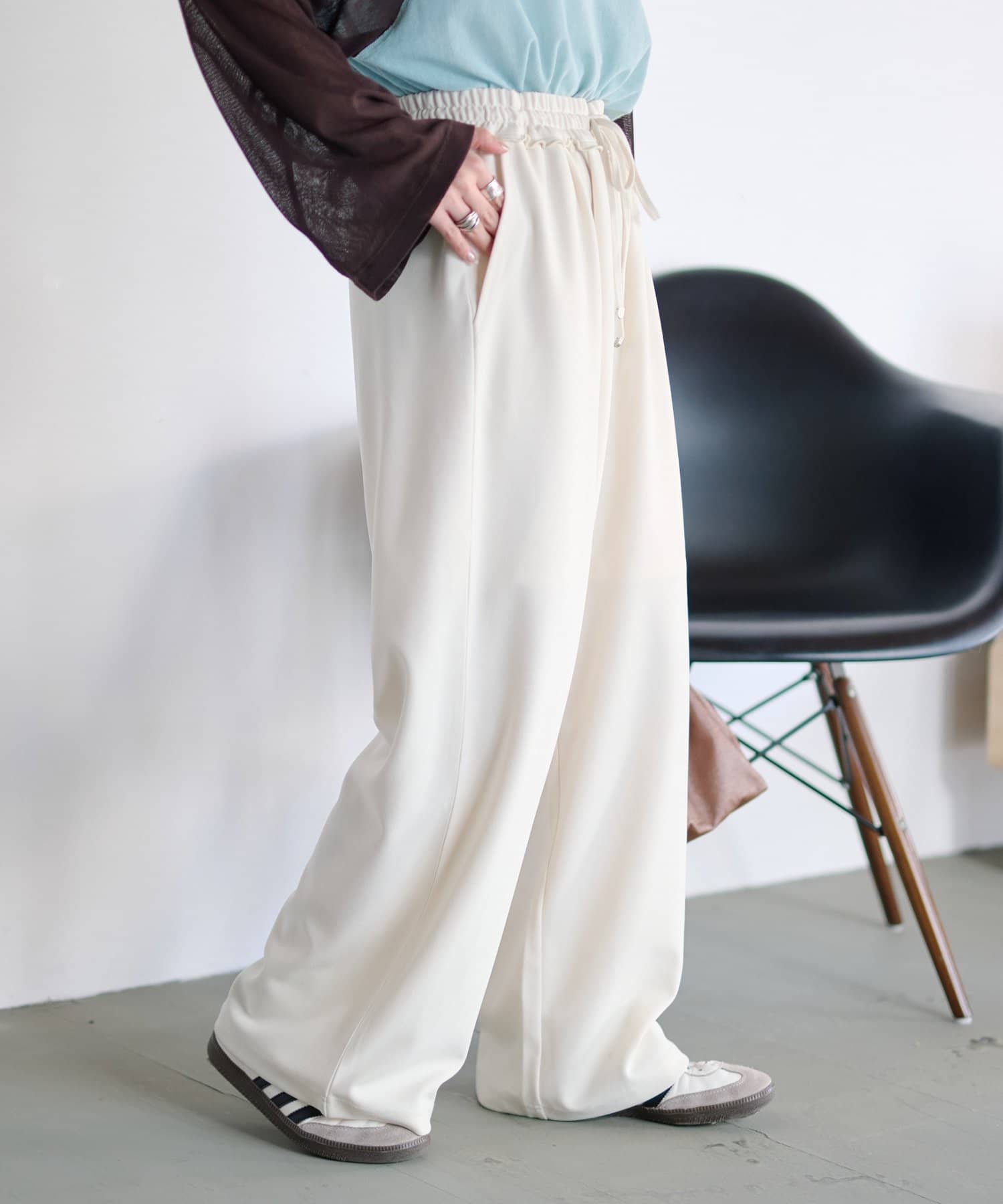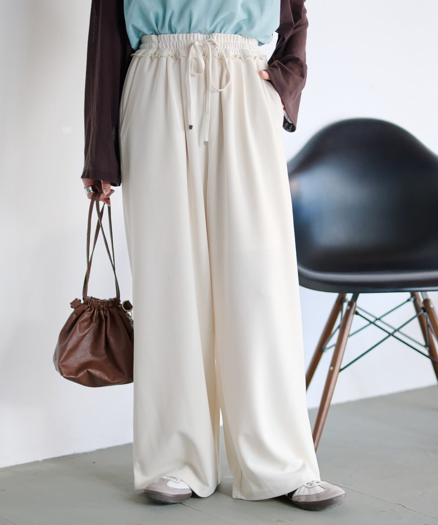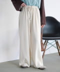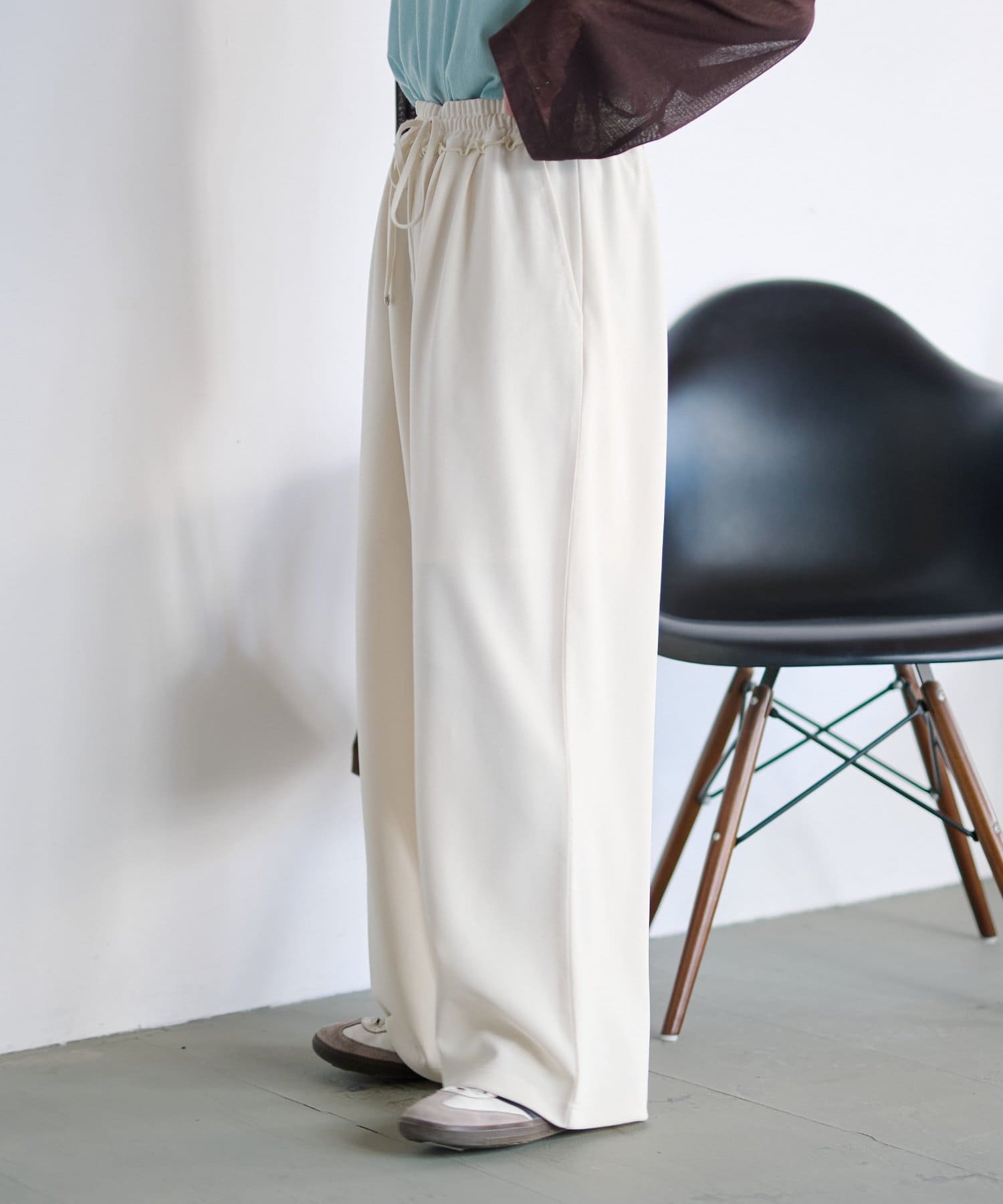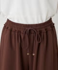 紐でサイズ調整できるゴム仕様のウエストに、脚のラインを拾いにくいワイドなディテール。