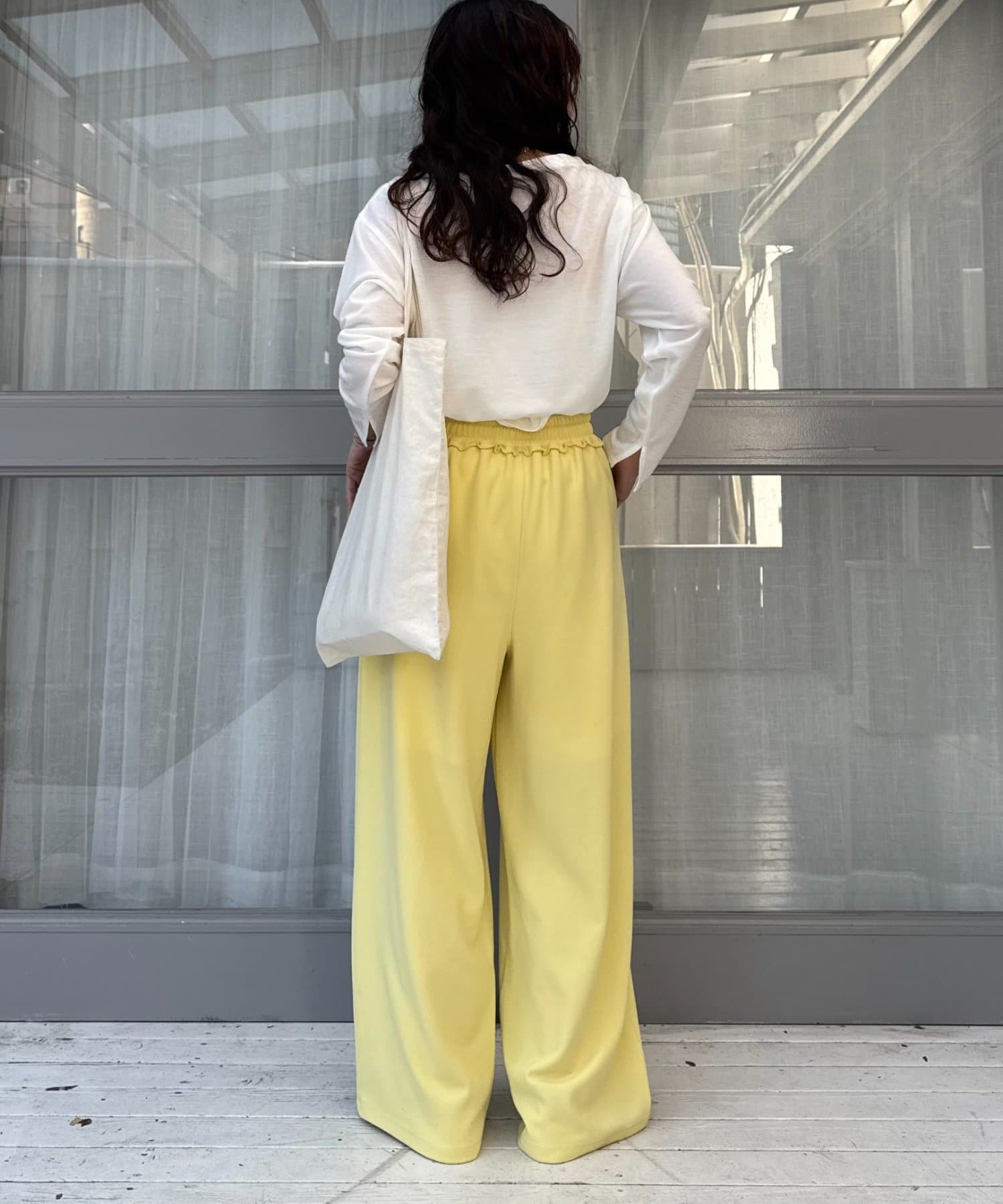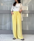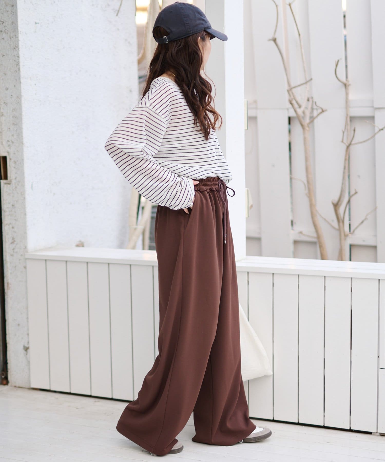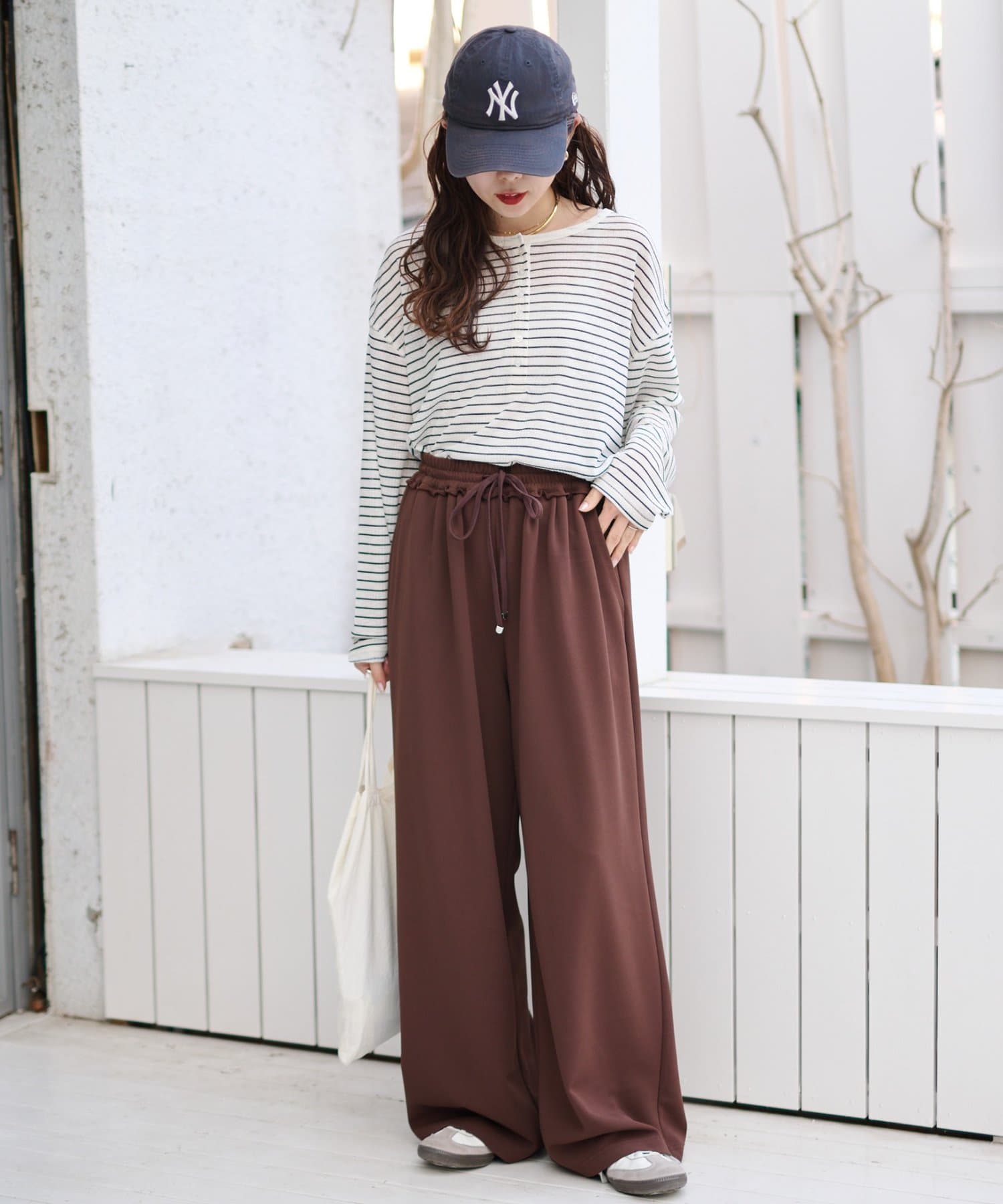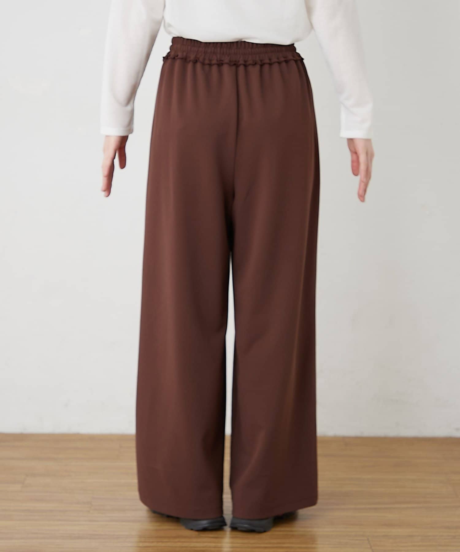 紐でサイズ調整できるゴム仕様のウエストに、脚のラインを拾いにくいワイドなディテール。