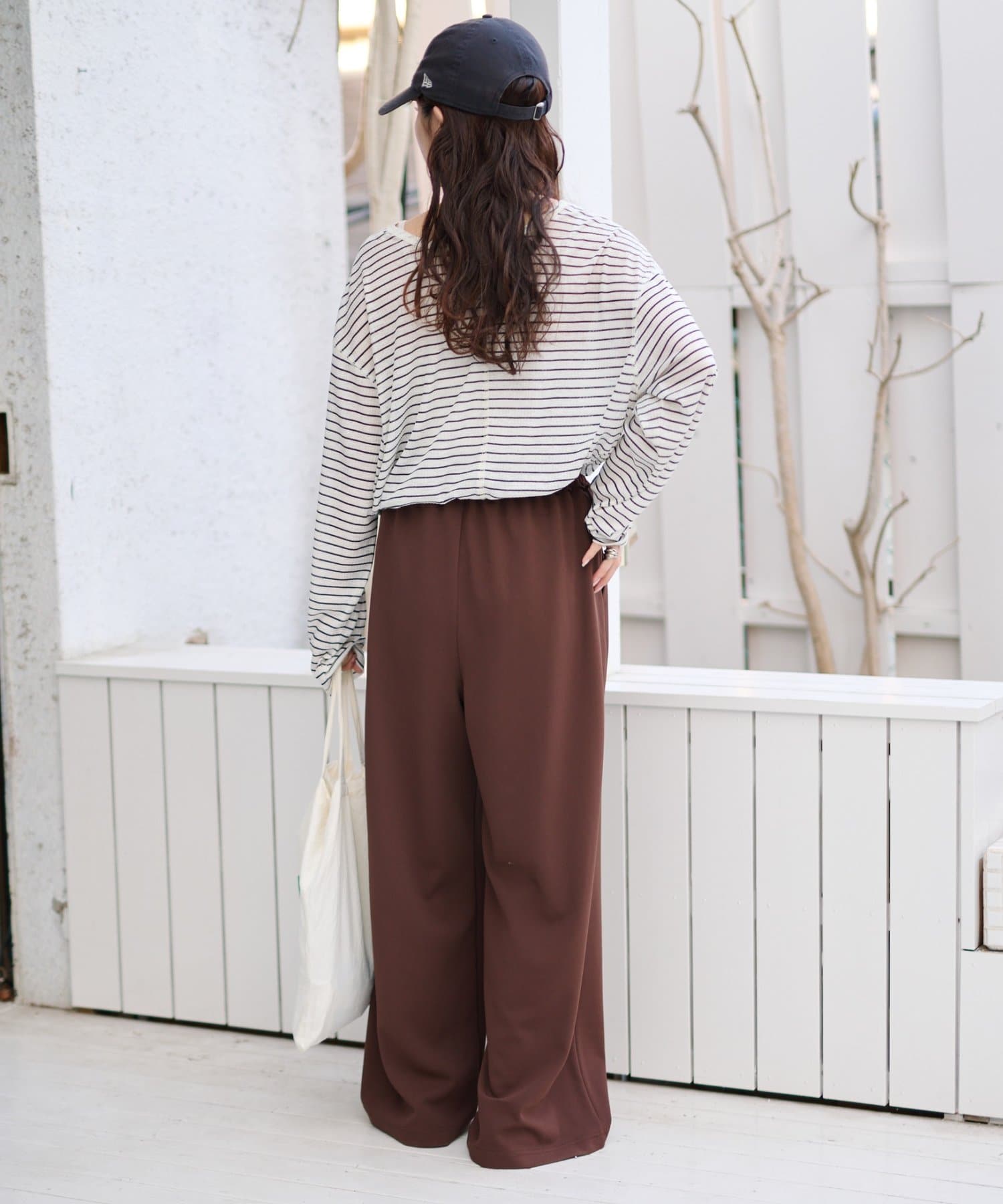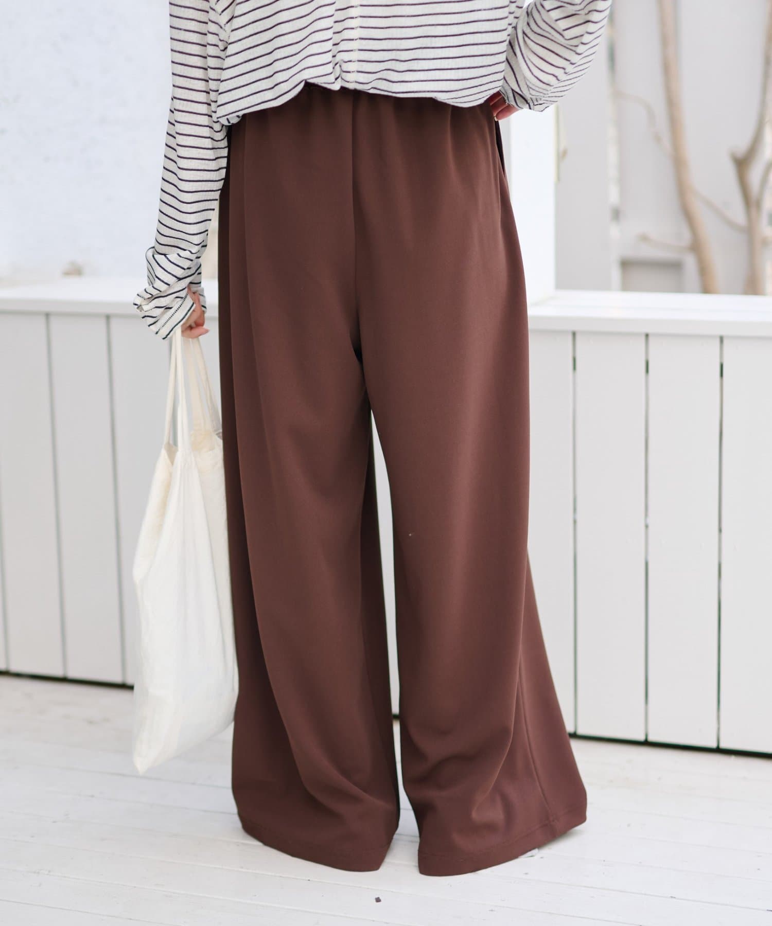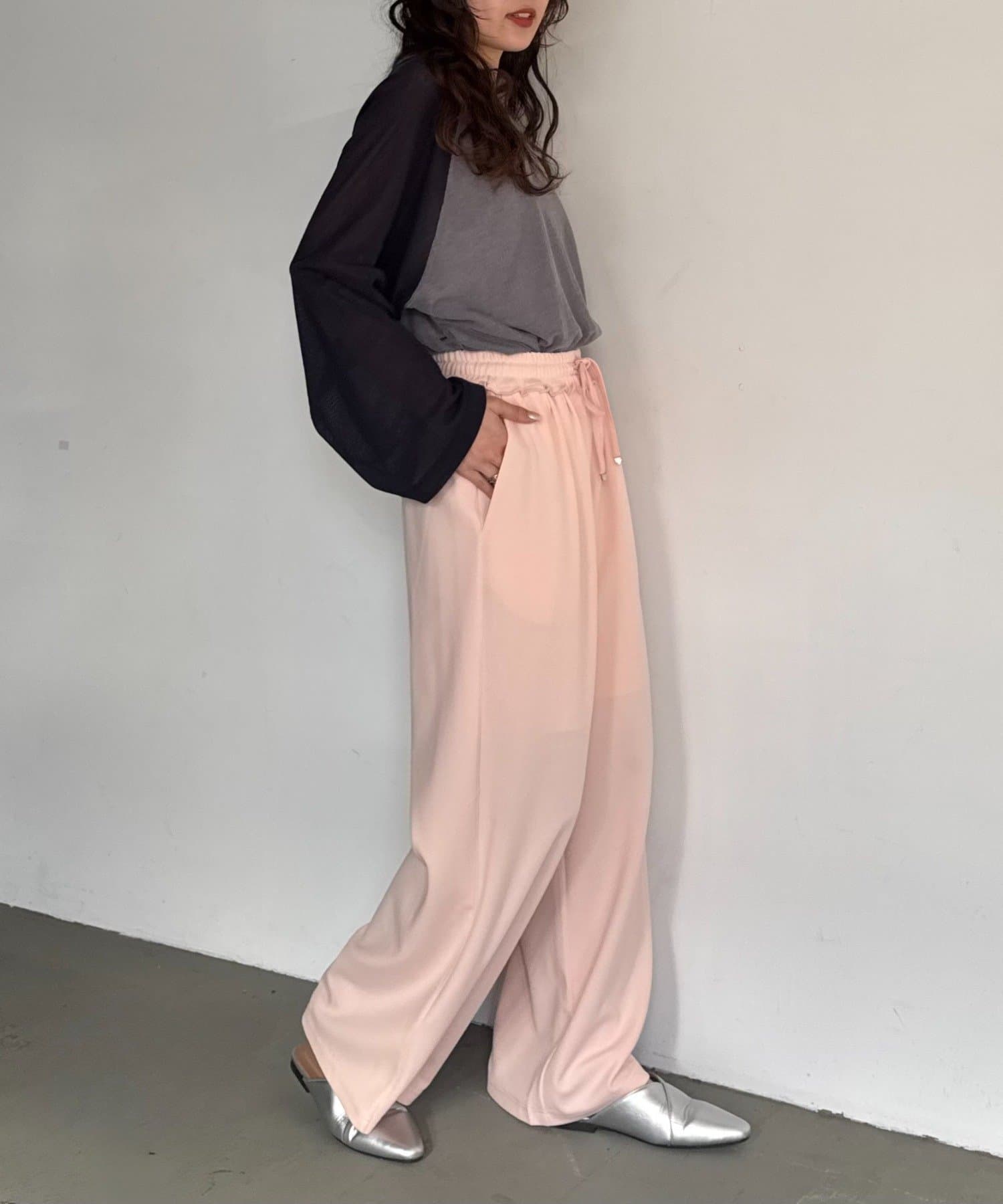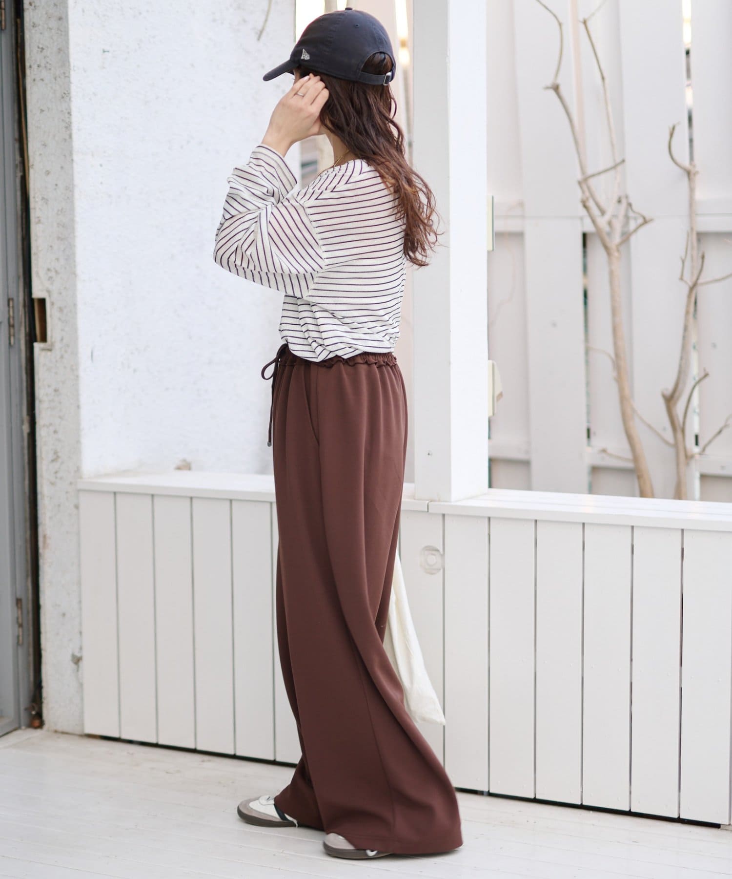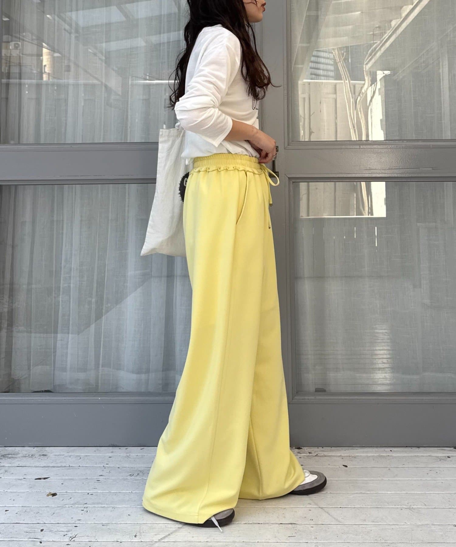 紐でサイズ調整できるゴム仕様のウエストに、脚のラインを拾いにくいワイドなディテール。