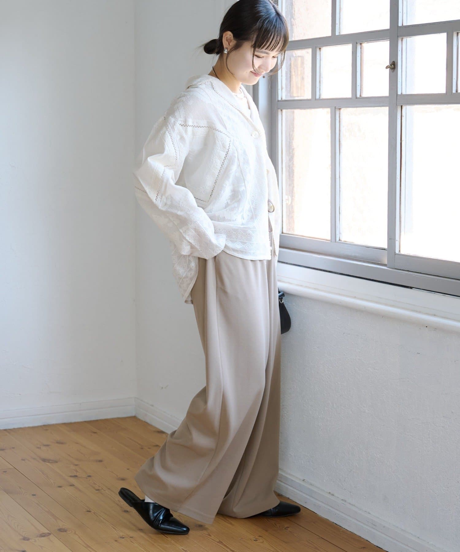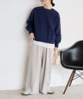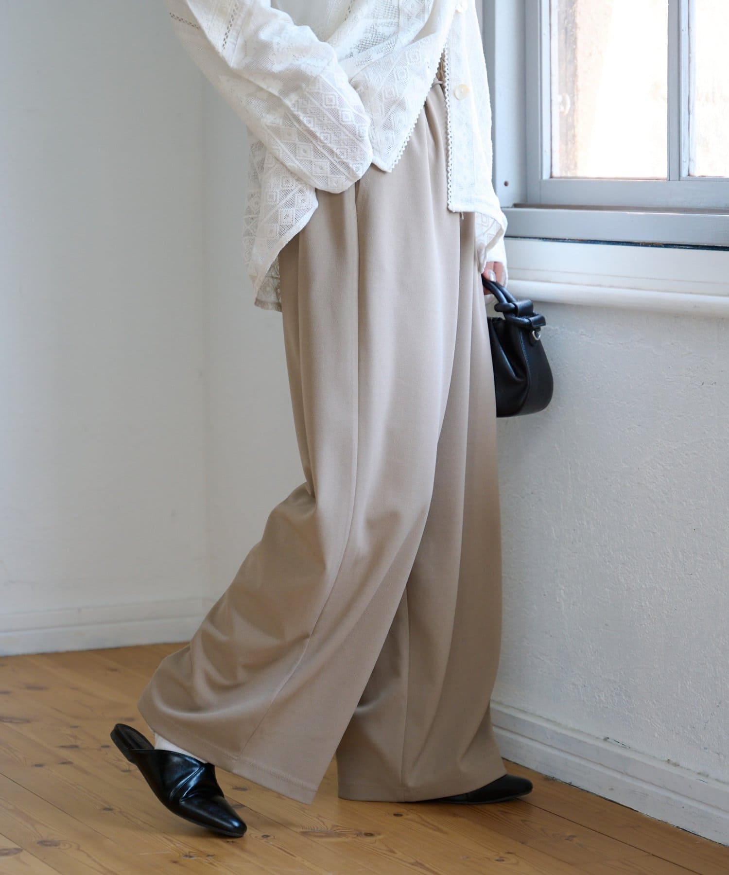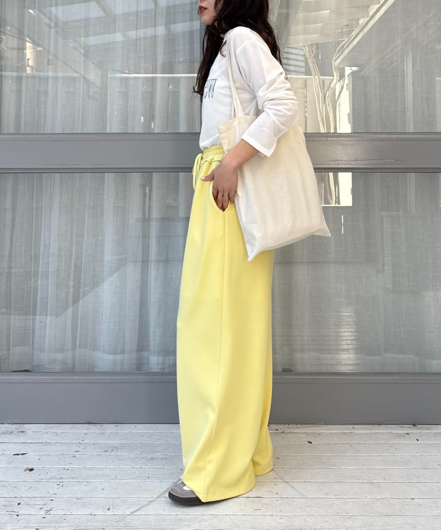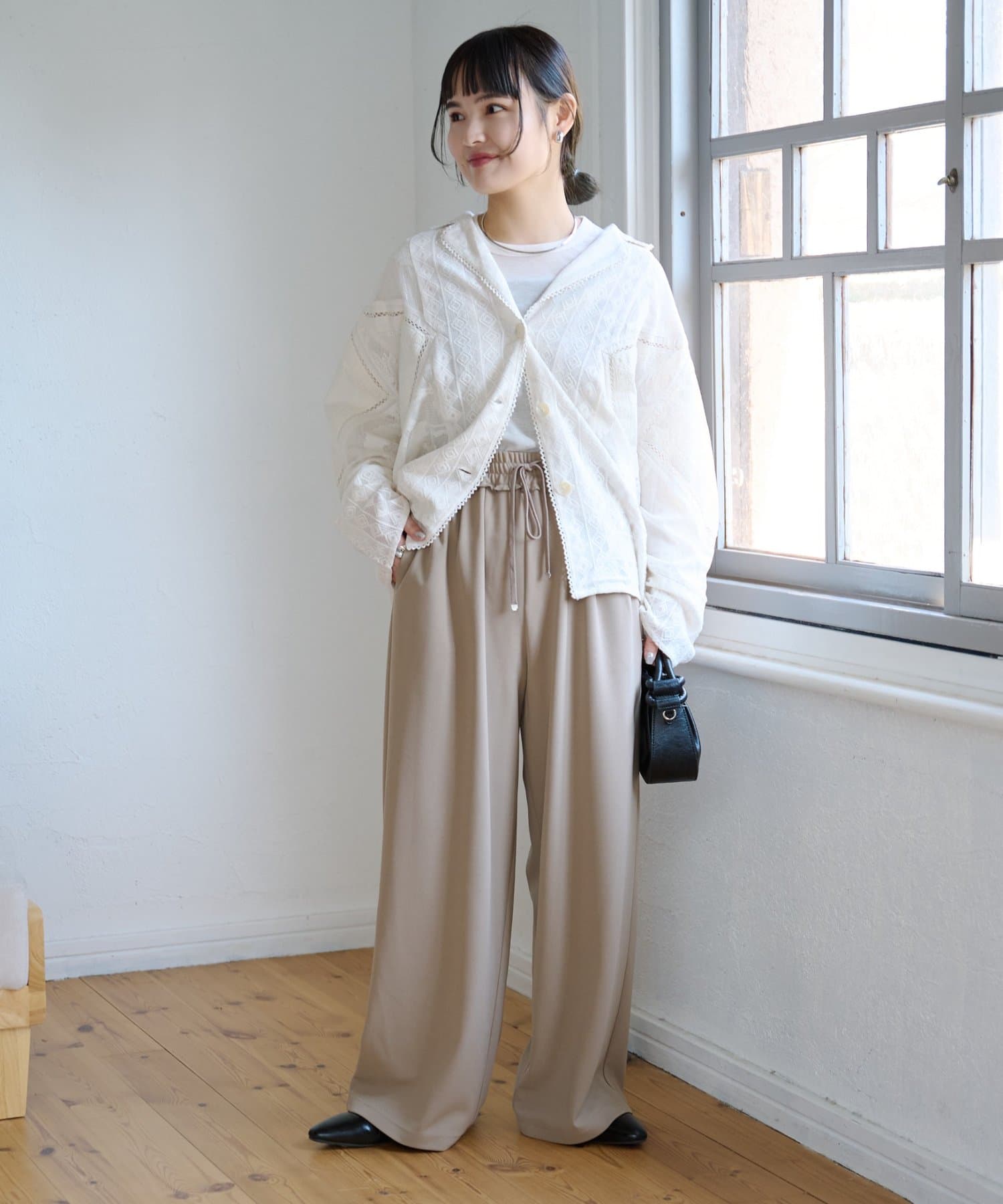 紐でサイズ調整できるゴム仕様のウエストに、脚のラインを拾いにくいワイドなディテール。