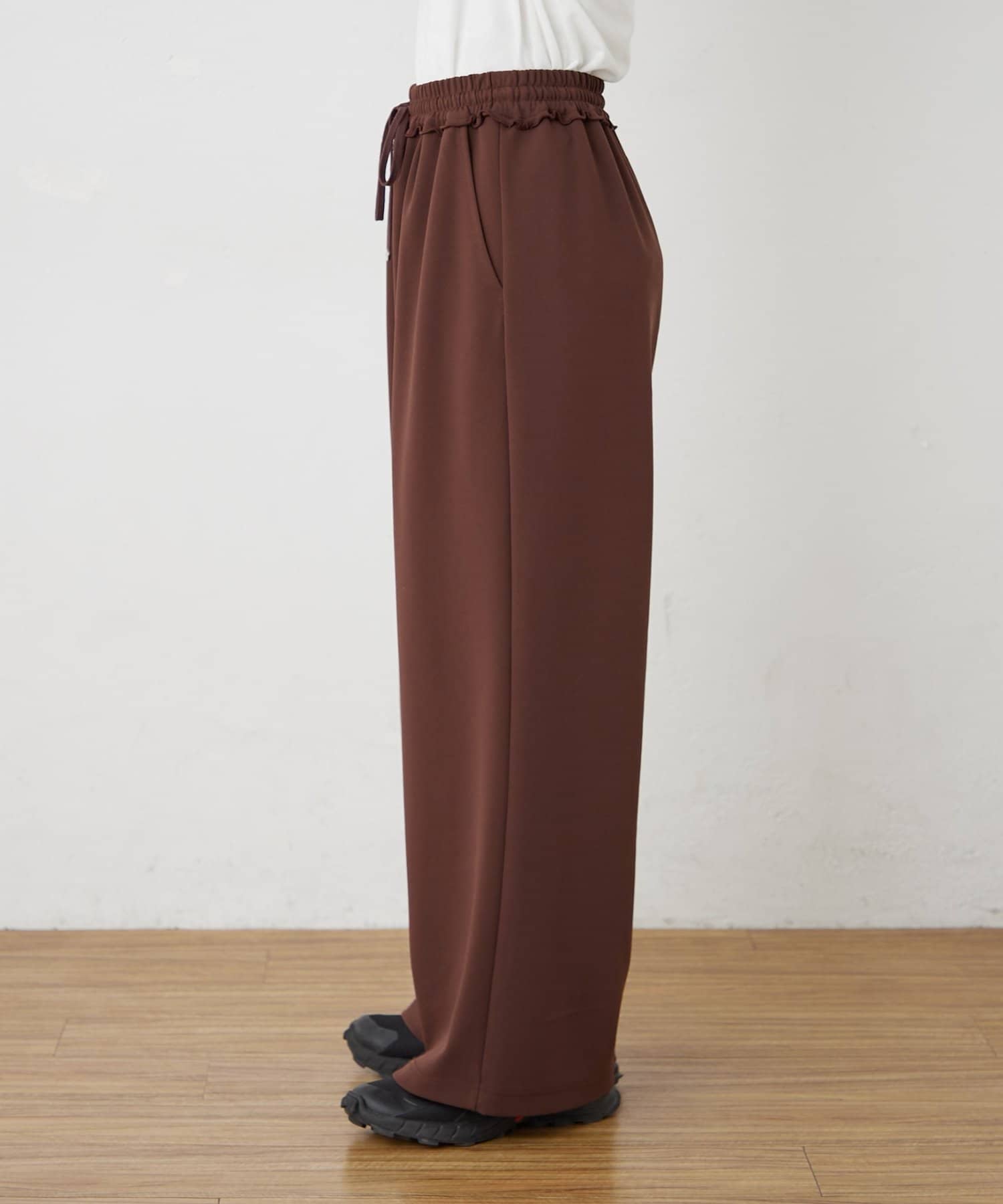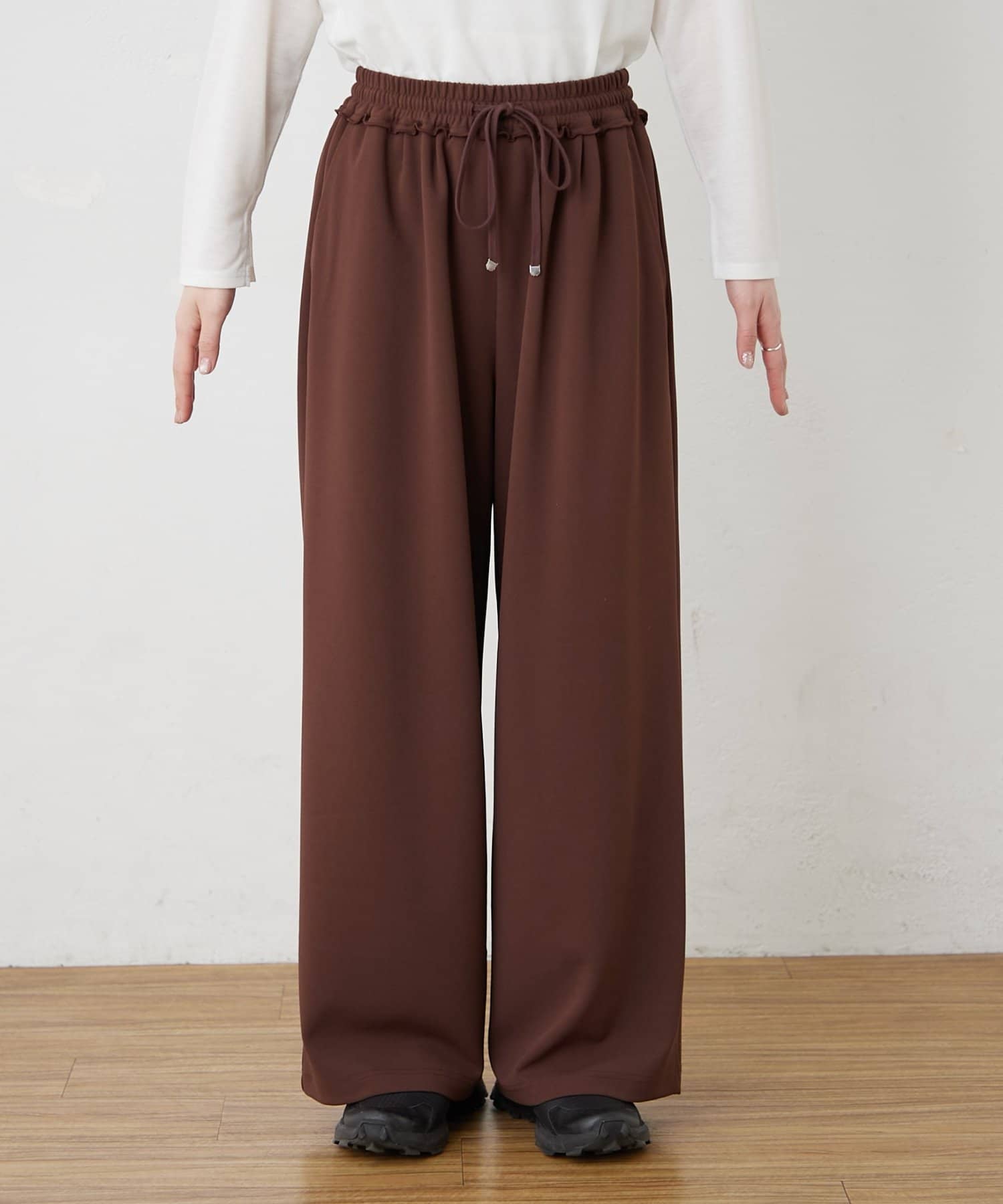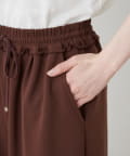紐でサイズ調整できるゴム仕様のウエストに、脚のラインを拾いにくいワイドなディテール。