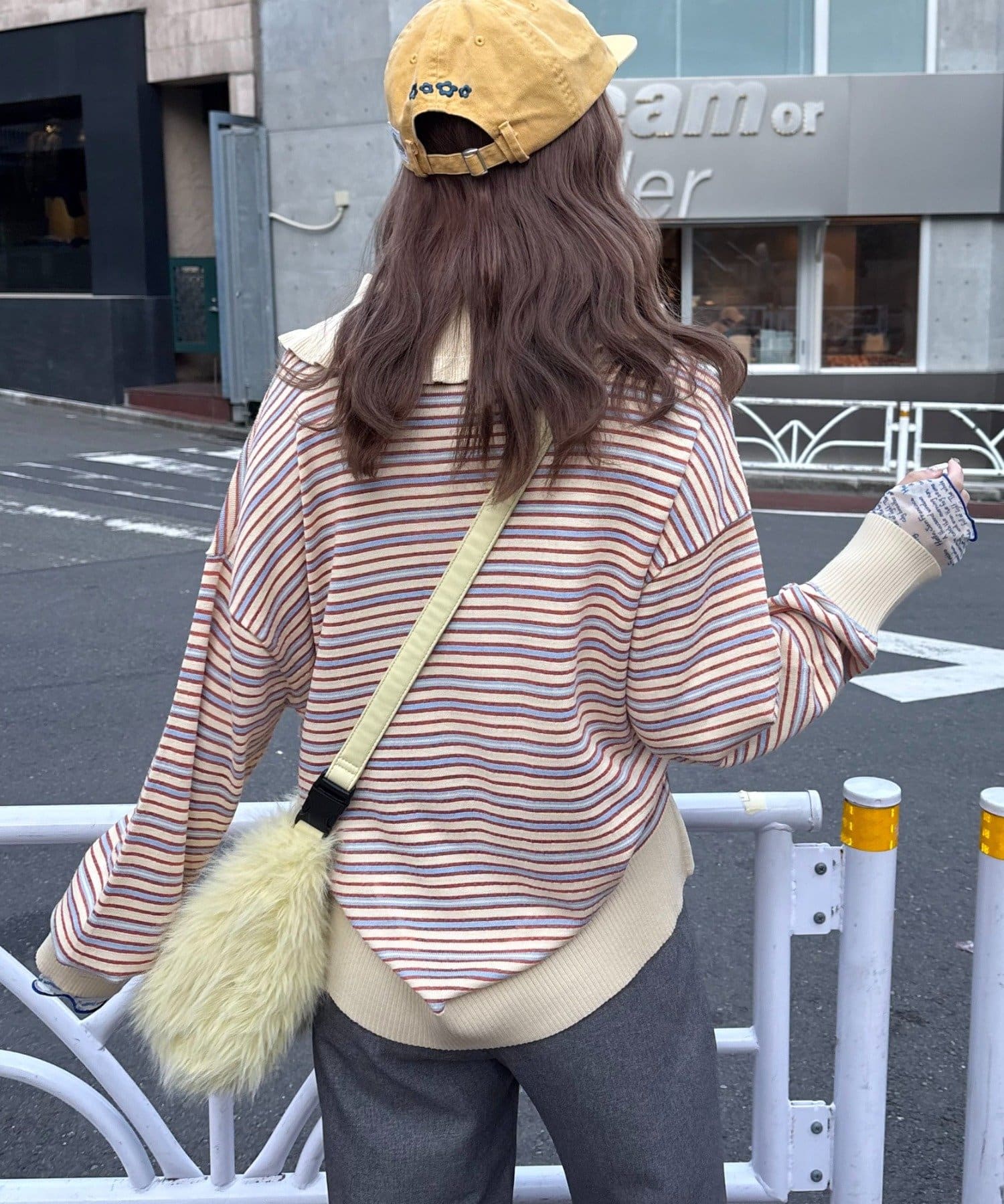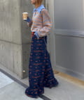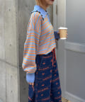 襟元にデザインがあるので、アウターはシンプルなものを選ぶと、ニットのデザインが際立ちます。