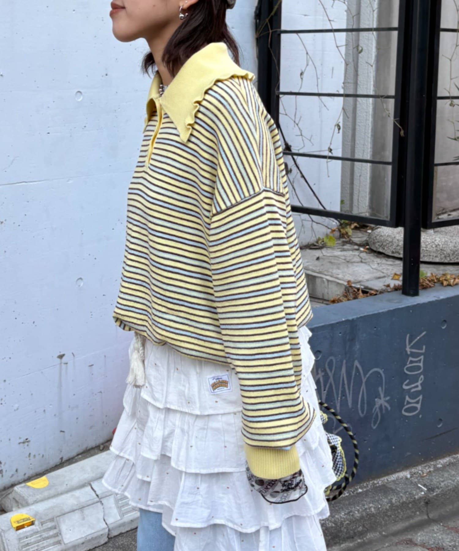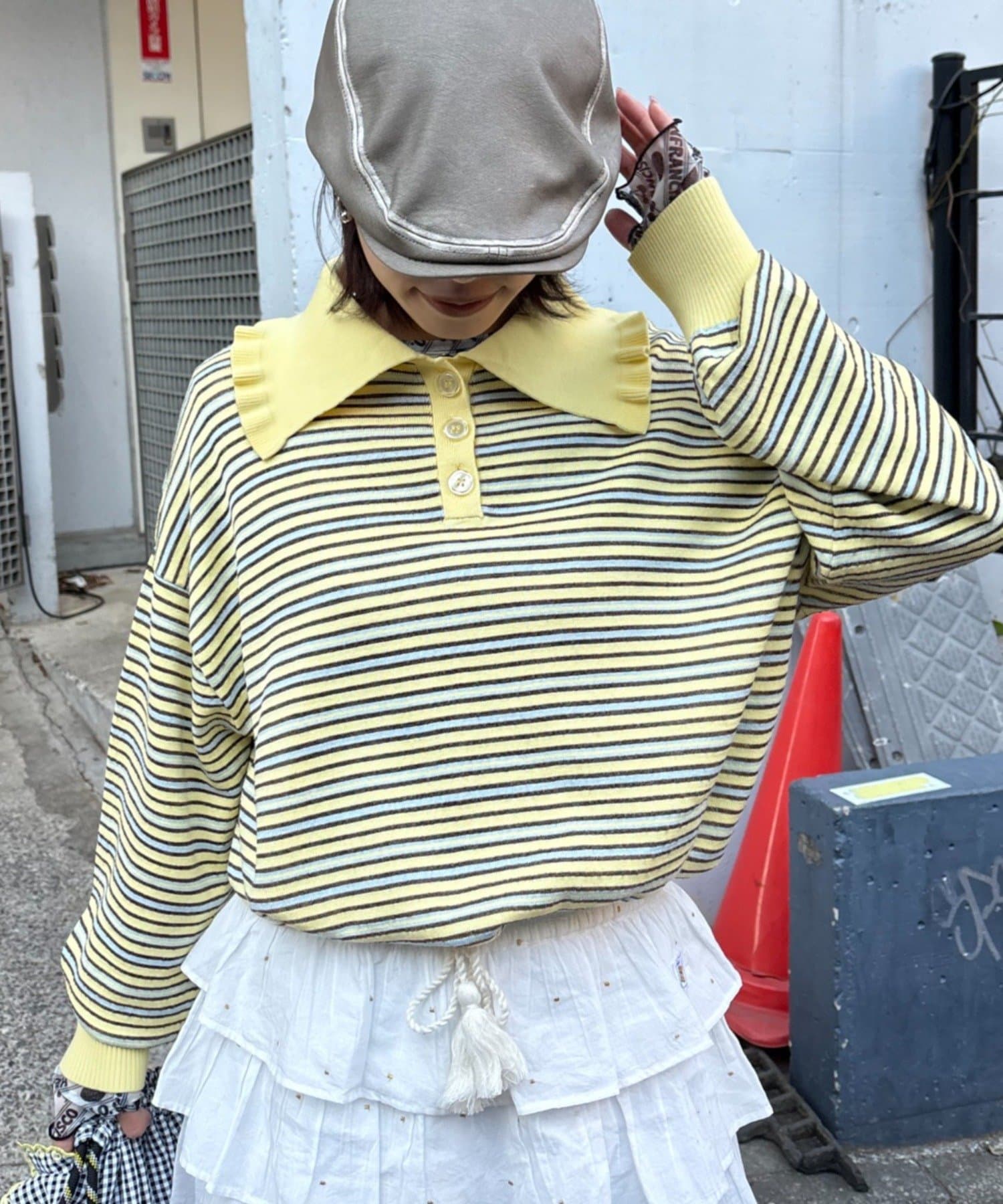 襟元のフリルがポイント。遊び心あるニットポロ