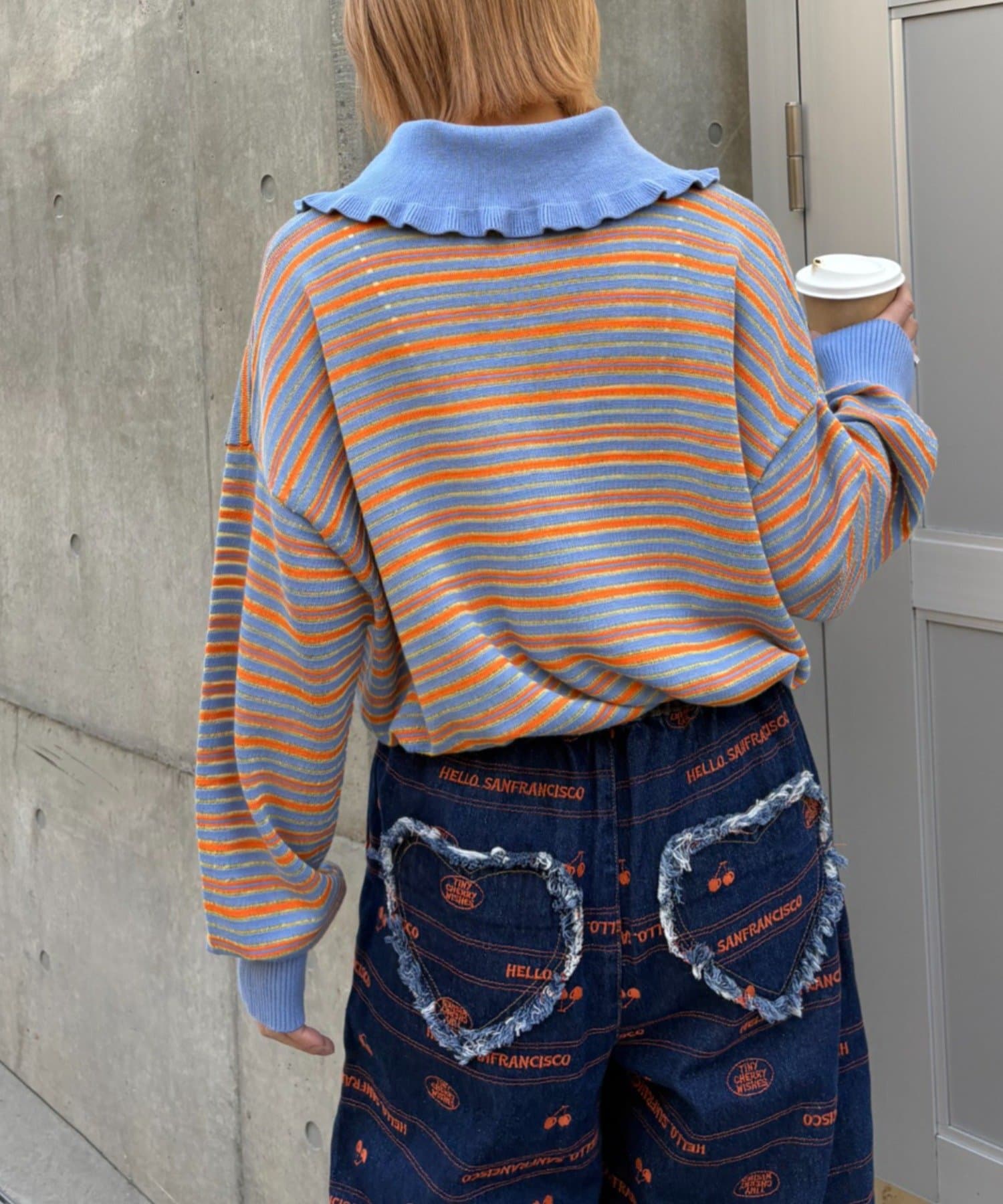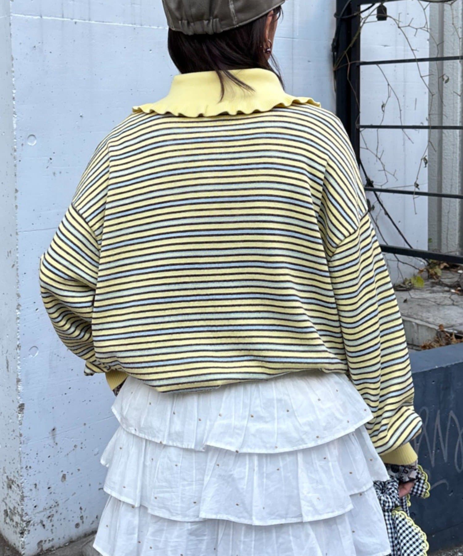 襟元のフリルが目を引くデザイン性の高いニット。