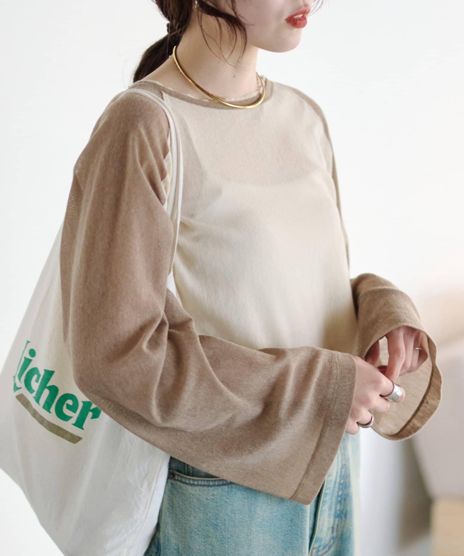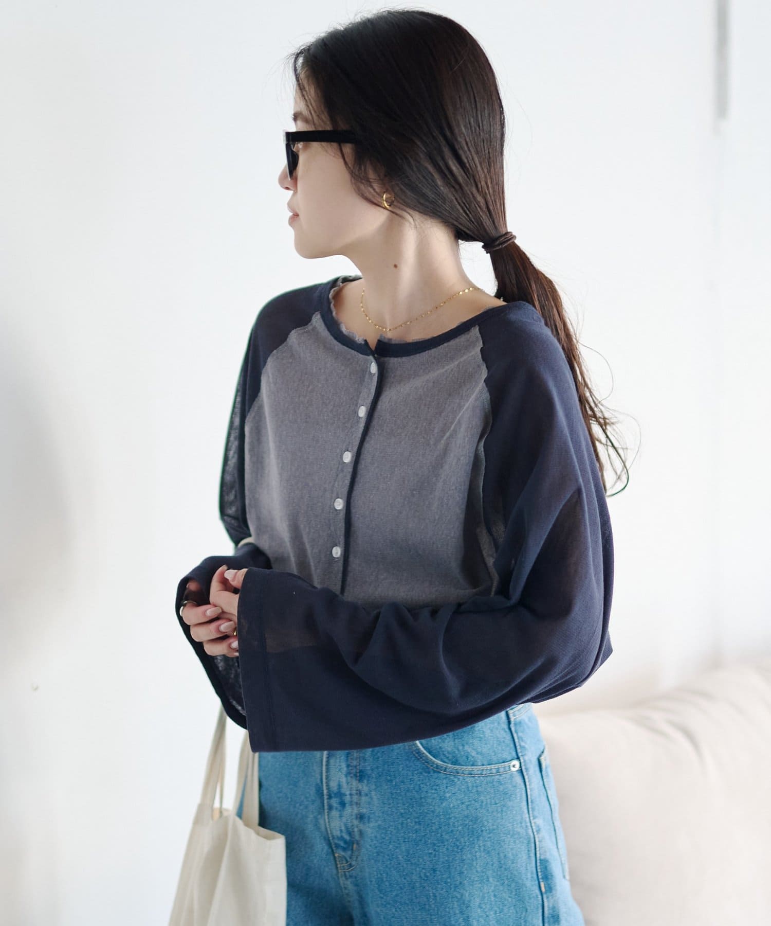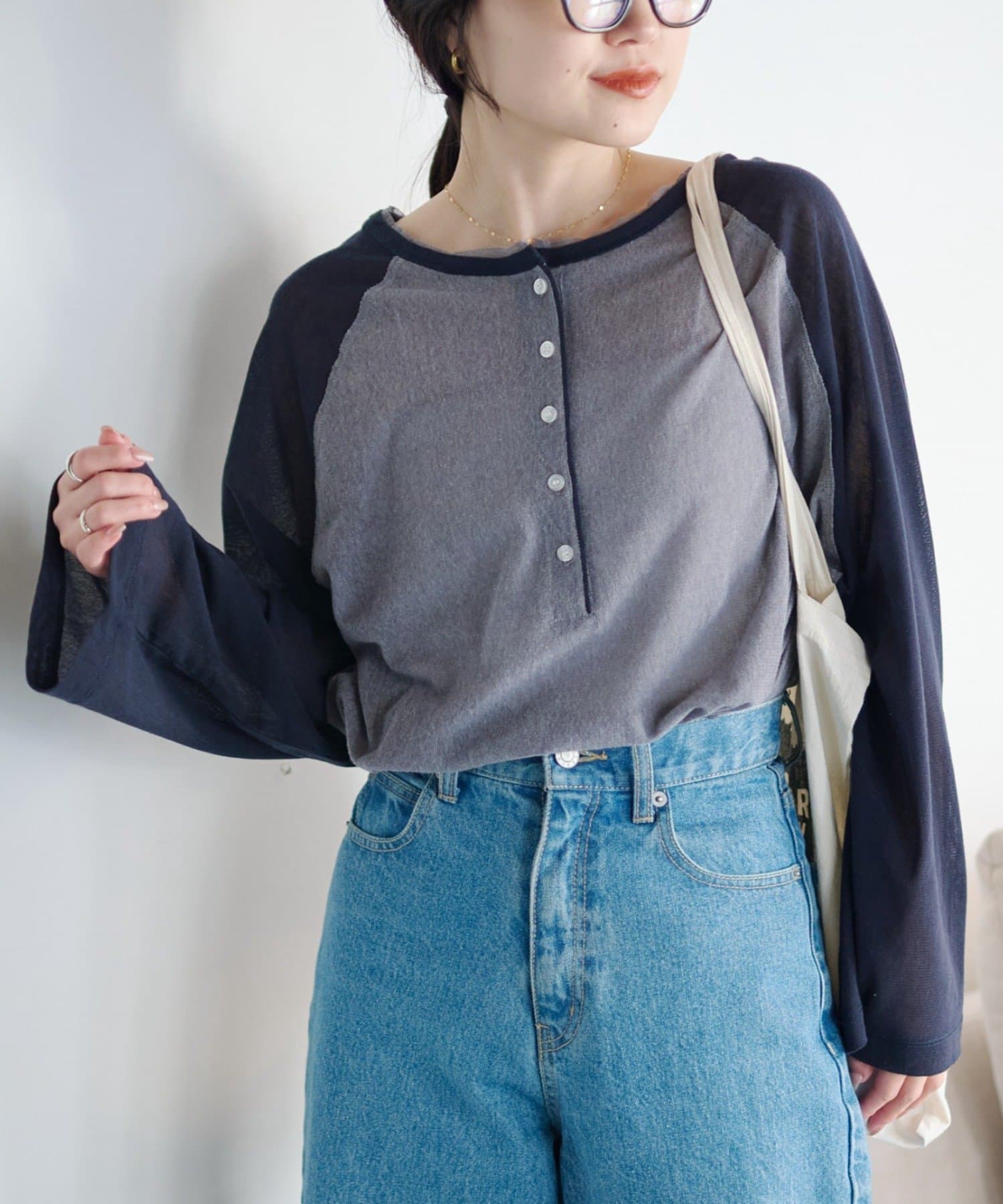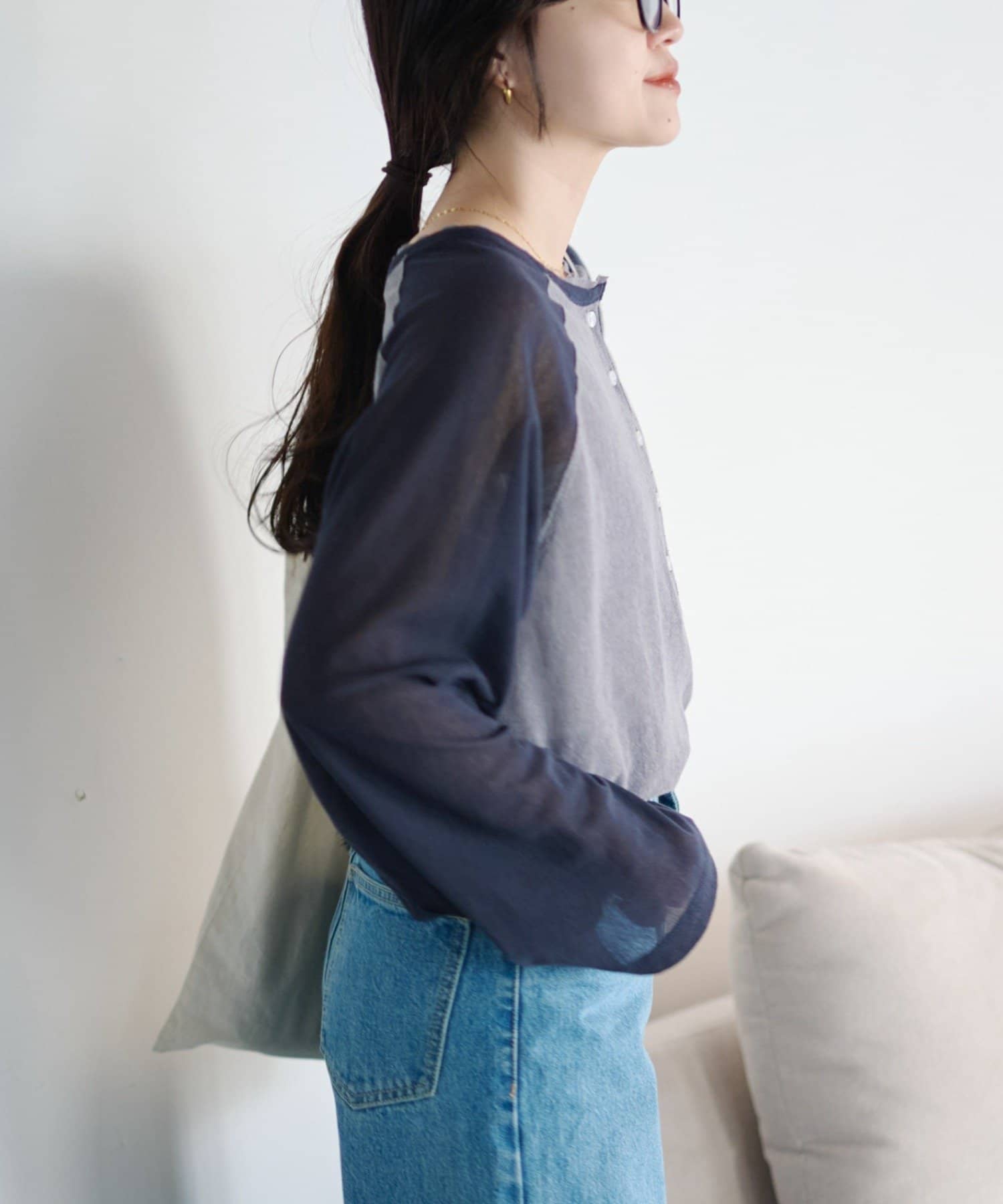 デニム合わせのカジュアルな着こなしも、シアー素材と配色デザインでラフになりすぎません。