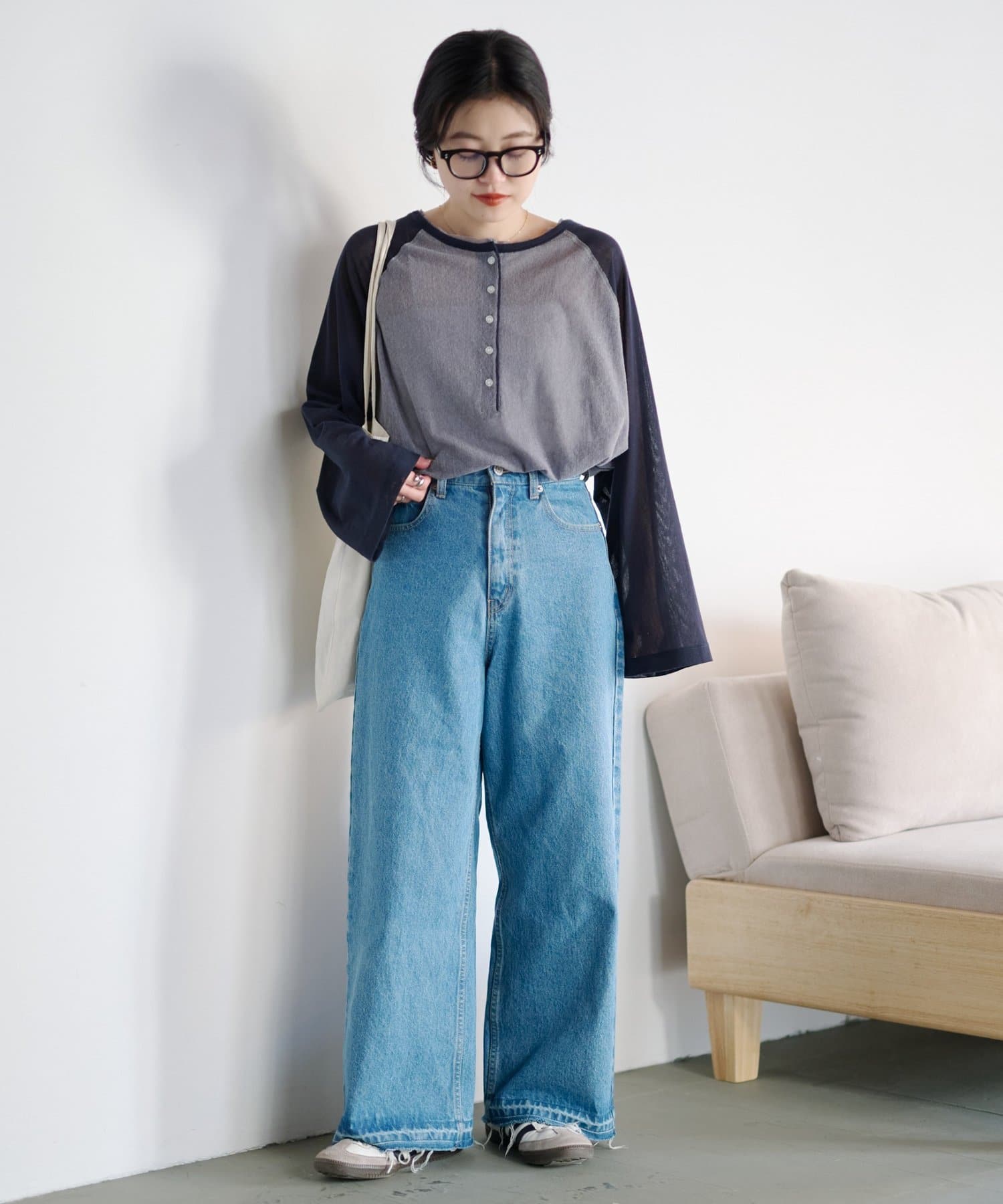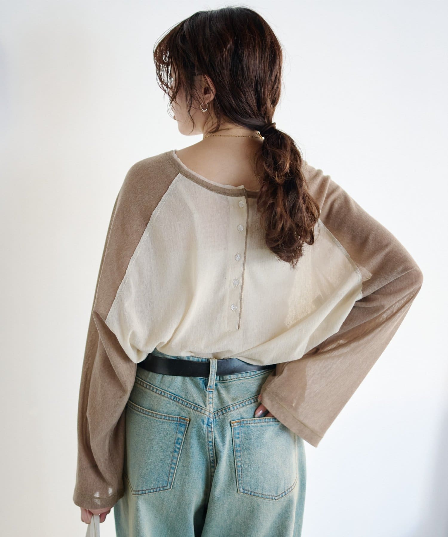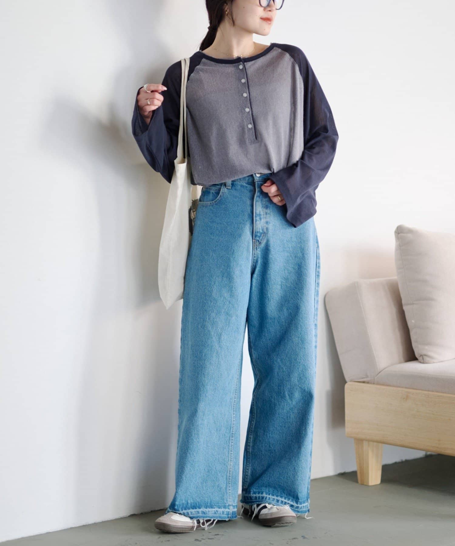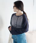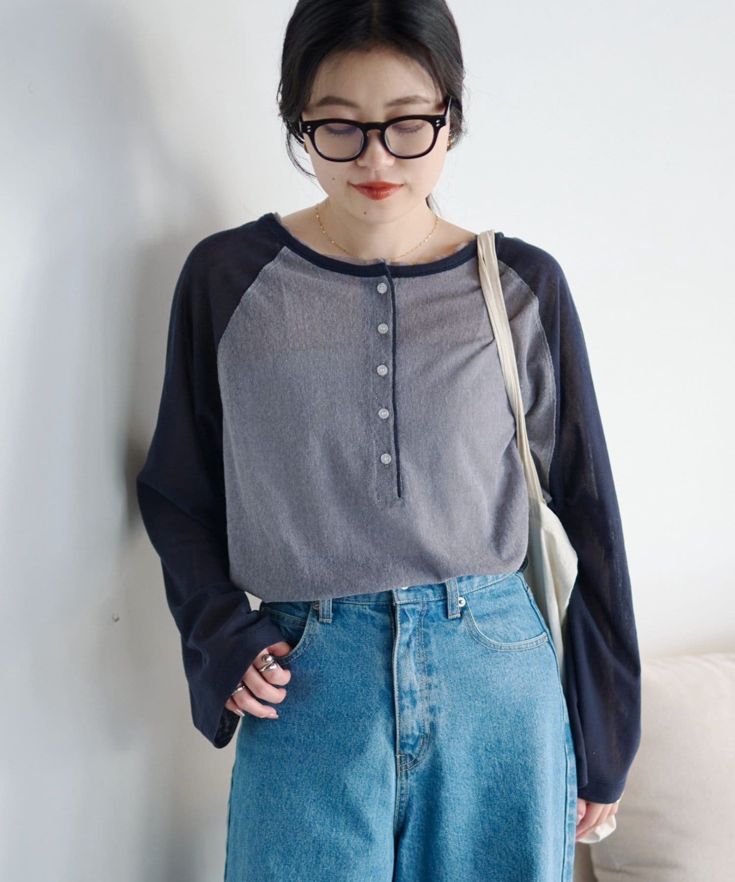 デニム合わせのカジュアルな着こなしも、シアー素材と配色デザインでラフになりすぎません。