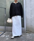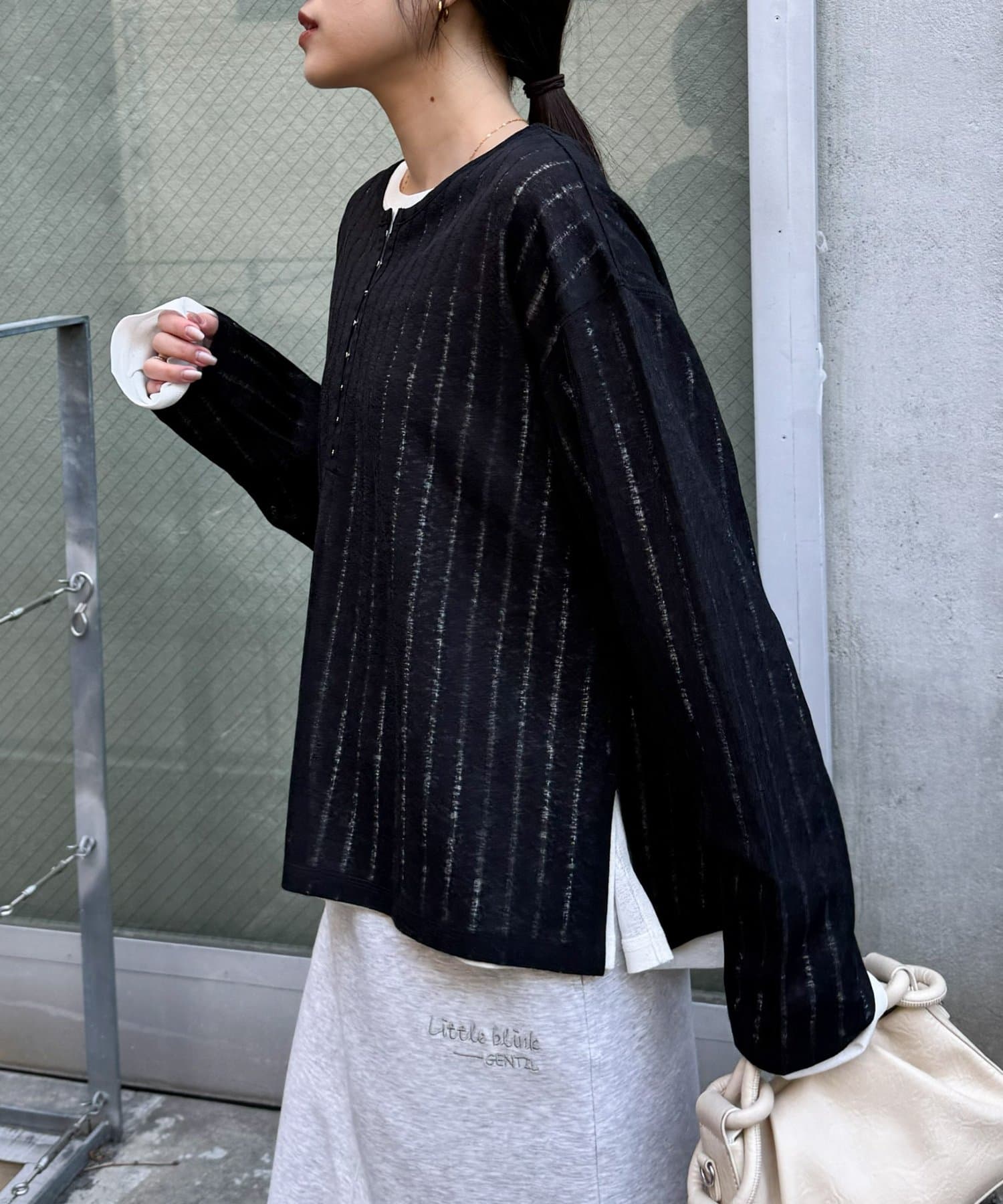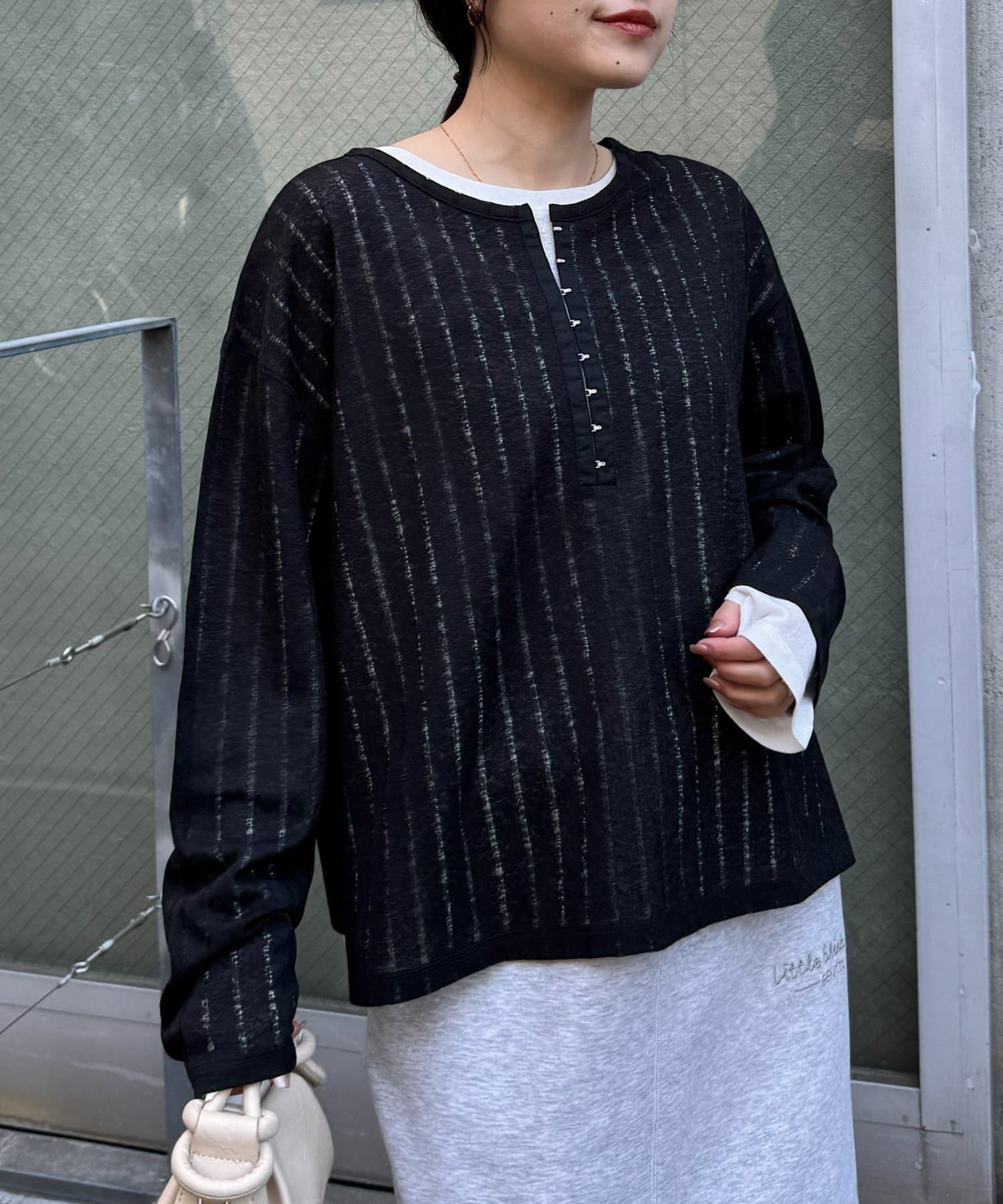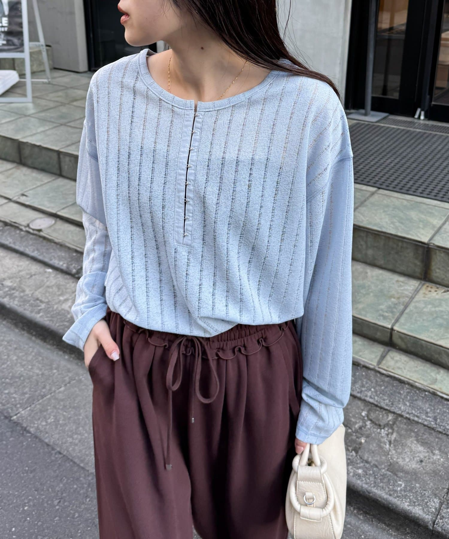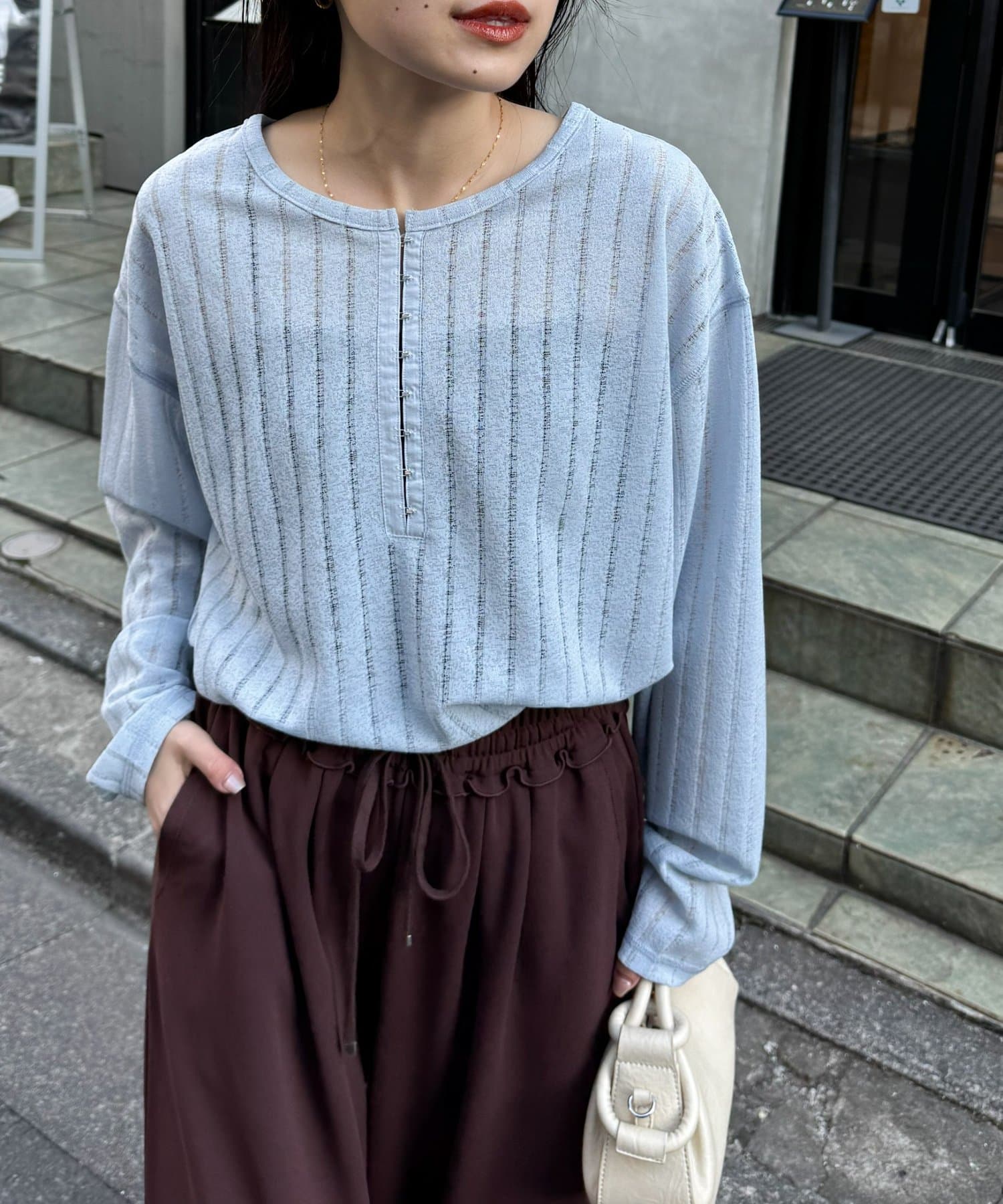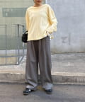 シンプルなボトムも透け感とヘンリーネックで程よくこなれた印象に仕上がります。