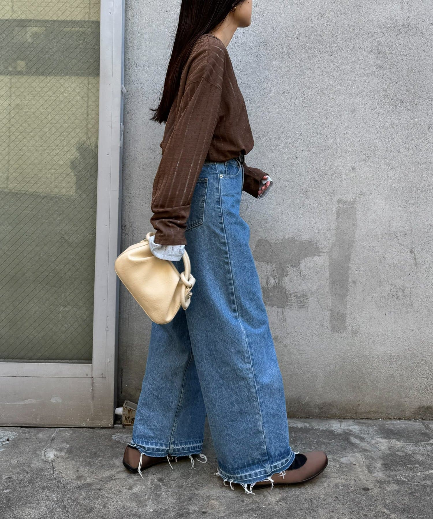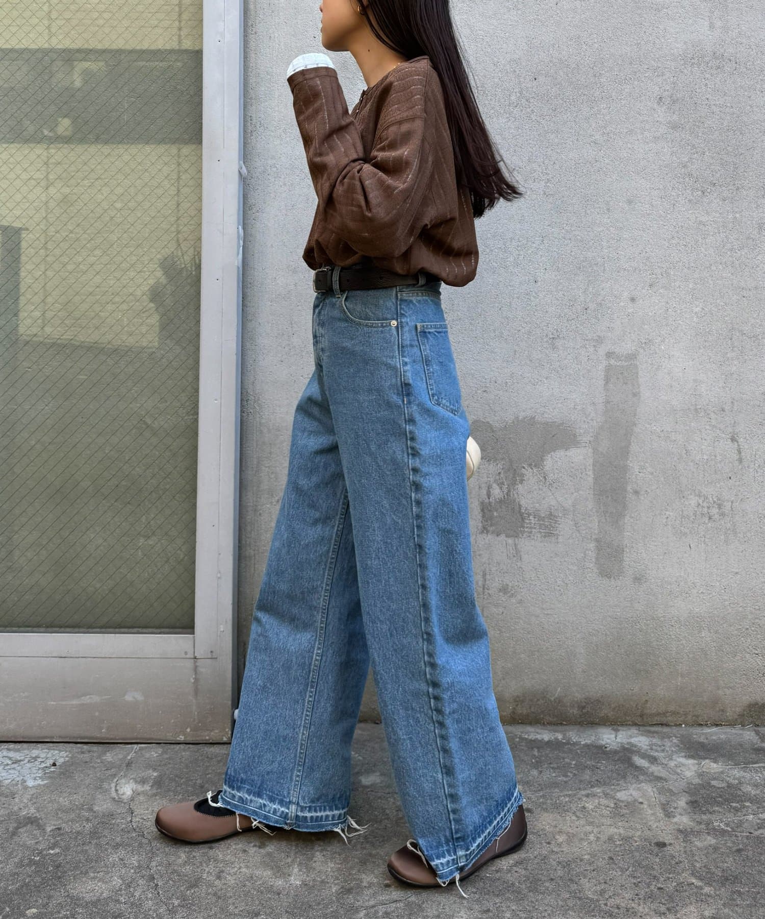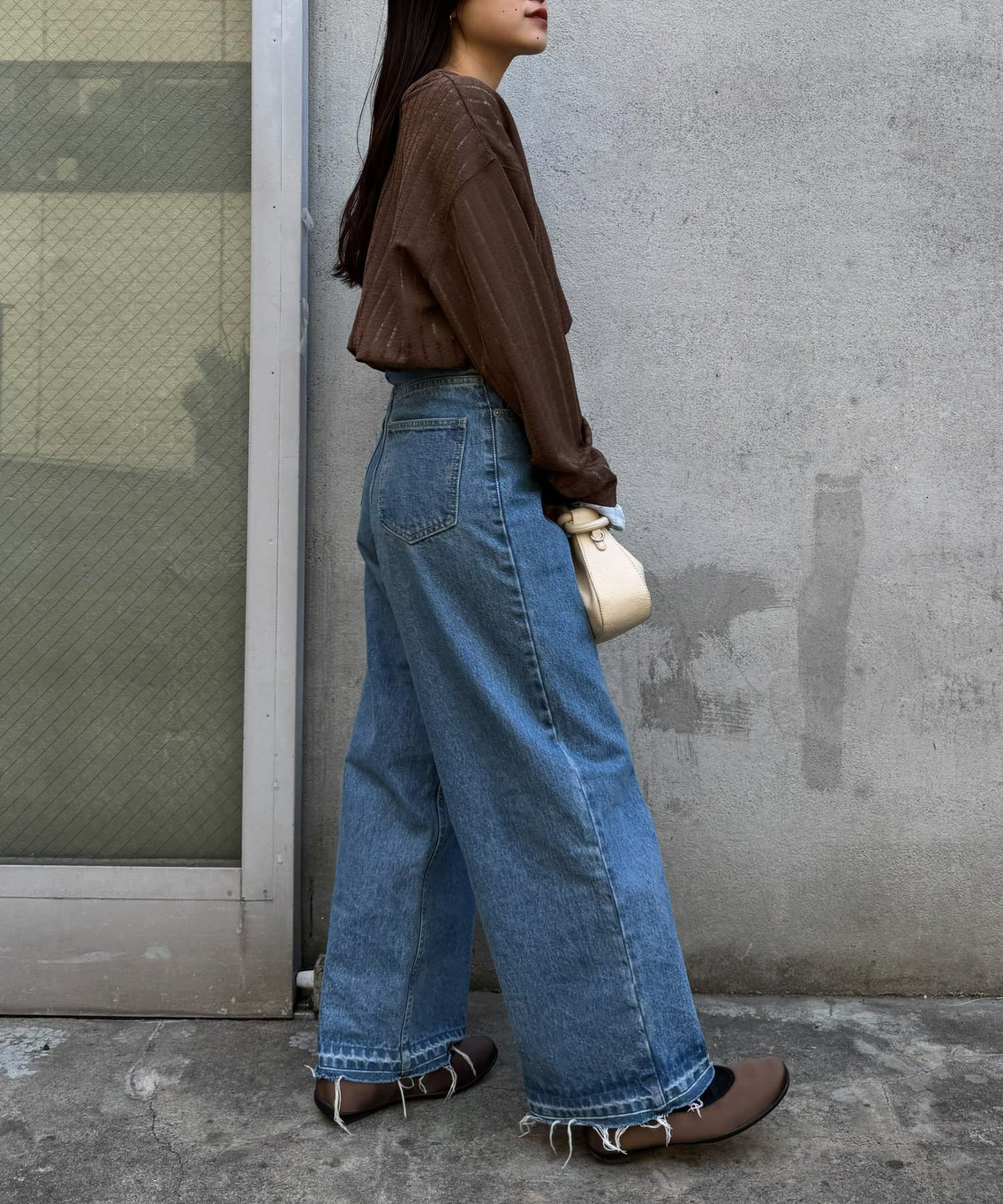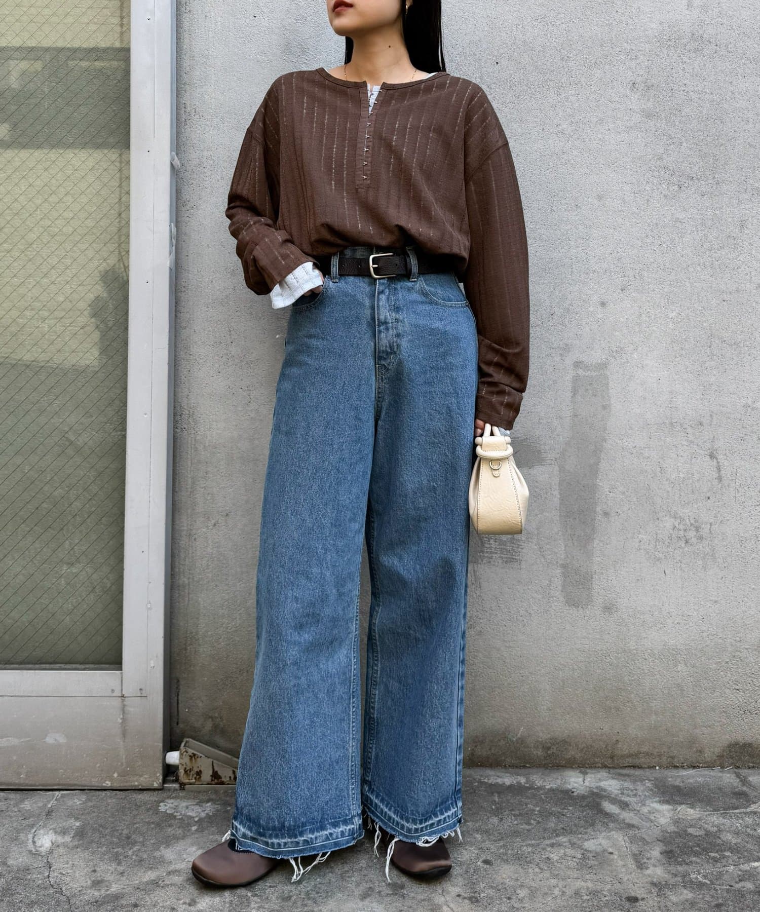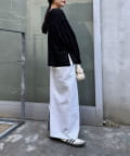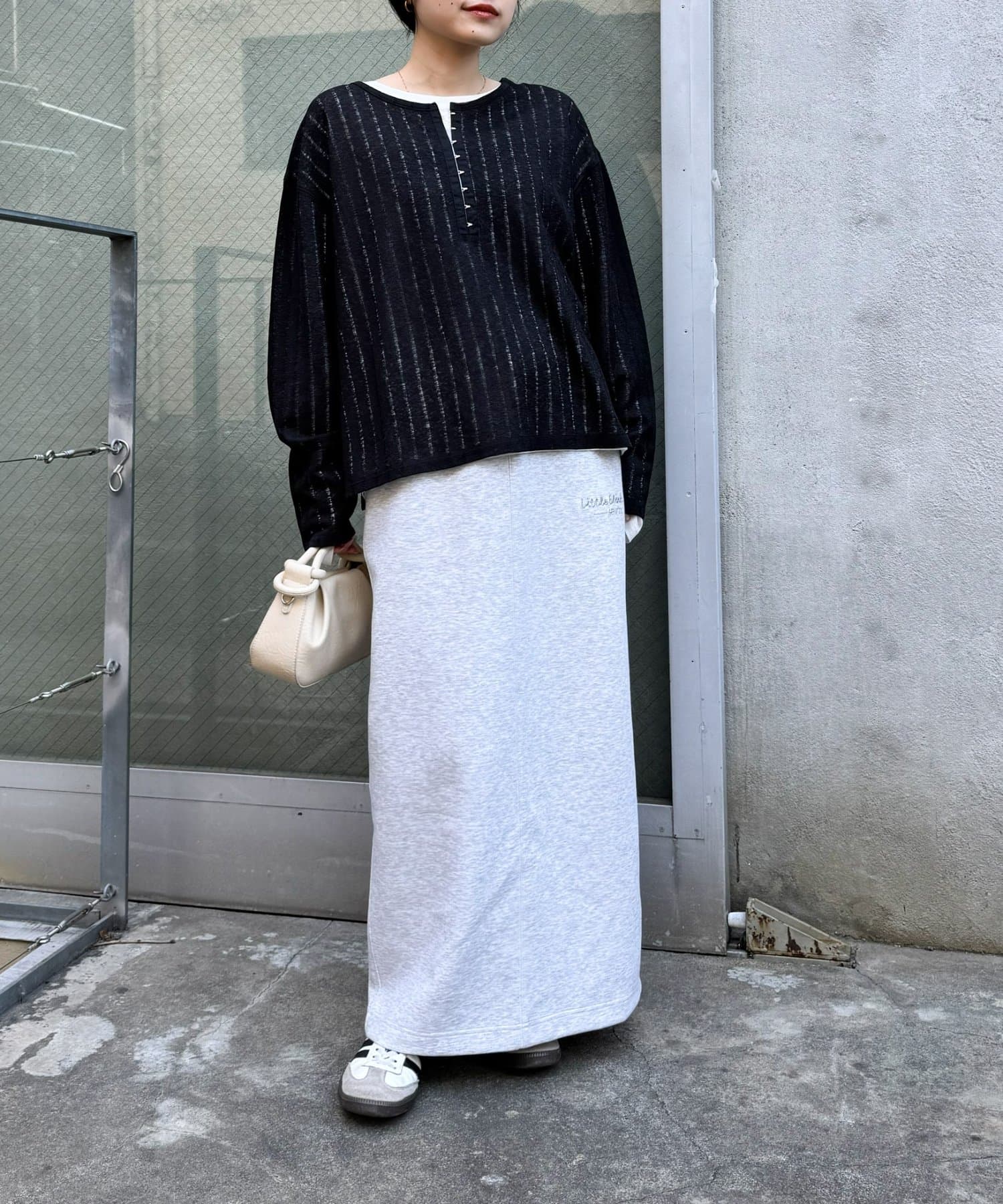 シンプルなボトムも透け感とヘンリーネックで程よくこなれた印象に仕上がります。