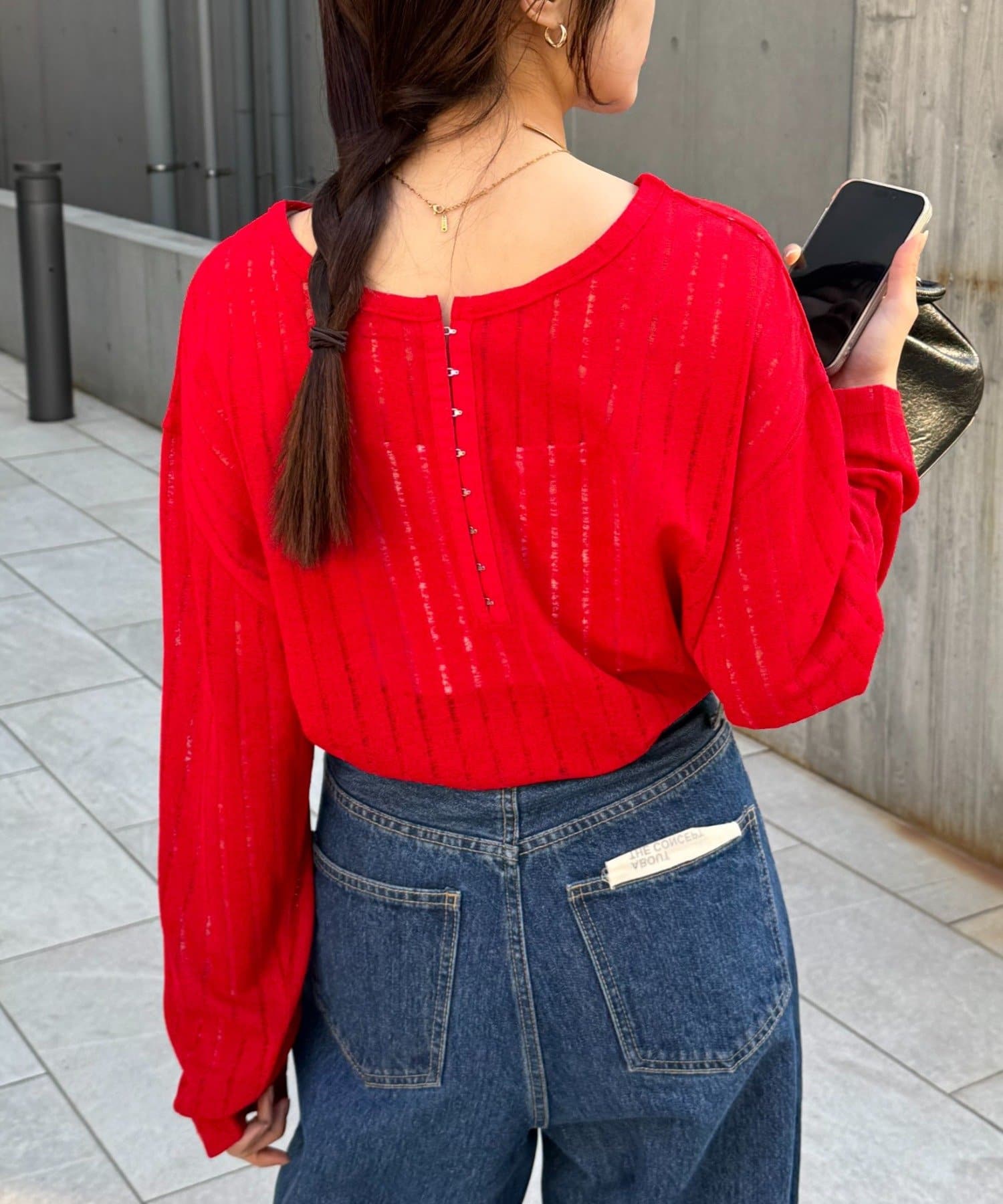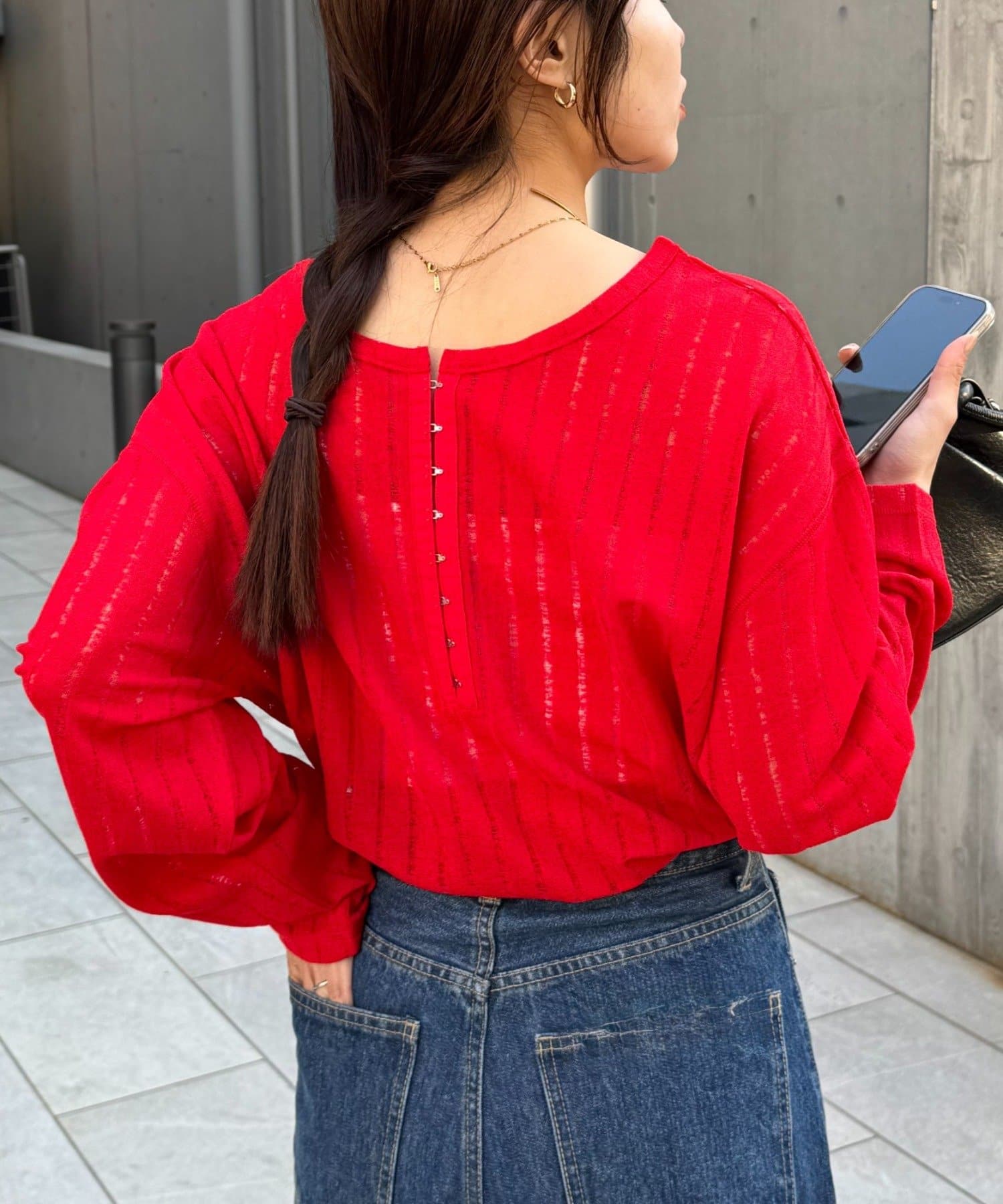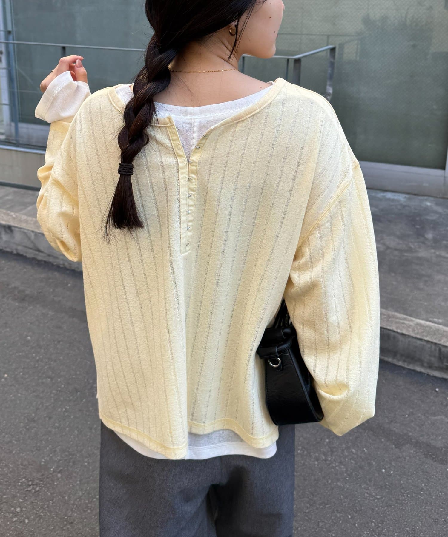 前後どちらも着用できる2WAY仕様で、ホックのヘンリーネックをやや開けて大人っぽく、