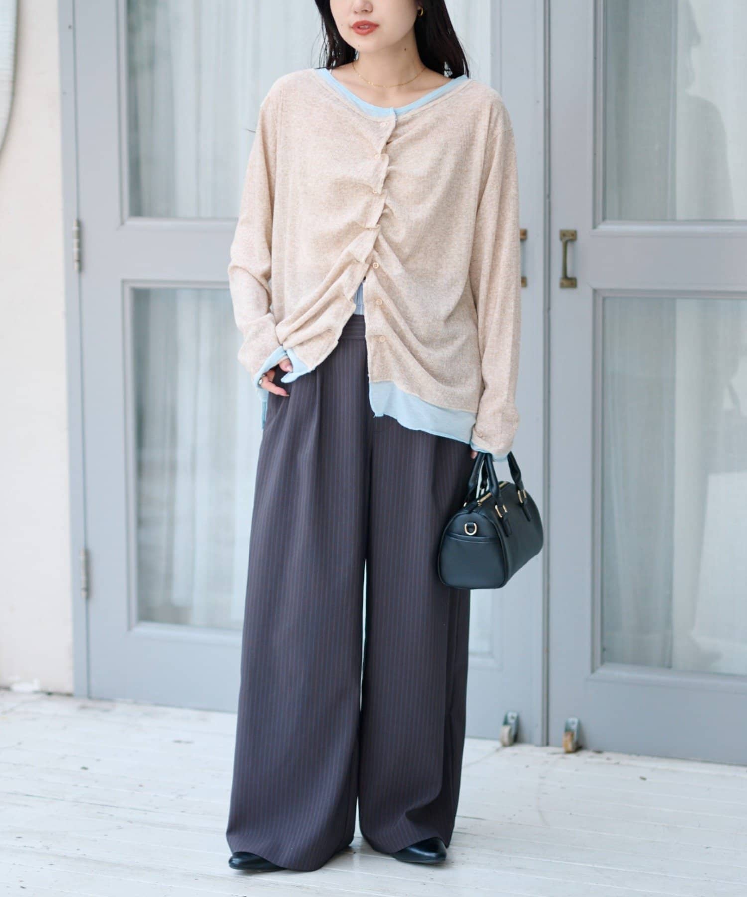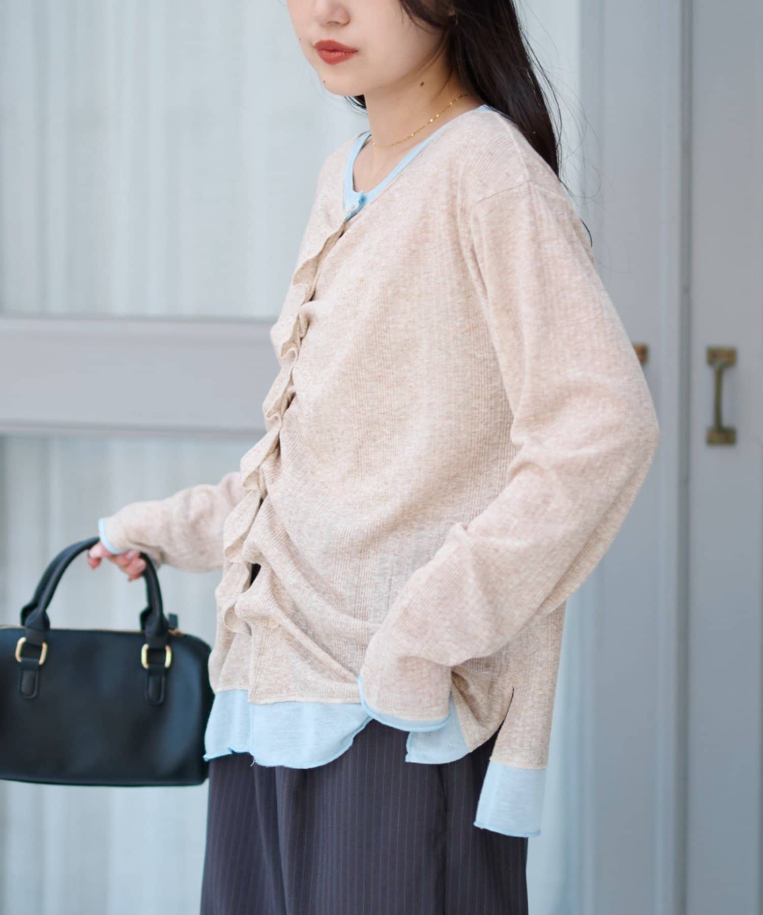 着るだけでレイヤード見えする、首元・袖・裾に生地を重ねた楽ちんカーデ◎