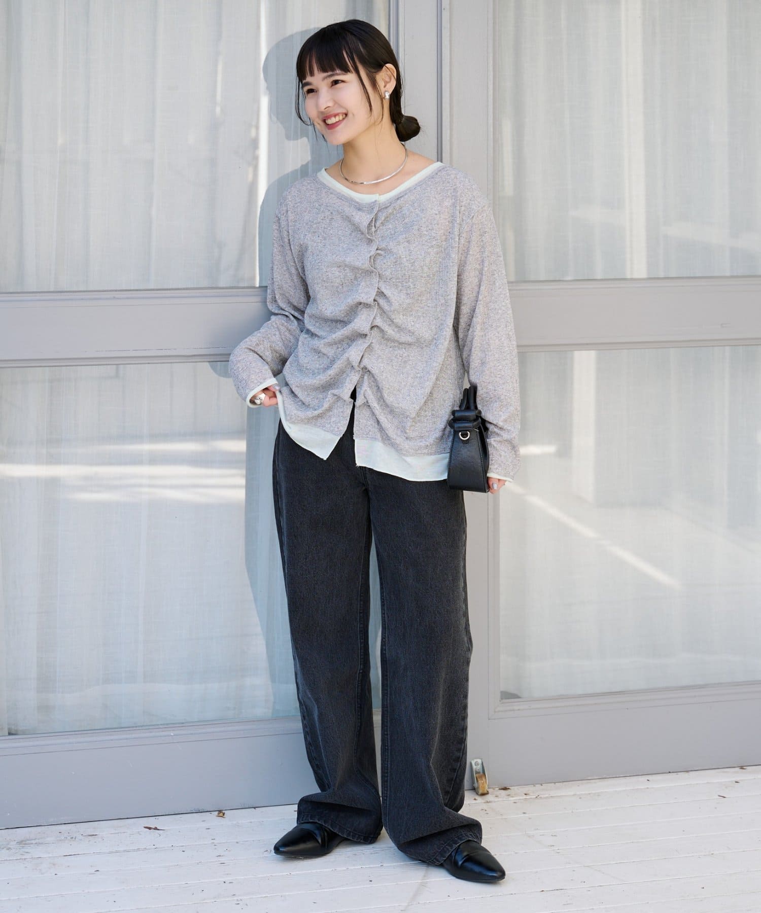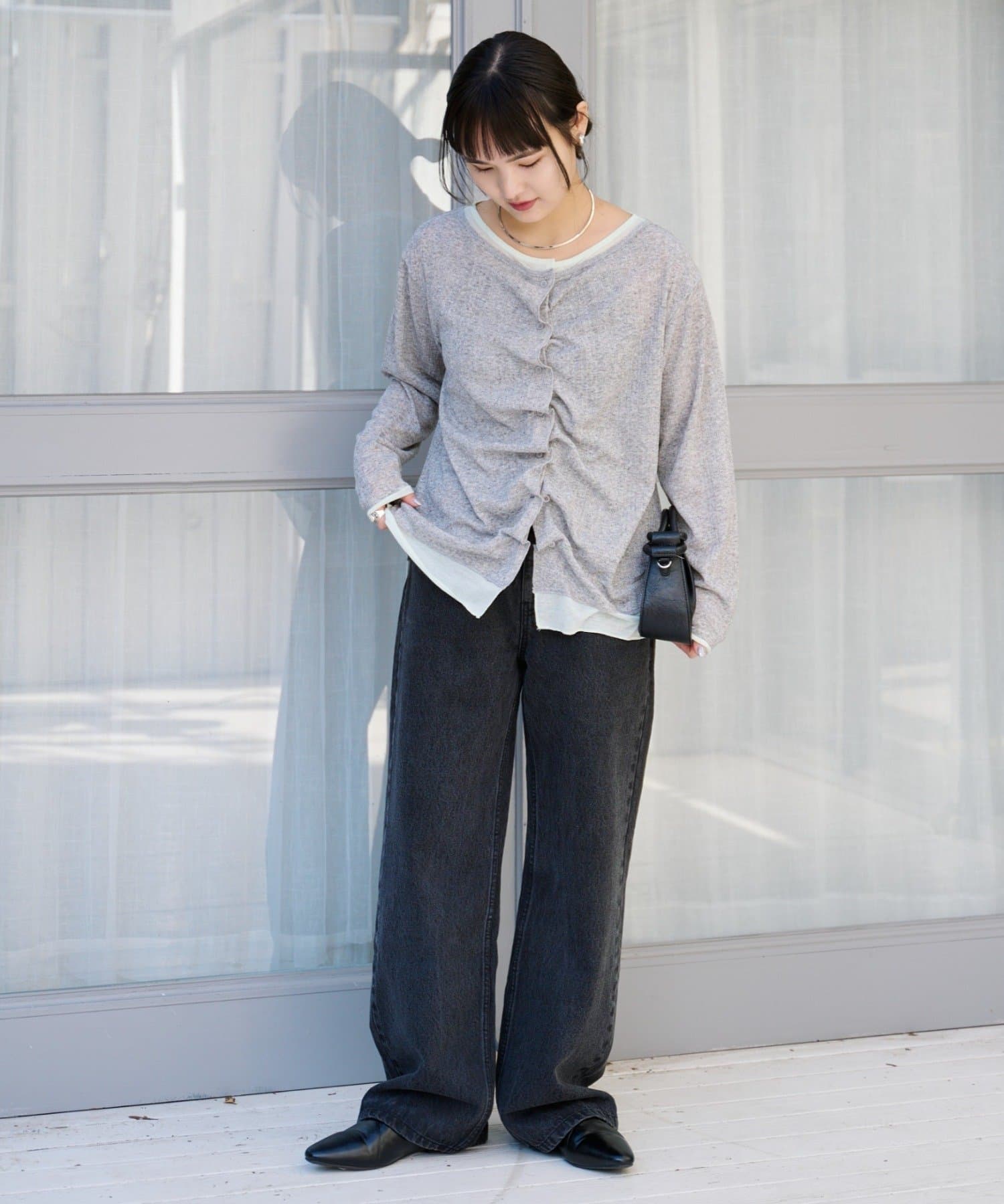 デニムと合わせるだけでも、タックとレイヤード風デザインでお洒落な印象に。