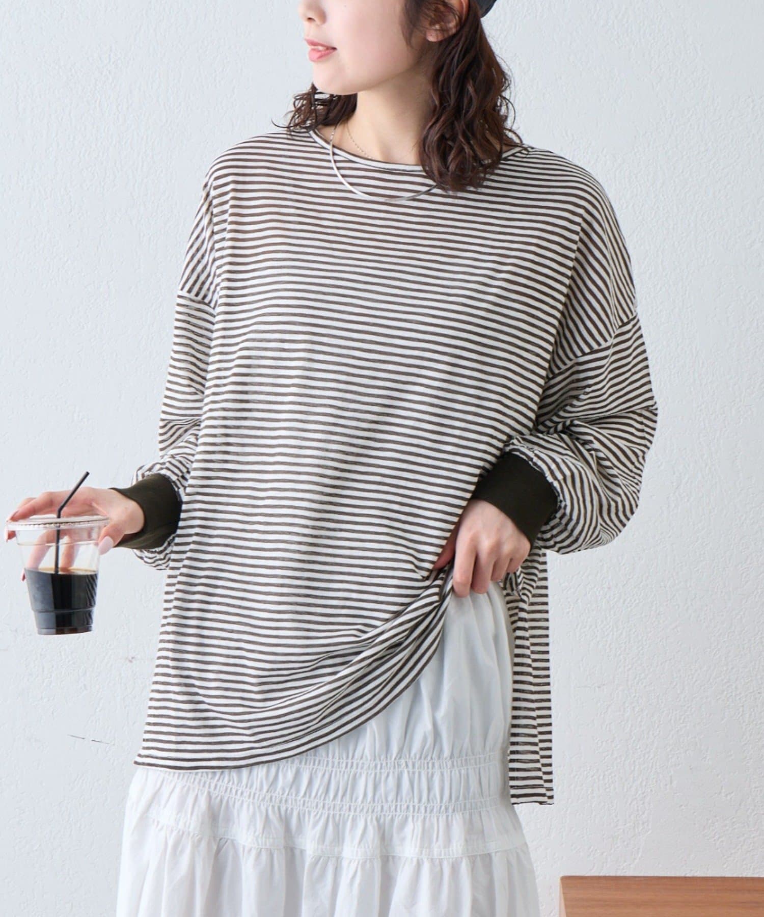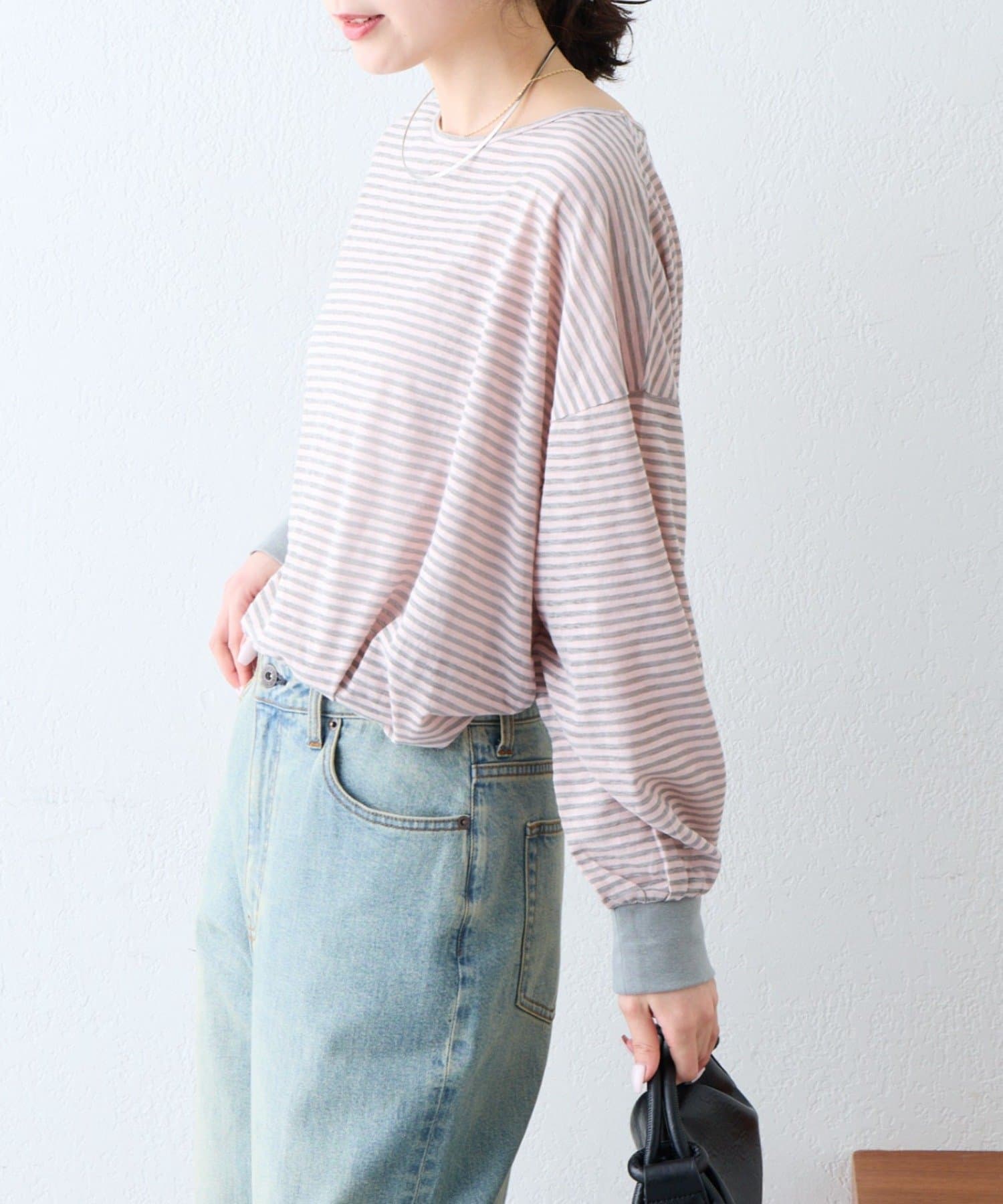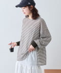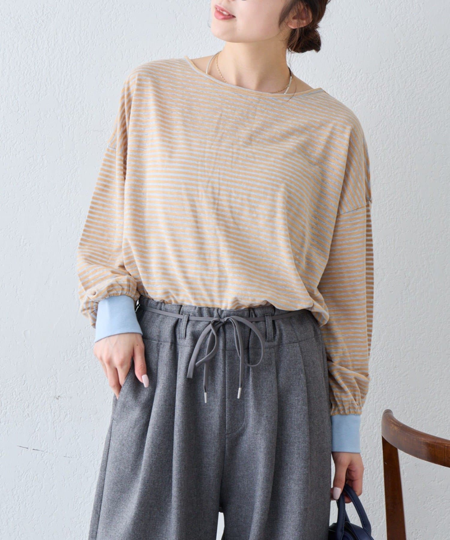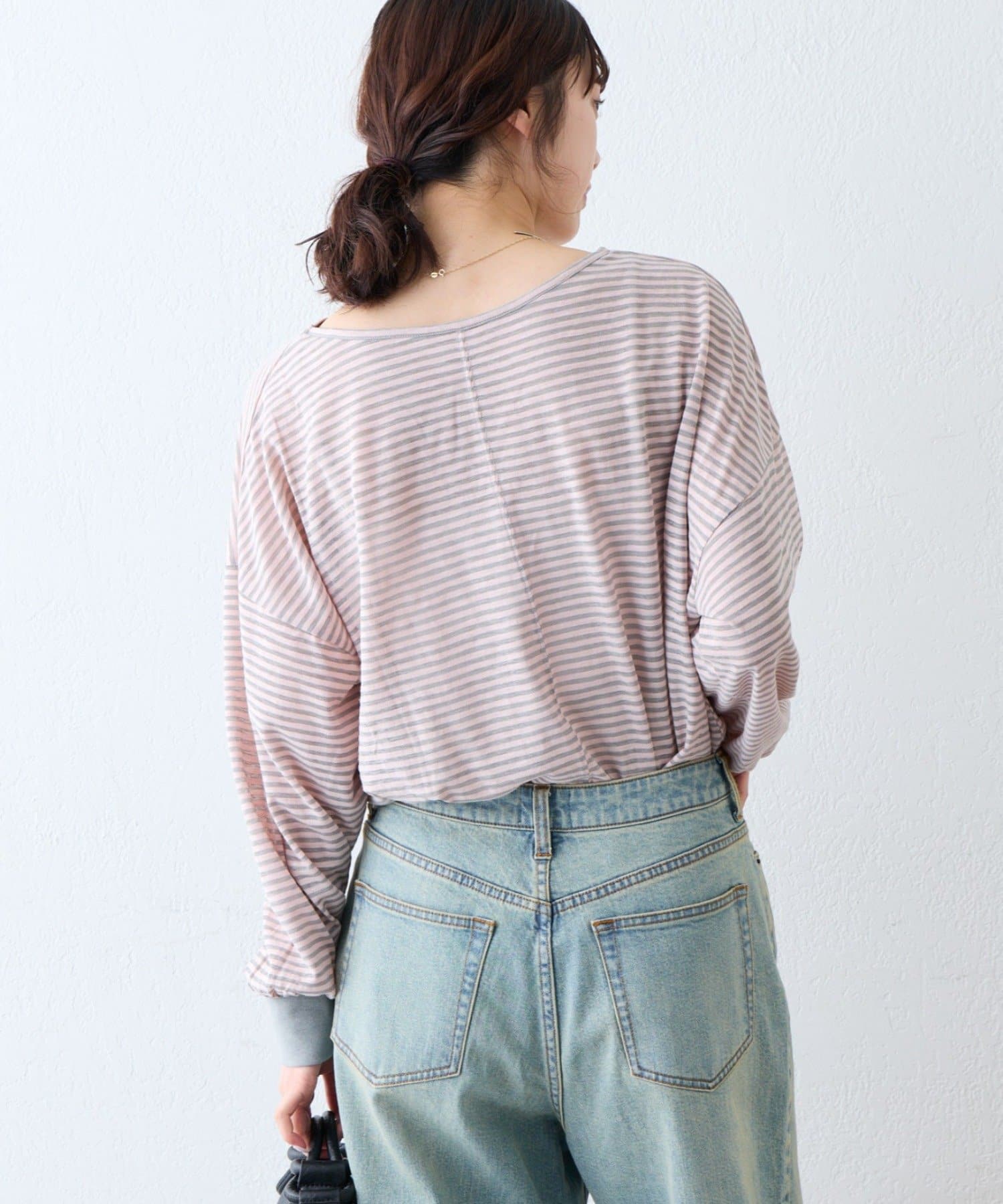 細く淡いコントラストのボーダーがカジュアルすぎず女性らしい印象に。