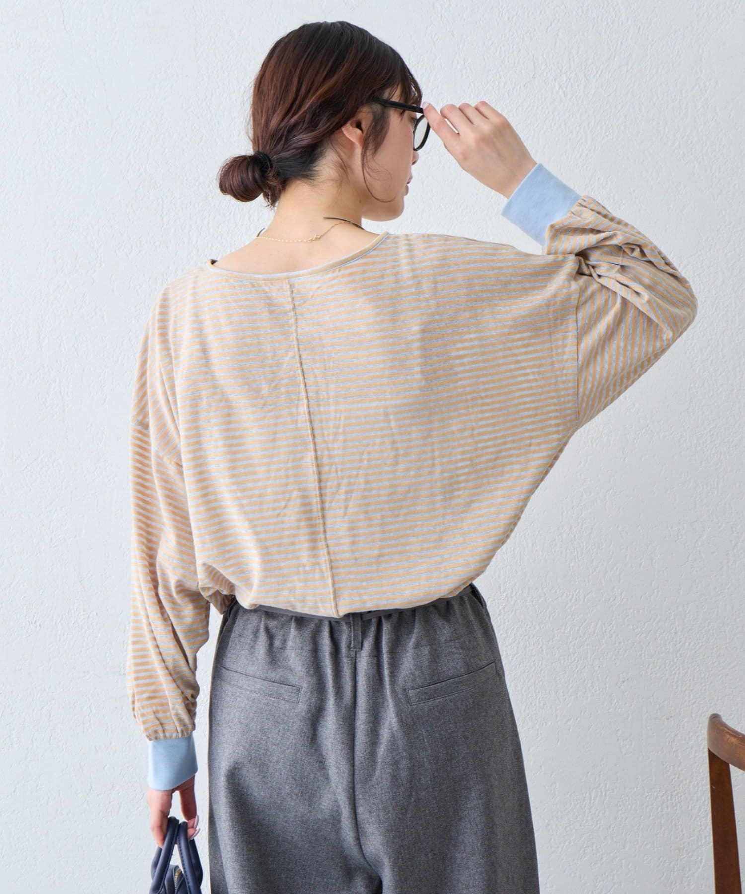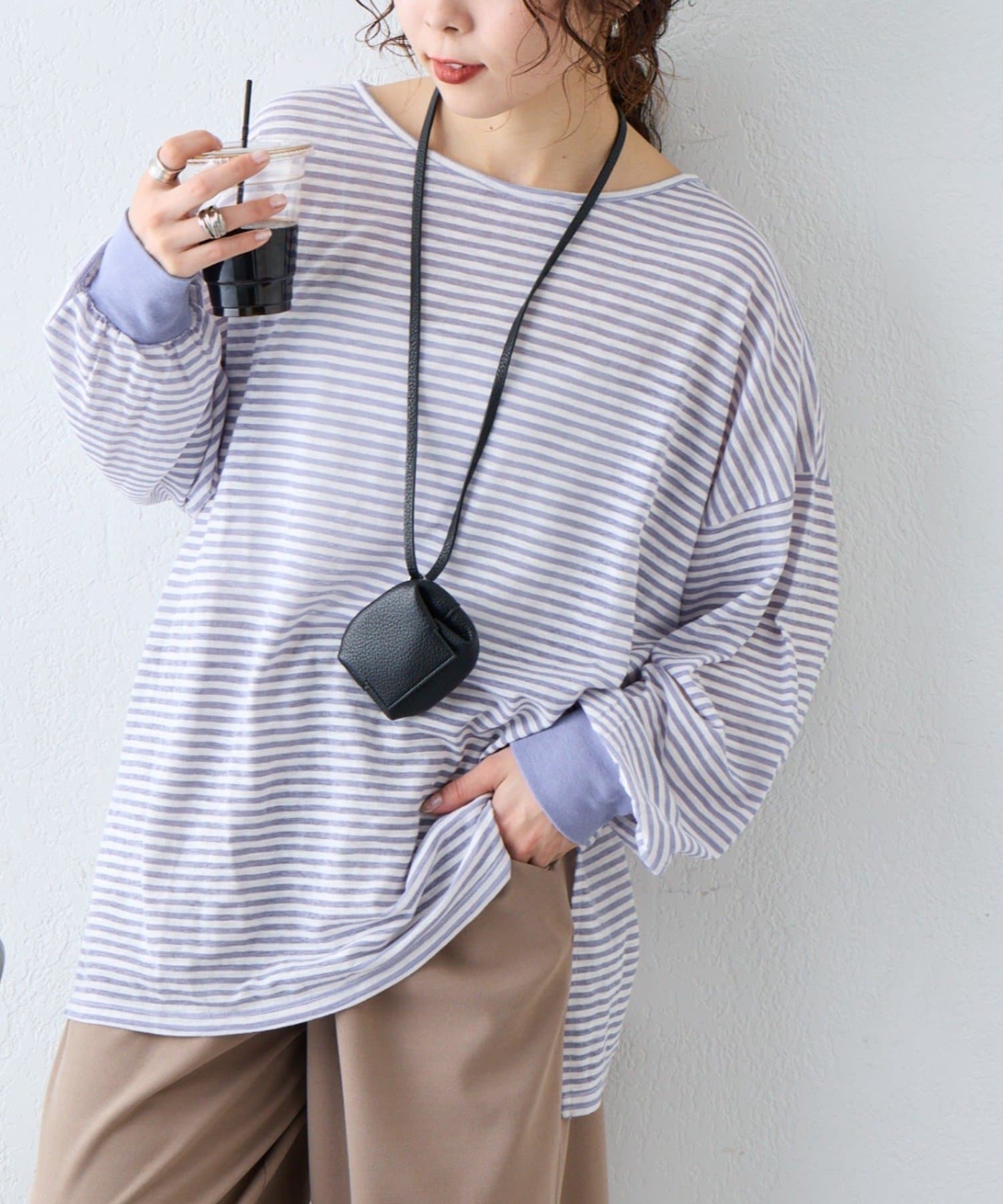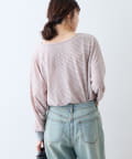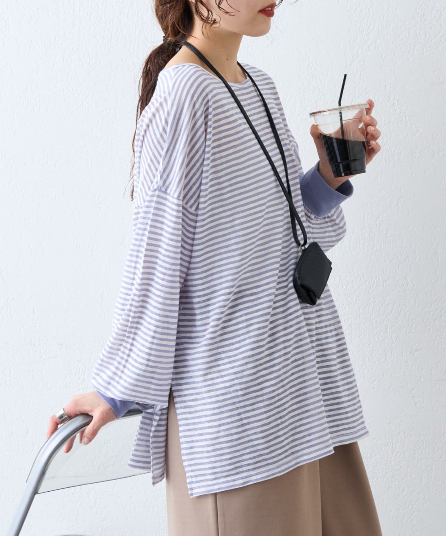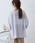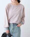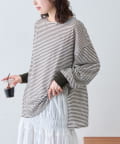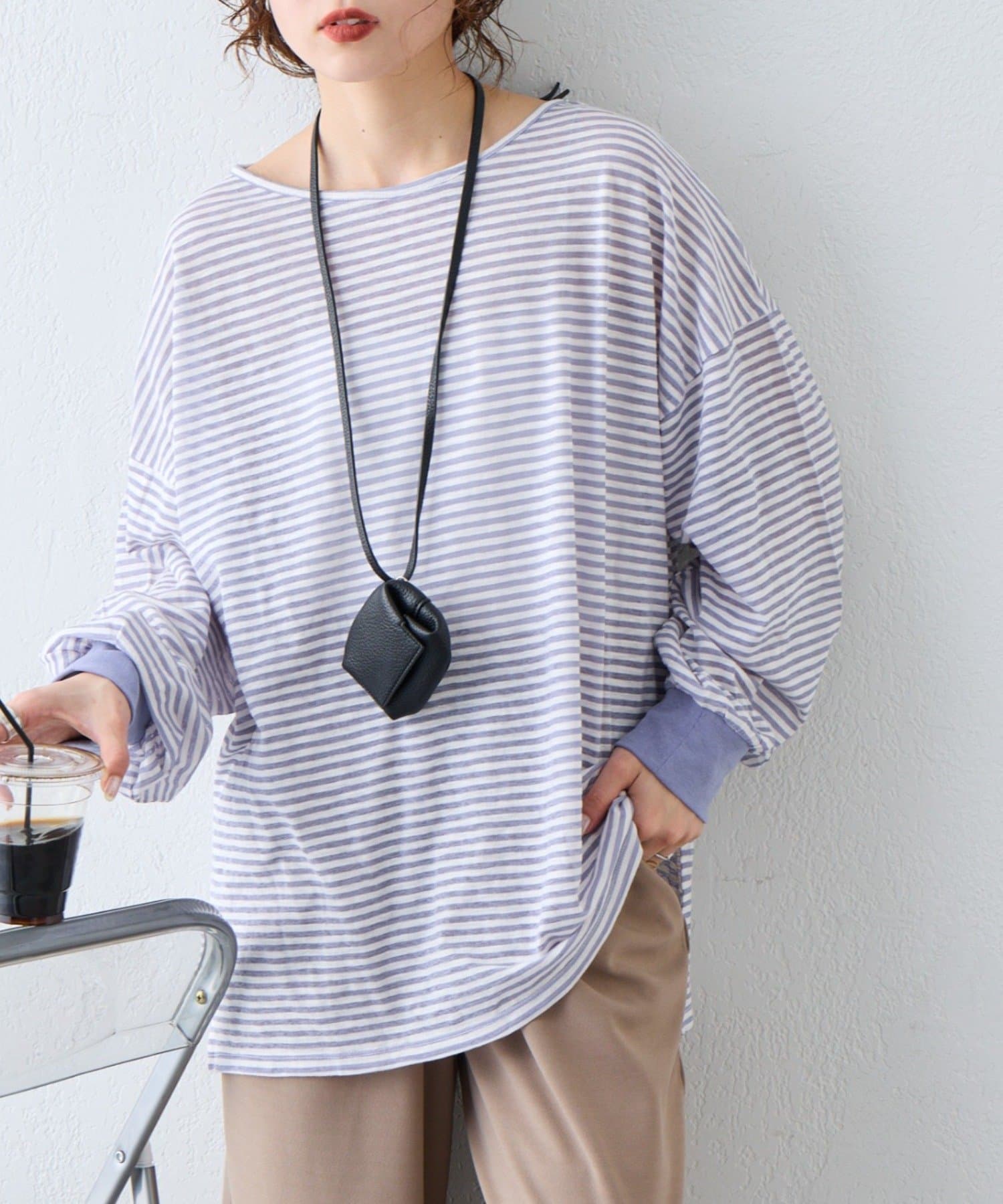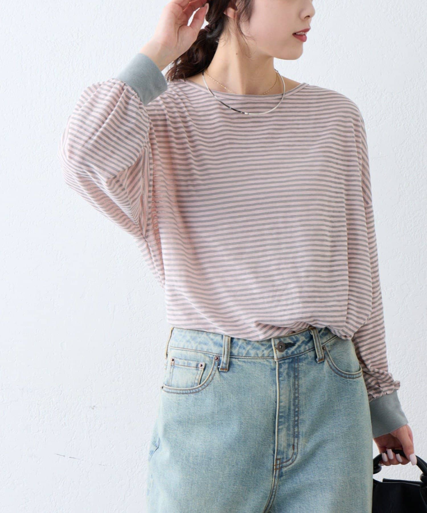 細く淡いコントラストのボーダーがカジュアルすぎず女性らしい印象に。